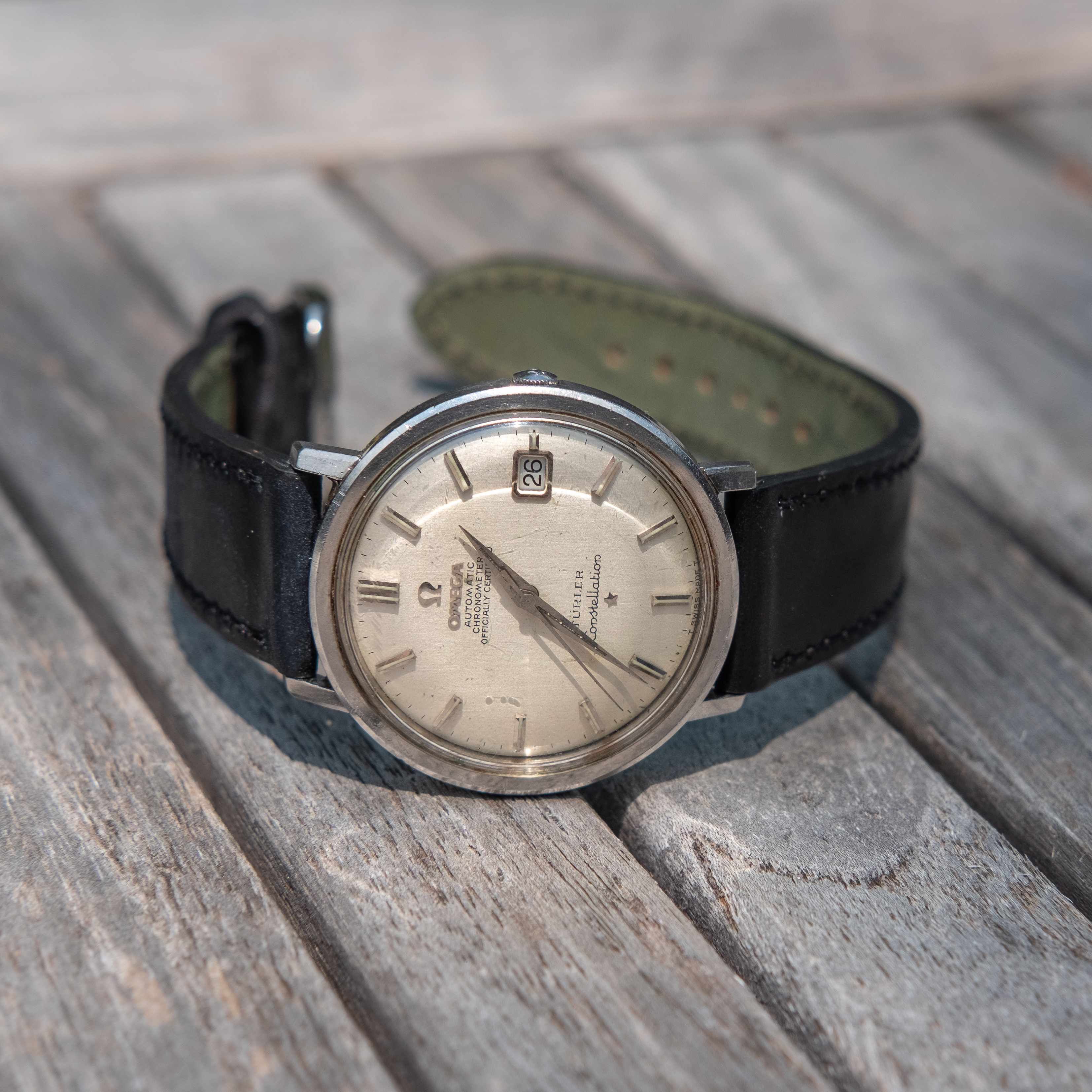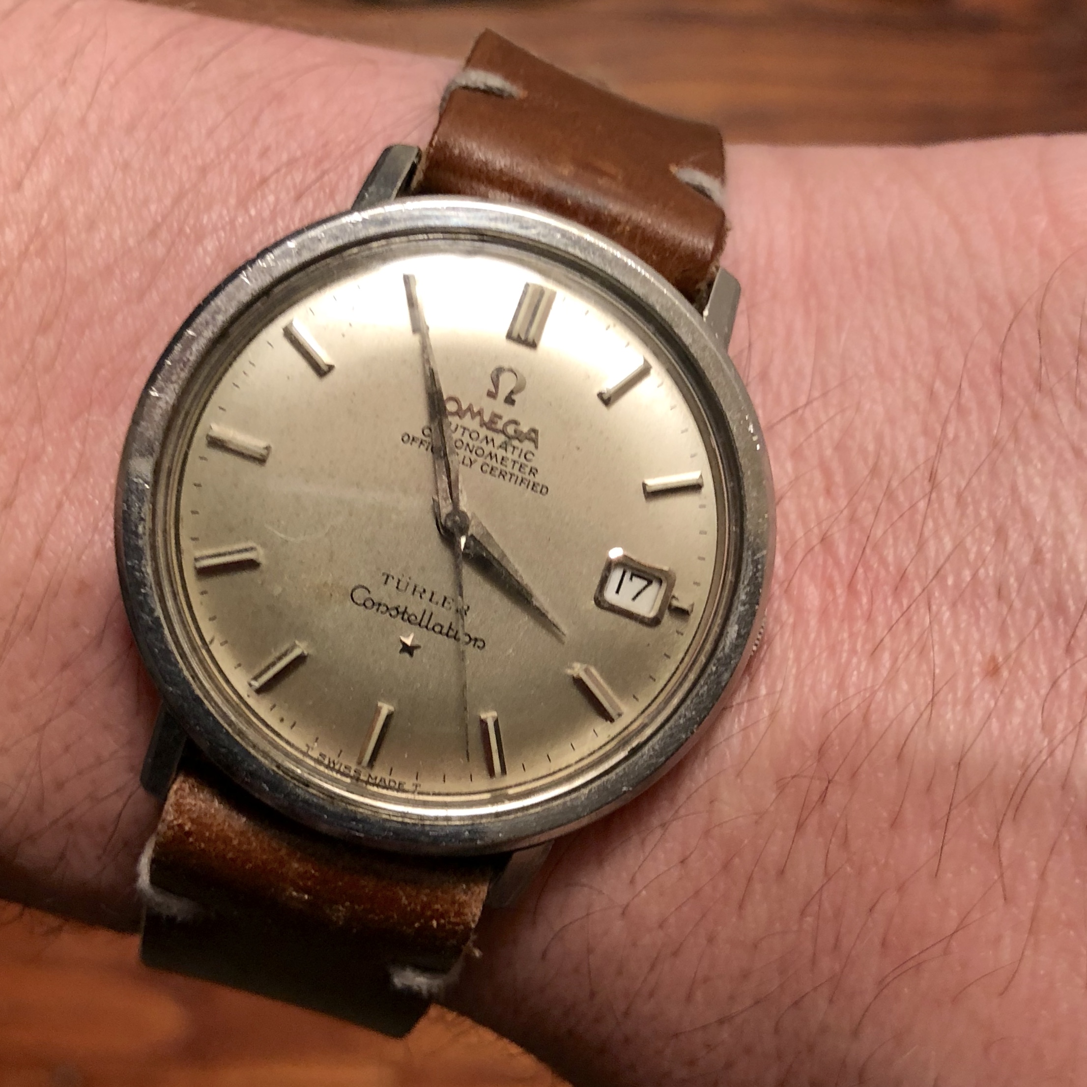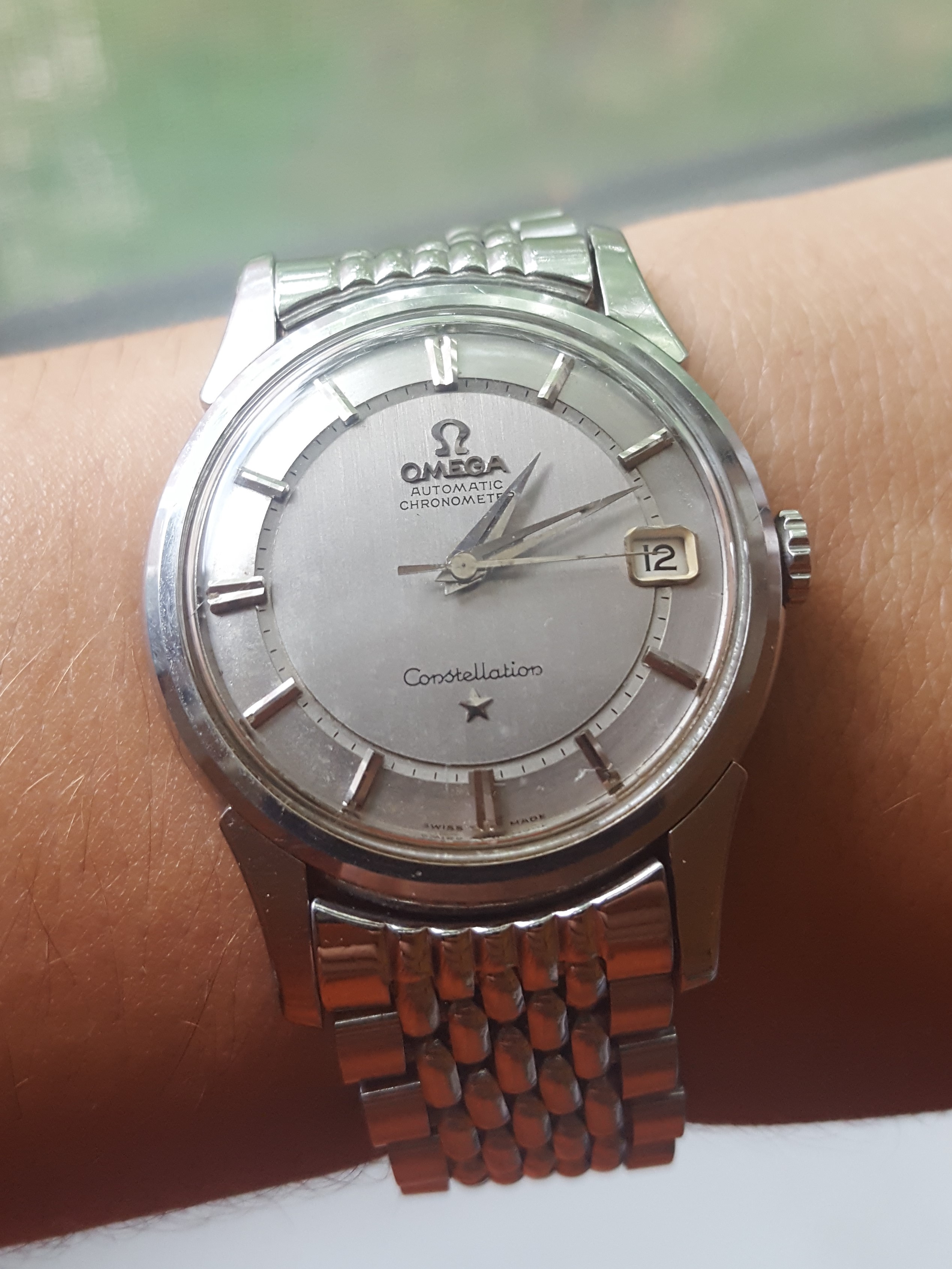·Hi all-- trying to figure out what exactly the hands are made of in my stainless steel Constellation 168.004 (cal. 561) below. The hands match the markers, and are a very pale yellow: much paler than yellow gold, but also noticeably yellower than steel (the dark infill in the photos is degraded radium lume)-- closer to the color of steel though.