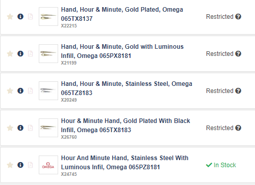 I couldn't find the answer searching through here or on the amazing http://omega-constellation-collectors.blogspot.com. Cousins lists gold plated and stainless steel hands for this reference, while Jules Borel has "White" and "Yellow" ones. I actually have a set of the steel hands and one of the yellow gold second hands and the color of the existing hands and markers doesn't match either one.
