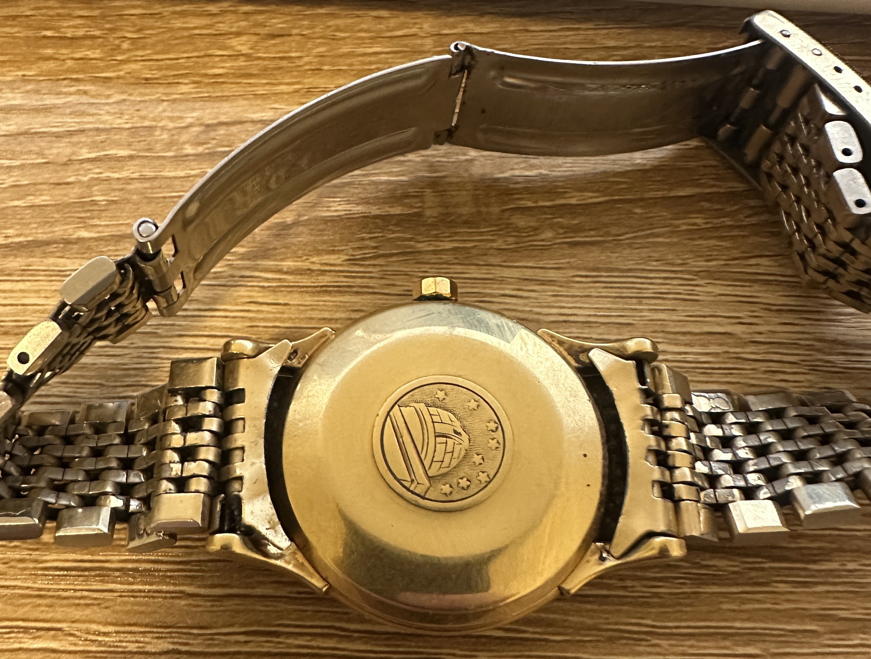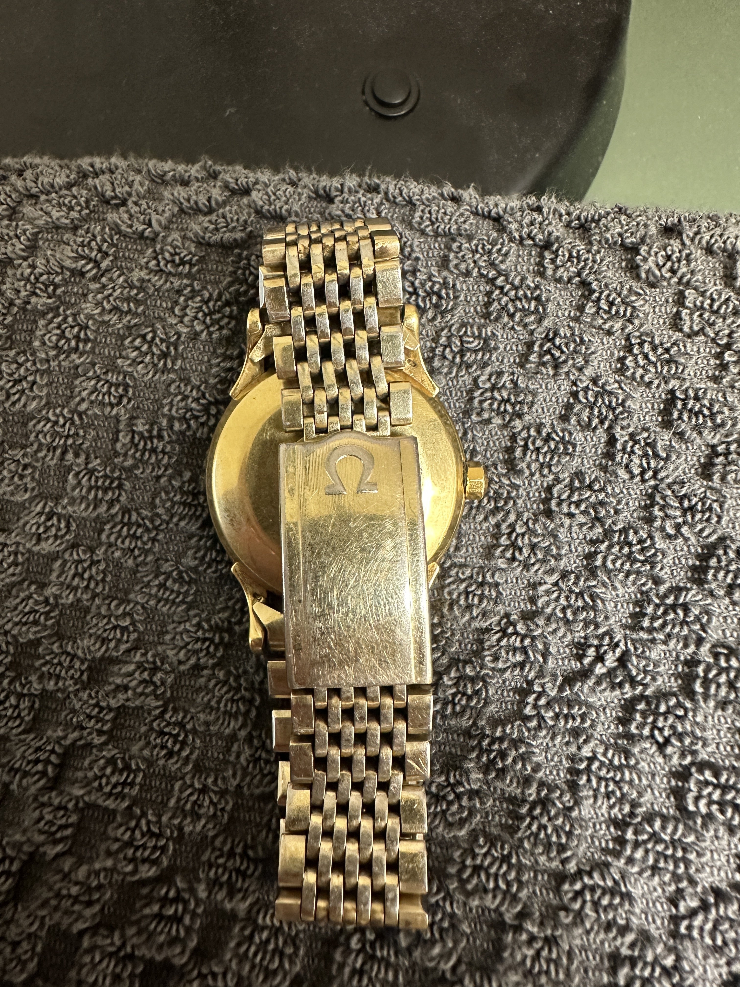 I believe my Grandfather bought it in Jeddah on the Red Sea in the late 50's or early 60's. It was his everyday watch for the next 35+ years so holds a lot of sentimental value to me. I have not opened the case yet so don't know the model or movement but have tried to find it online through google searches of what I know (which isn't much). The closest one I found similar to it was this Omega Constellation Pie-Pan Deluxe Cal.505 18ct Pink Gold 1956 | Vintage Gold Watches. I have struggled to find any other watches that look similar as most others have the words "OFFICIALLY CERTIFIED" and "SWISS MADE" printed on the face (which mine does not). Based on the weight of the watch I believe the case is gold. Is anyone able to confirm any of this or tell me any more details about this watch? Note, I realise that all will be revealed when I take it in for service and the back is removed but still curious to find out more before then.