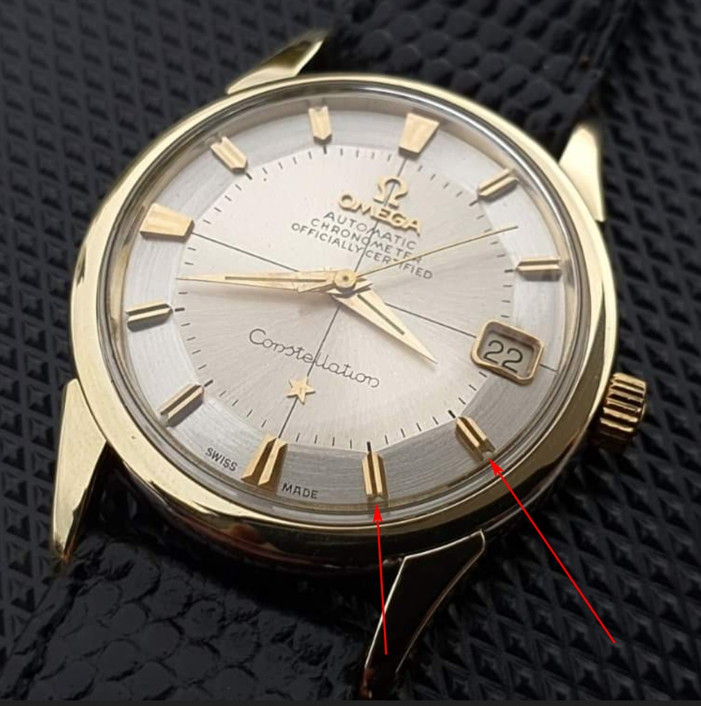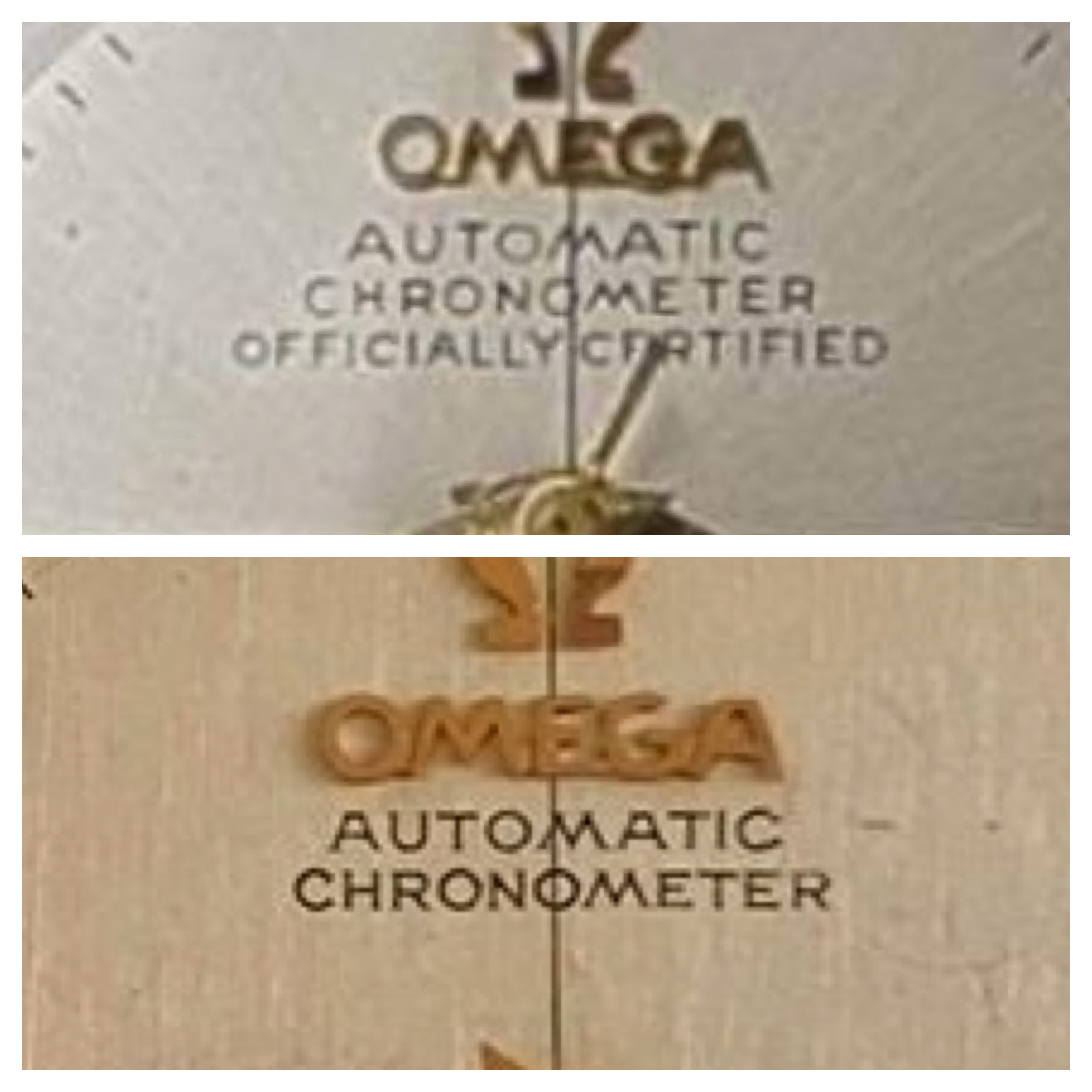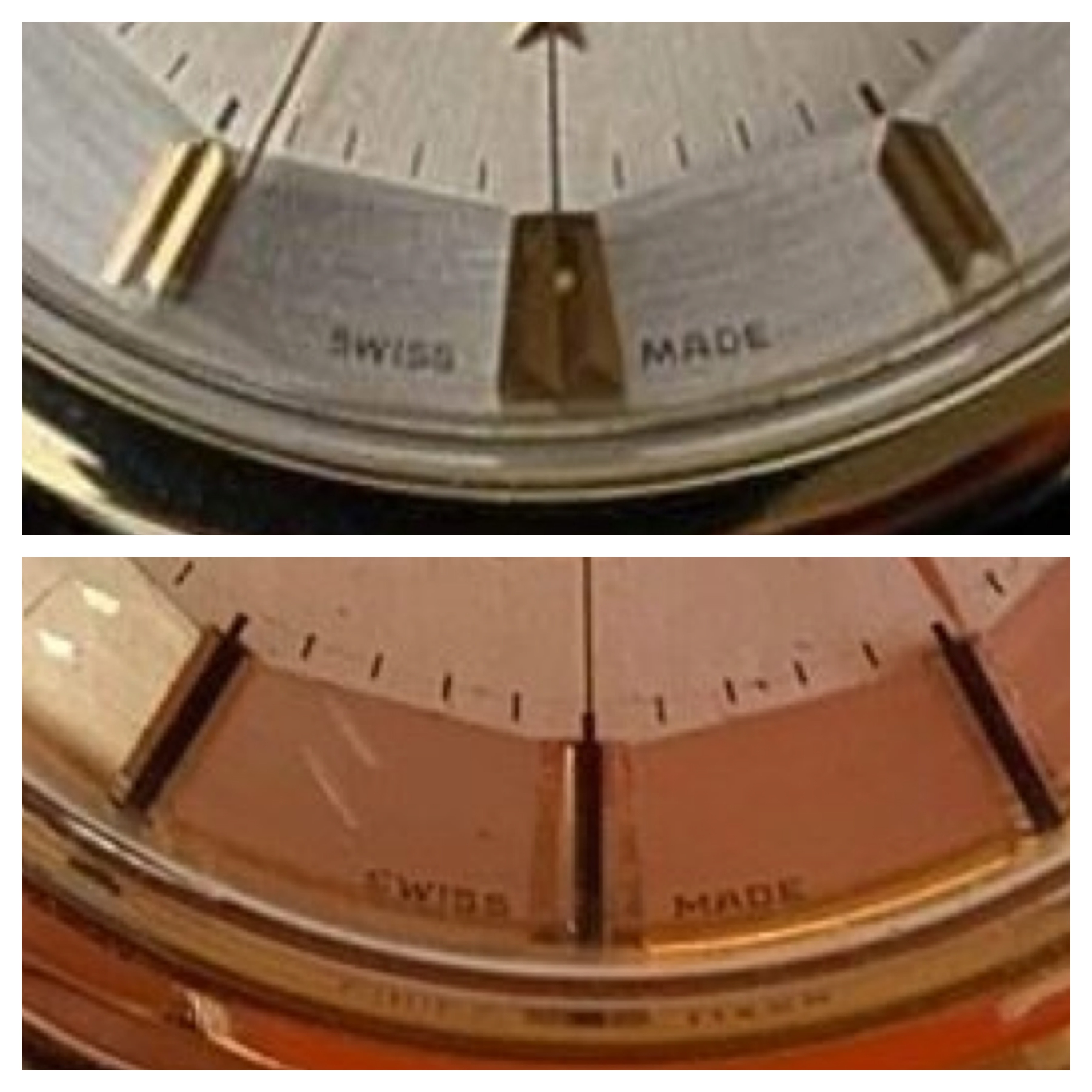 2. Positioning of Swiss Made, length of minute ticks. Note that original dials have thicker minute ticks every 5 minutes through which the thinner cross hair is drawn. There is no such thicker tick at 30min of the redial.