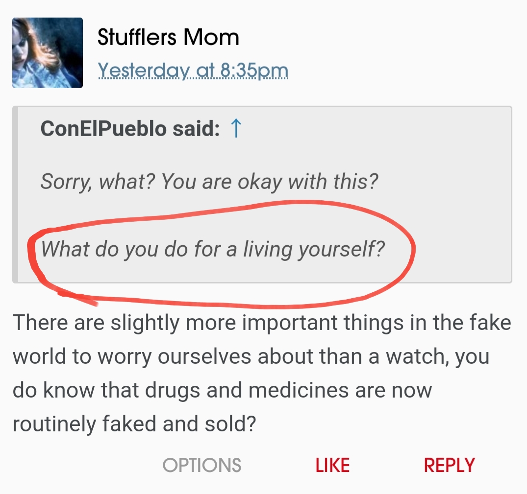 Not having the mental faculties to care about fake watches because more directly critical items are being faked too is a worry - perhaps you should spend less time discussing issues where you are so much in the wrong that it is an embarrassment and more time resting and preparing yourself for more mundane tasks would be a good idea.