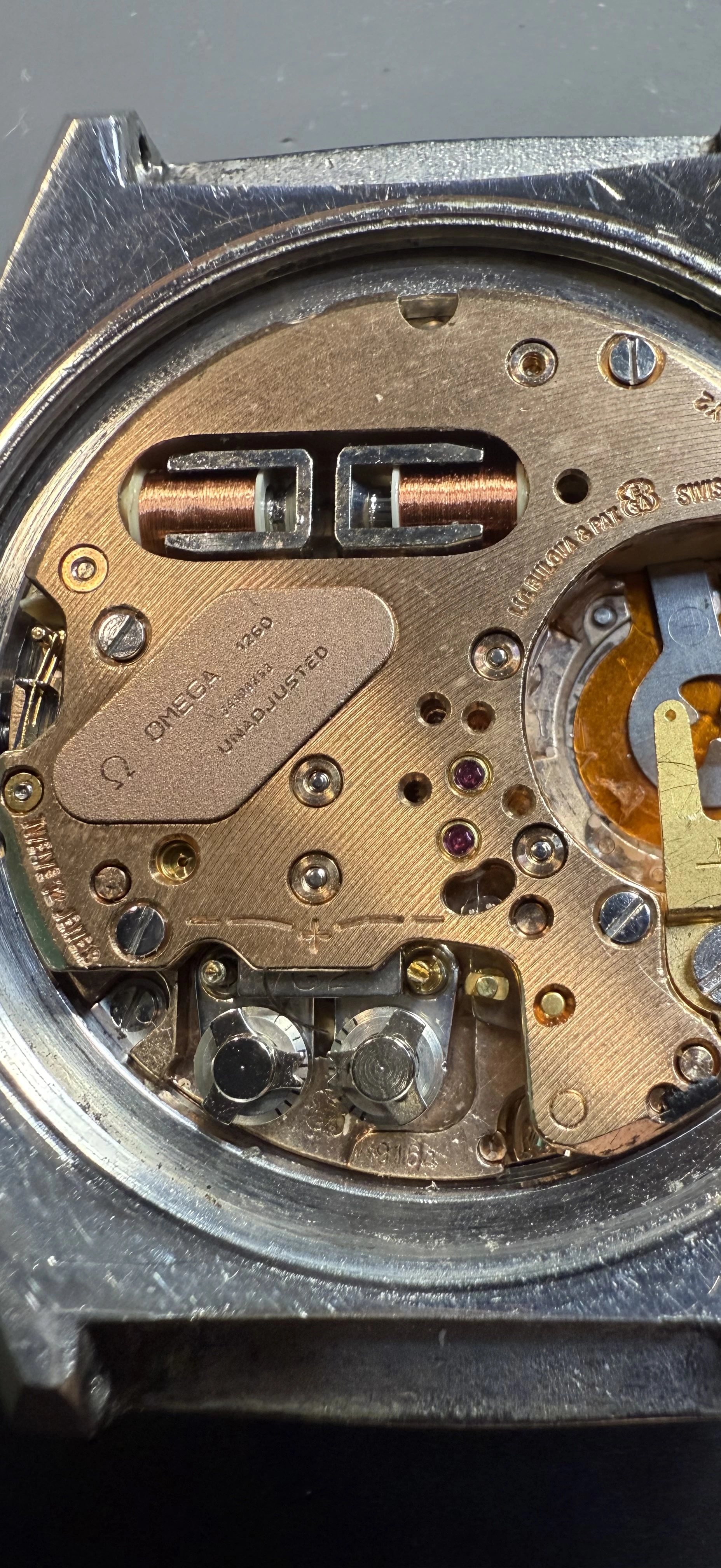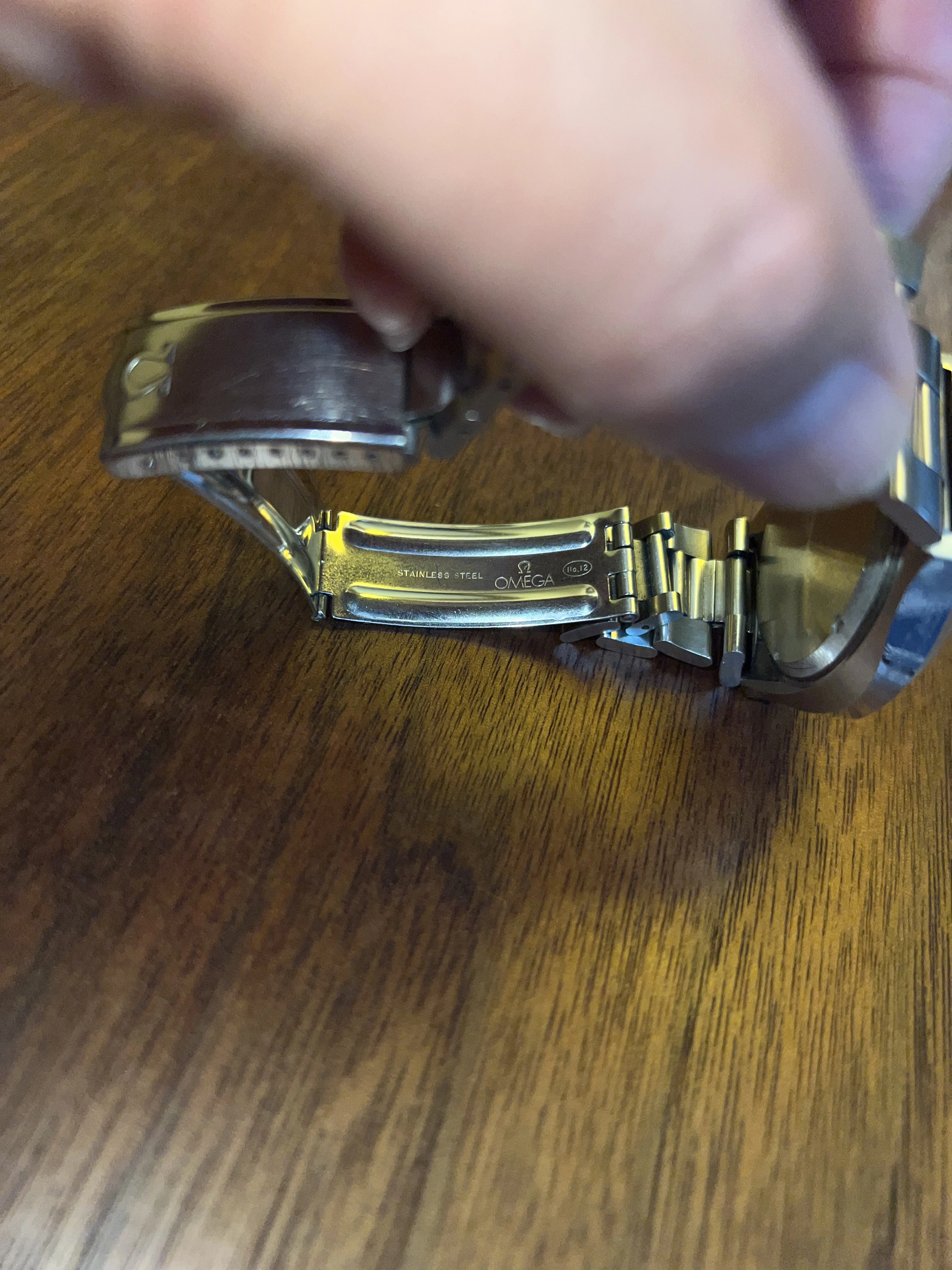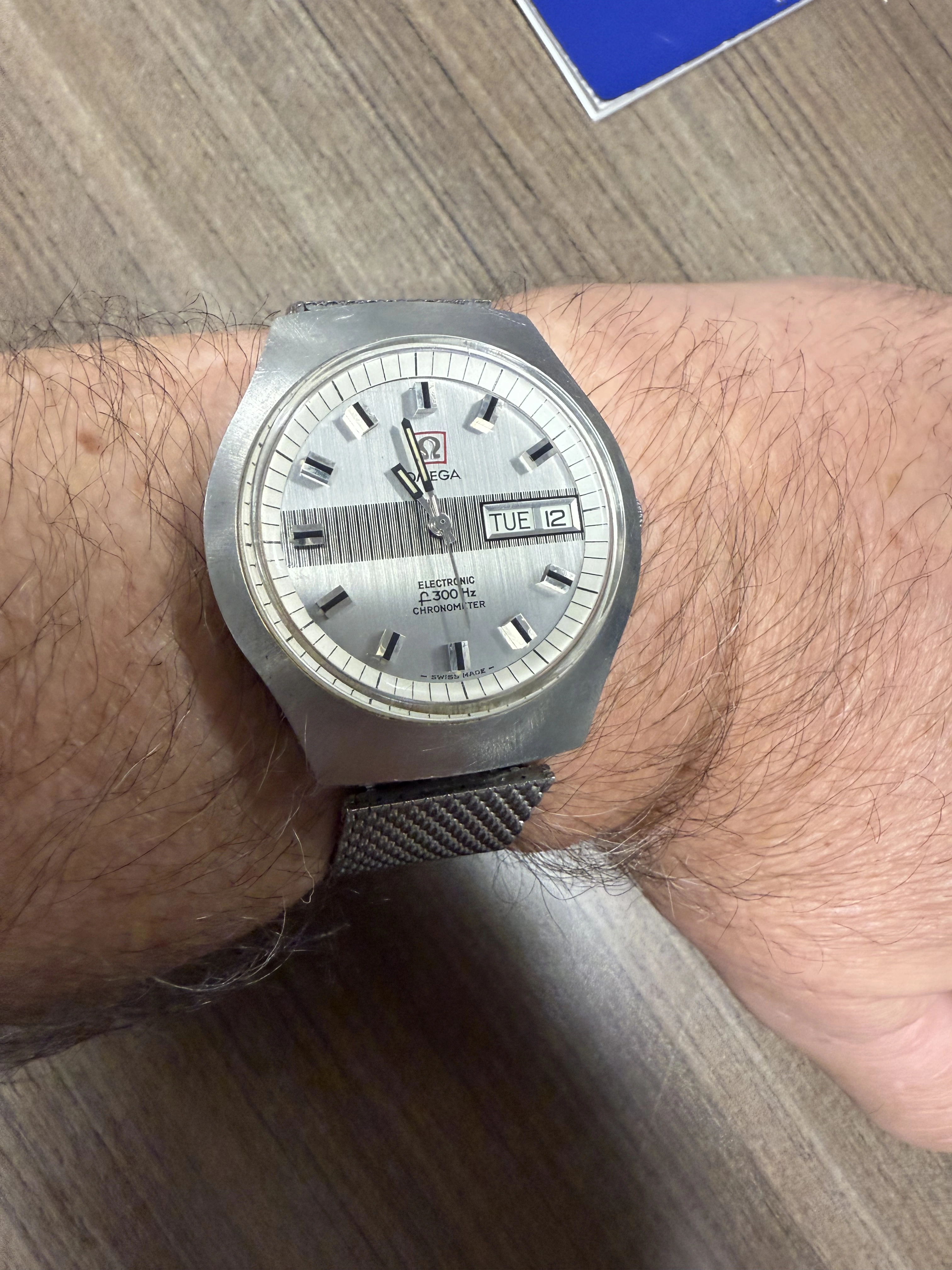 I rescued this from Facebook Marketplace. Originally $300 but after seller put a battery in and it didn't run he reduced it to $ 150 and I snapped it up. It was a roll of the dice for sure as I understand parts (coils especially) are spendy. Anyway I got home and put a battery in (that I knew to be correct and put in correctly)it didn't run BUT it did hum! So I sent off for service and bingo, a tuning fork Omega for $$350! What is the correct band for this? The one on there is one I stole from another watch. 20 mm hooded lugs. The scratches were not done by me. Thanks!