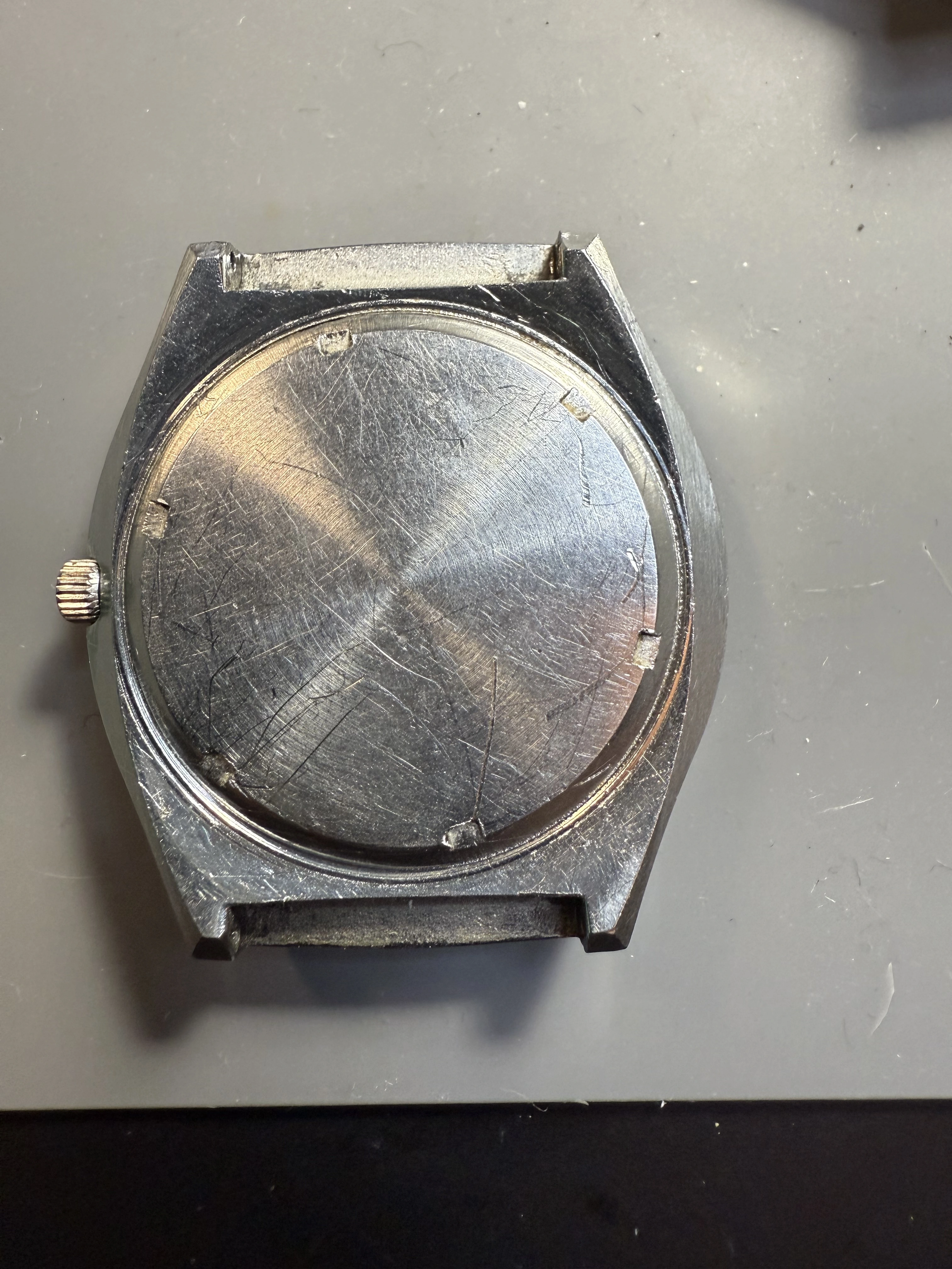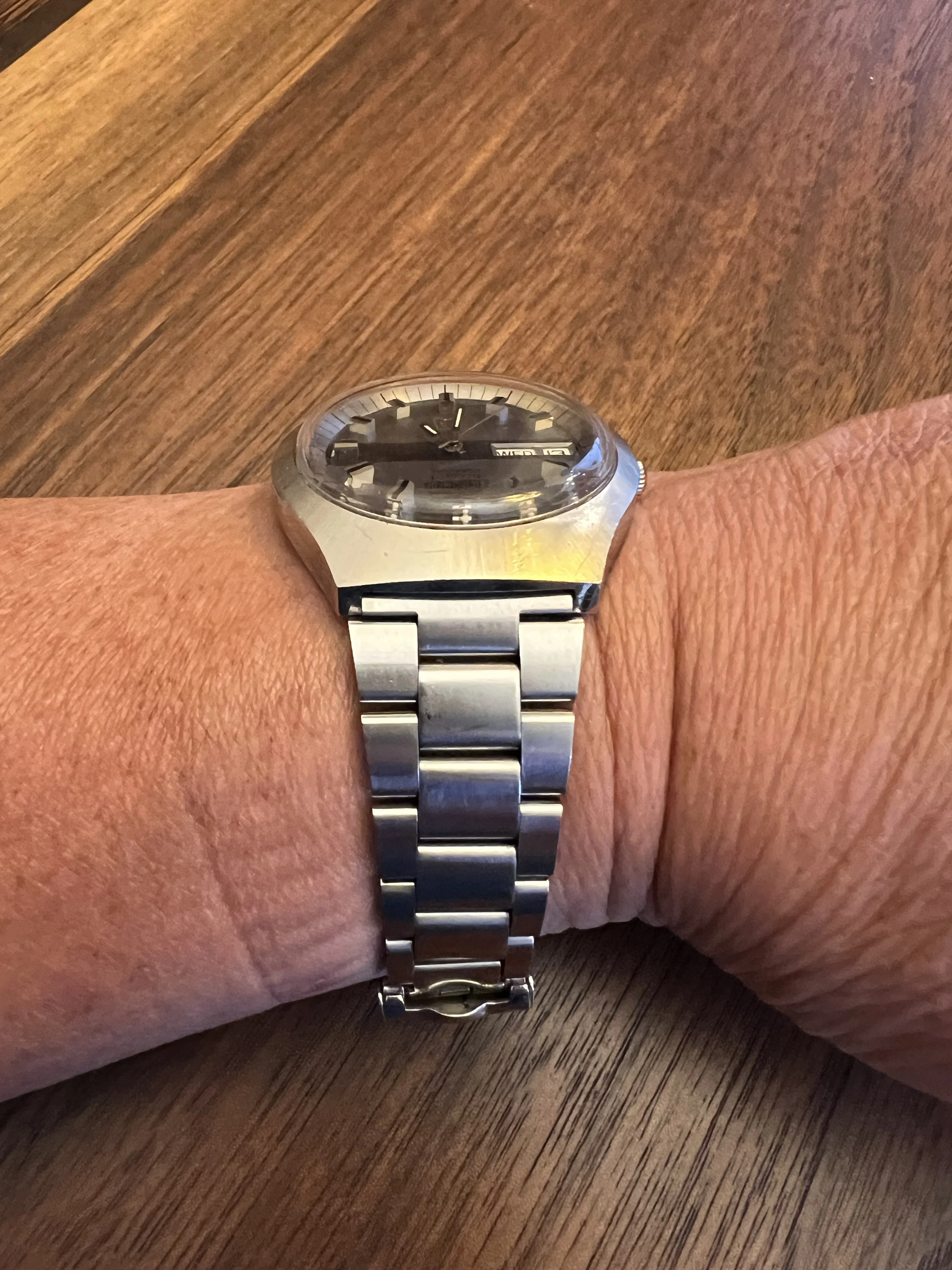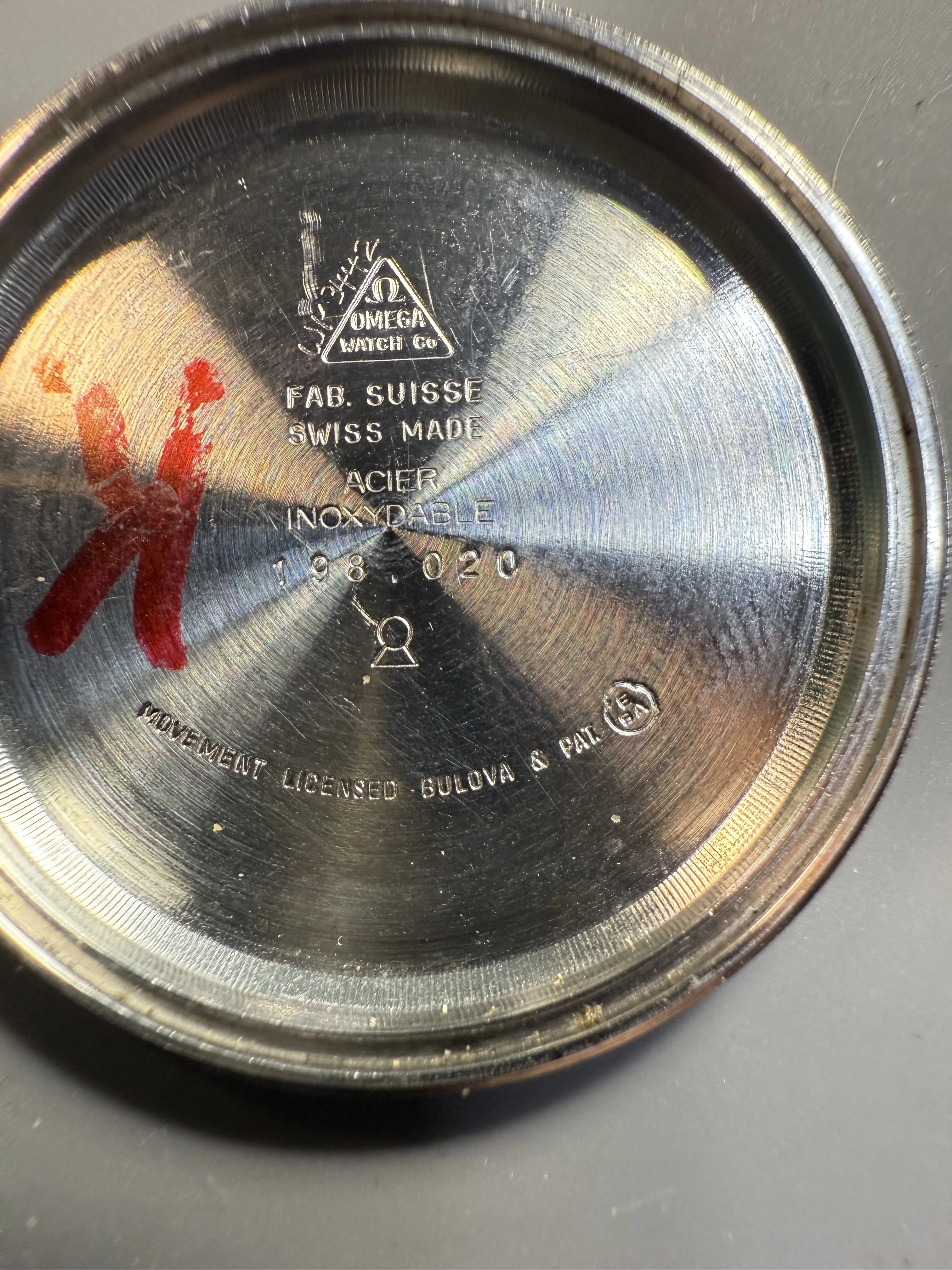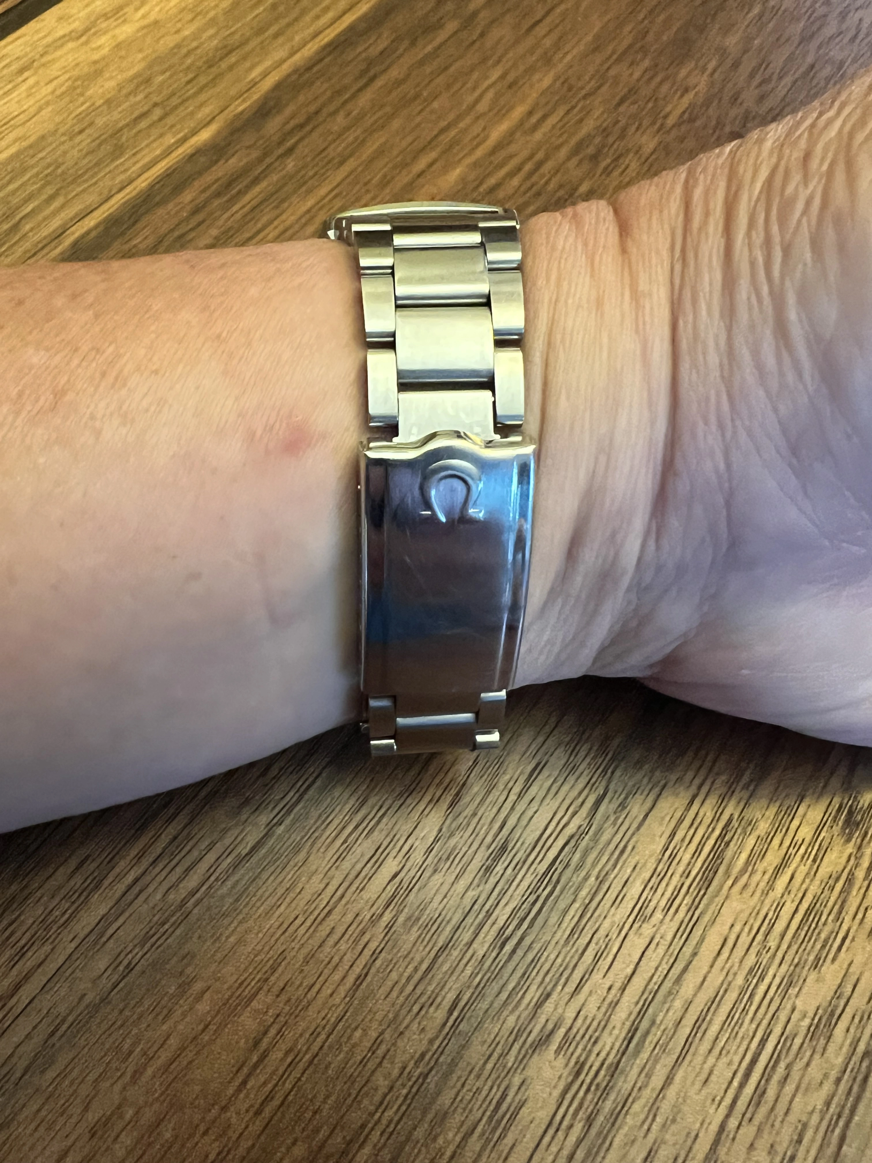 I rescued this from Facebook Marketplace. Originally $300 but after seller put a battery in and it didn't run he reduced it to $ 150 and I snapped it up. It was a roll of the dice for sure as I understand parts (coils especially) are spendy. Anyway I got home and put a battery in (that I knew to be correct and put in correctly)it didn't run BUT it did hum! So I sent off for service and bingo, a tuning fork Omega for $$350! What is the correct band for this? The one on there is one I stole from another watch. 20 mm hooded lugs. The scratches were not done by me. Thanks!