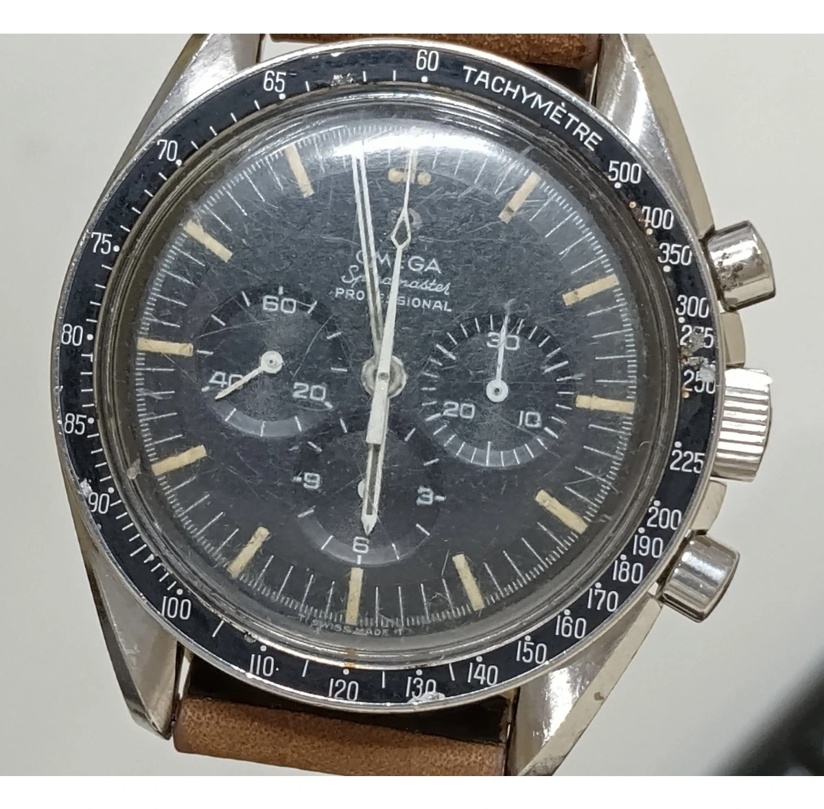 The tritium hands have gone black which to my understanding indicates mold, but the tritium on the dial is tan. The condition of the dial itself is hard to access due to a very scratched hesalite.
