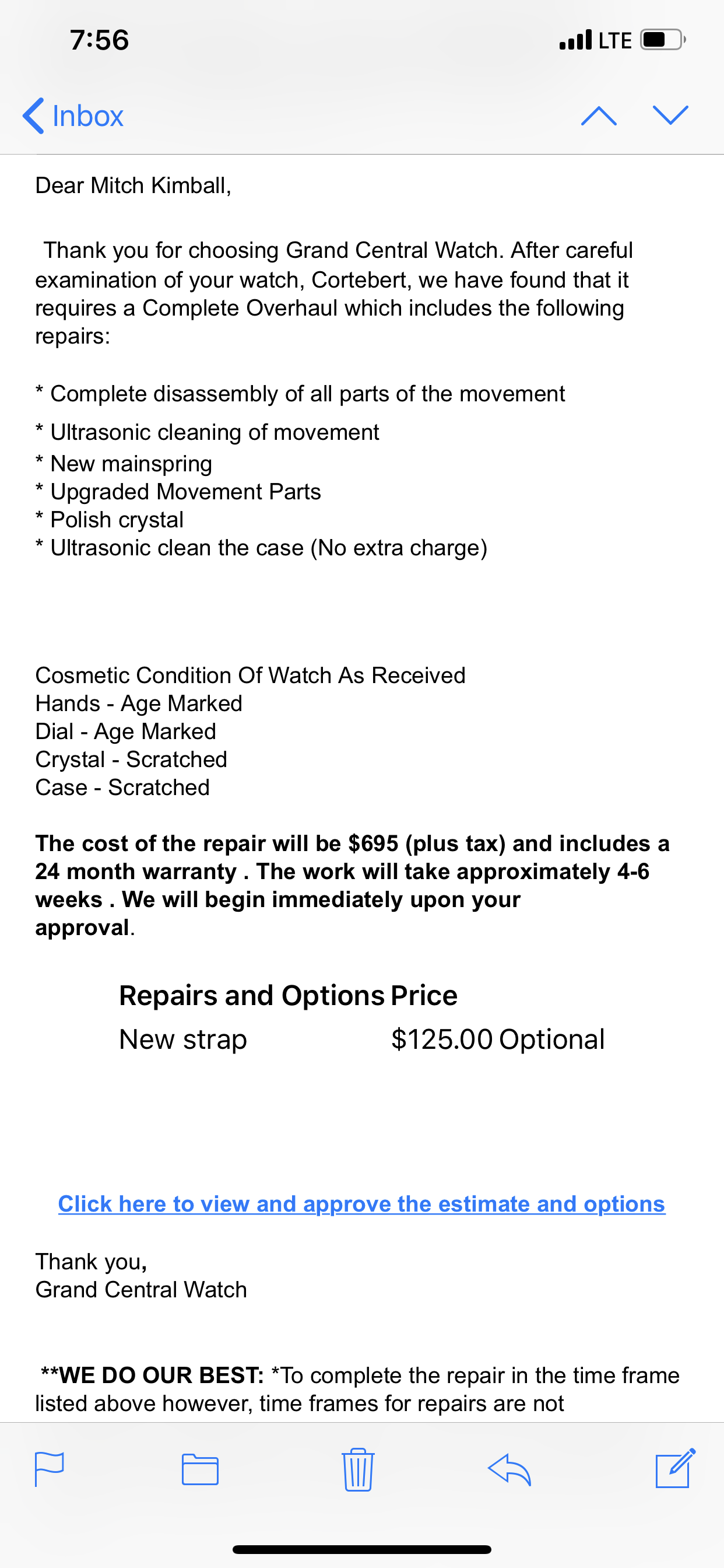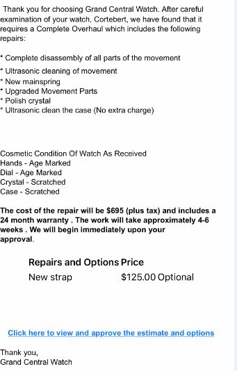 Upgraded movement parts! What a joke! A quote of $695.00? What a joke! Collusion between the guy who bought the watch, and some “watchmaker” who stands to gain in the sham. Why not take the watch back and re-sell it to someone honest.