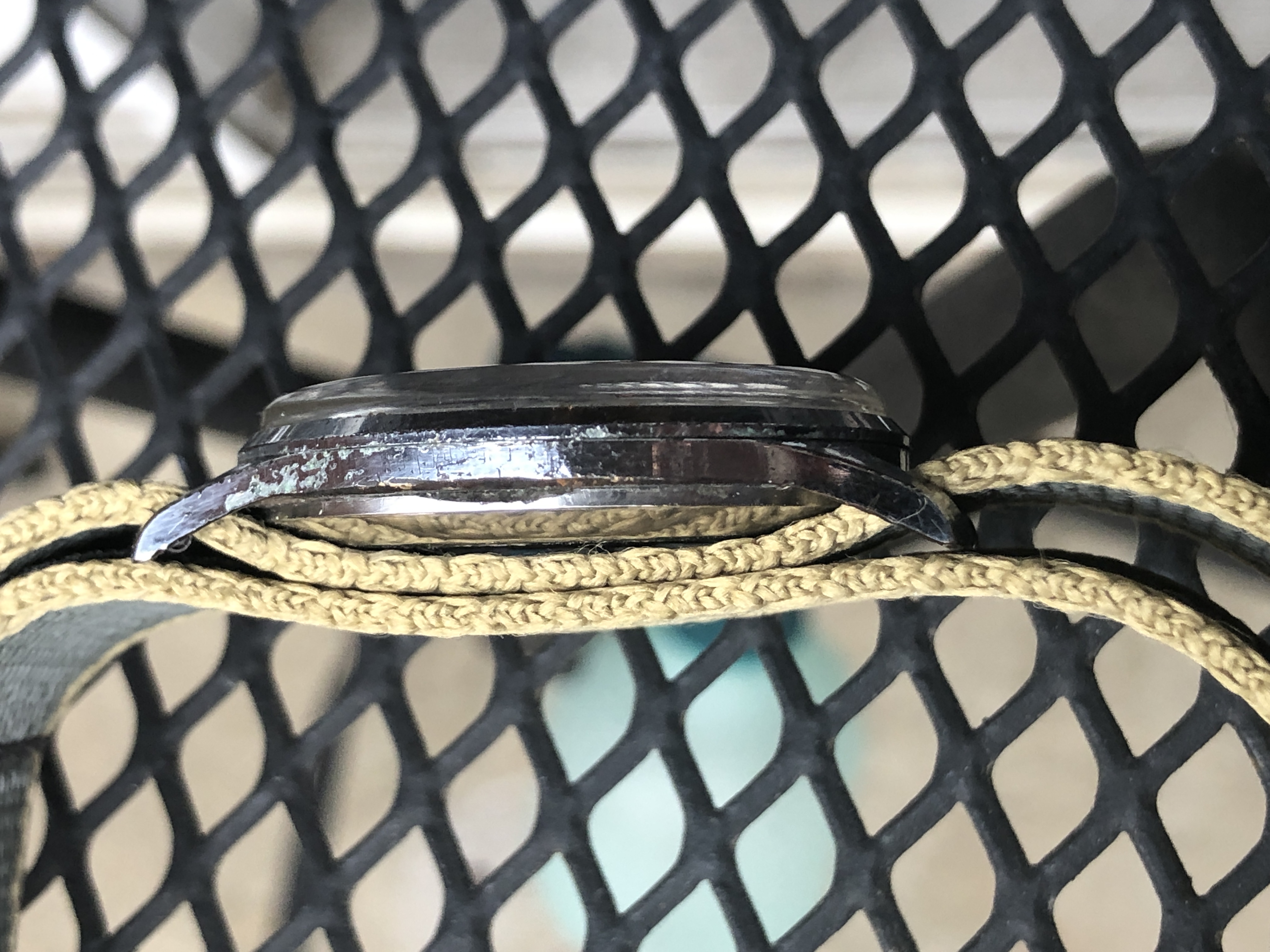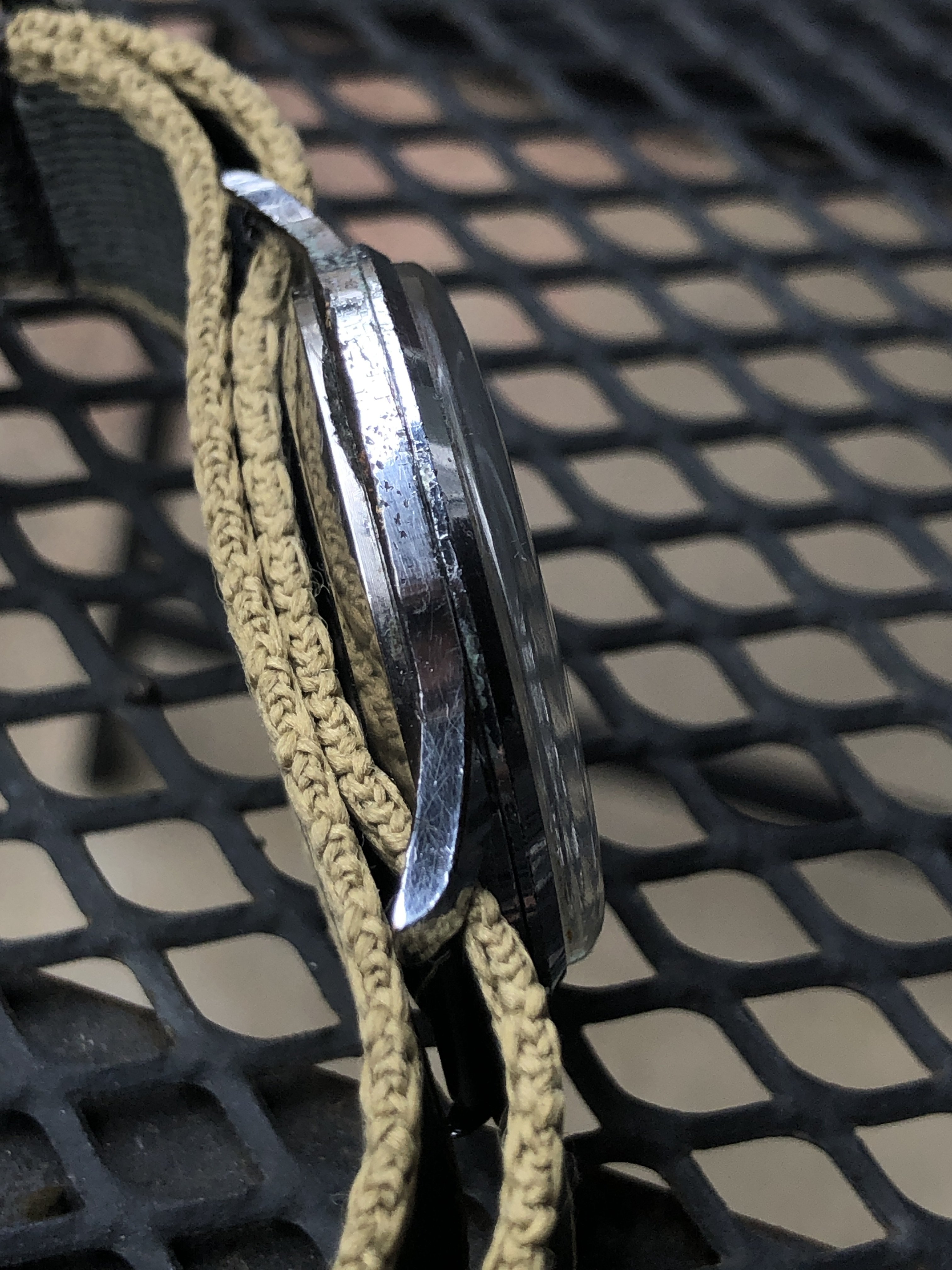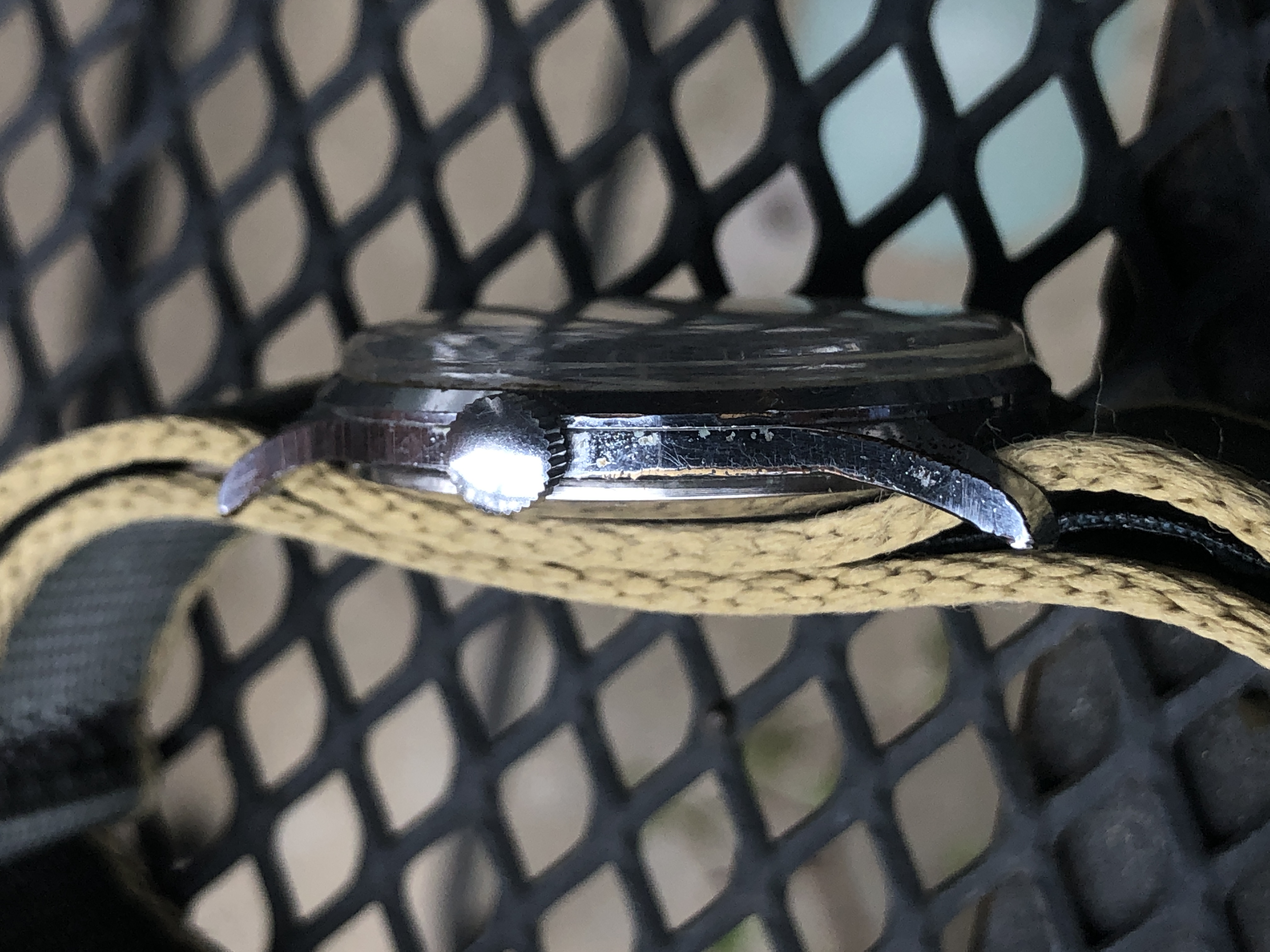 Case - Chrome plated case shows significant pitting, especially on the side of the case towards the upper left lug, and there is brass showing through on back of lug ends. Case edges are sharp.