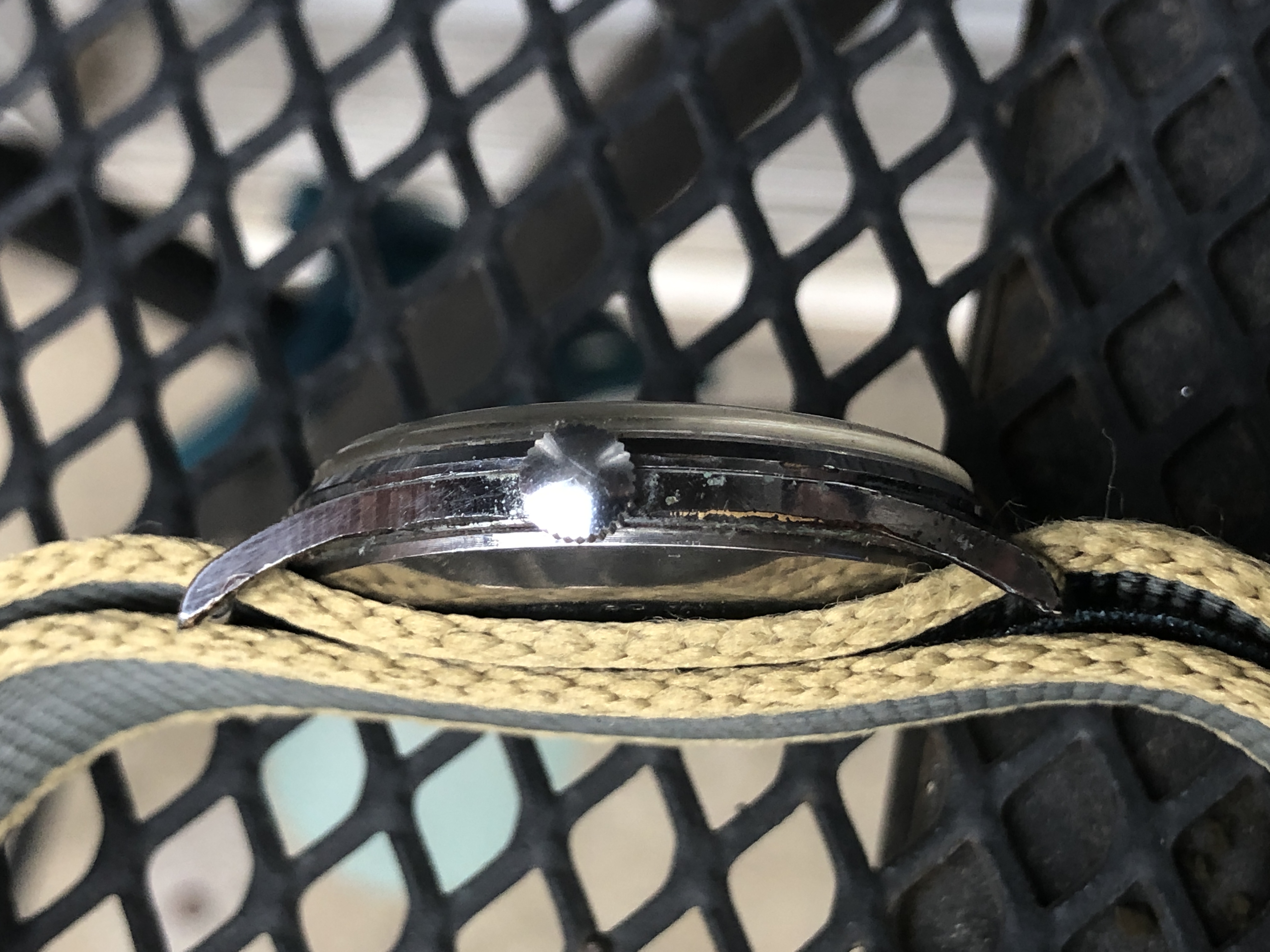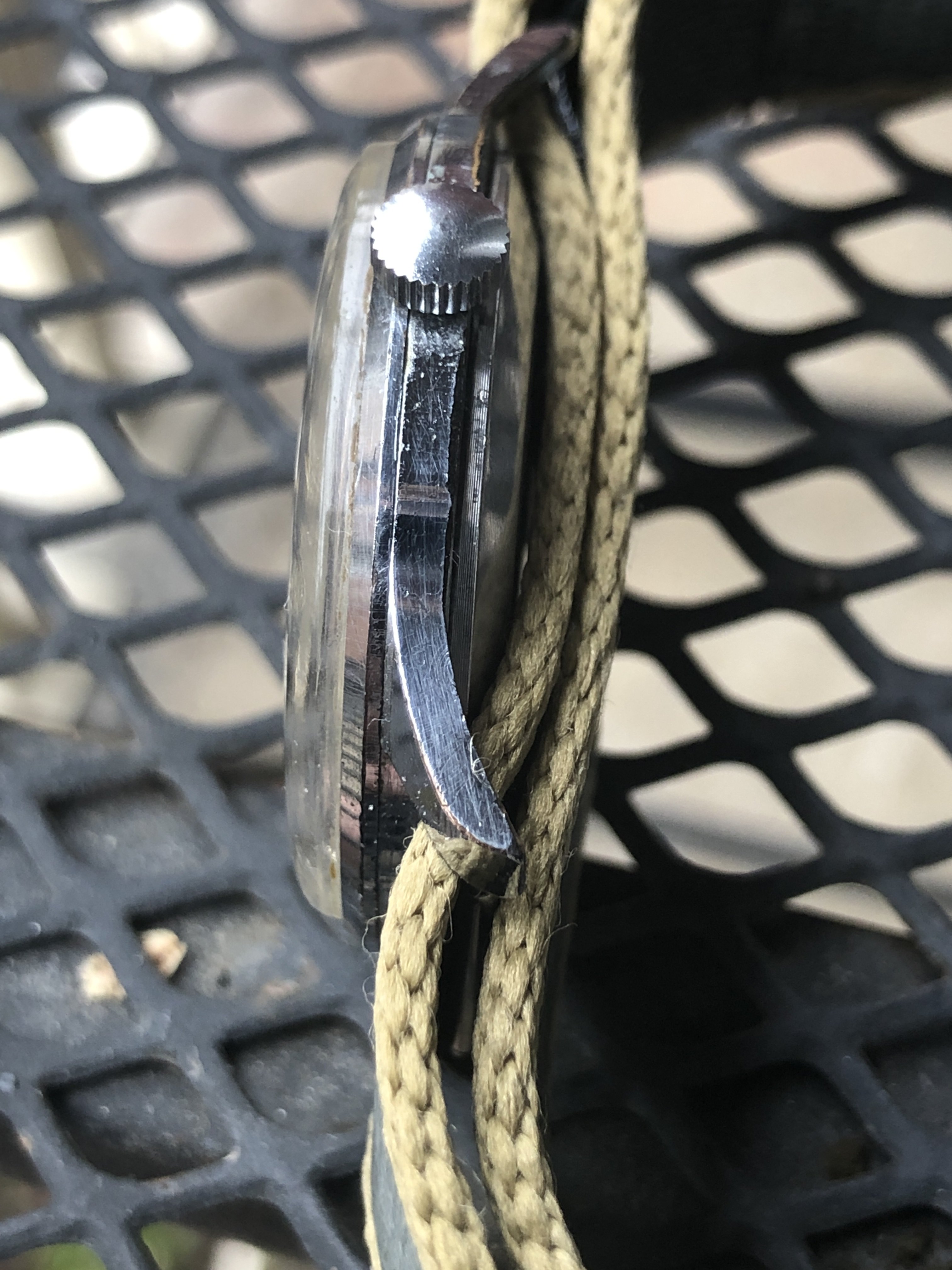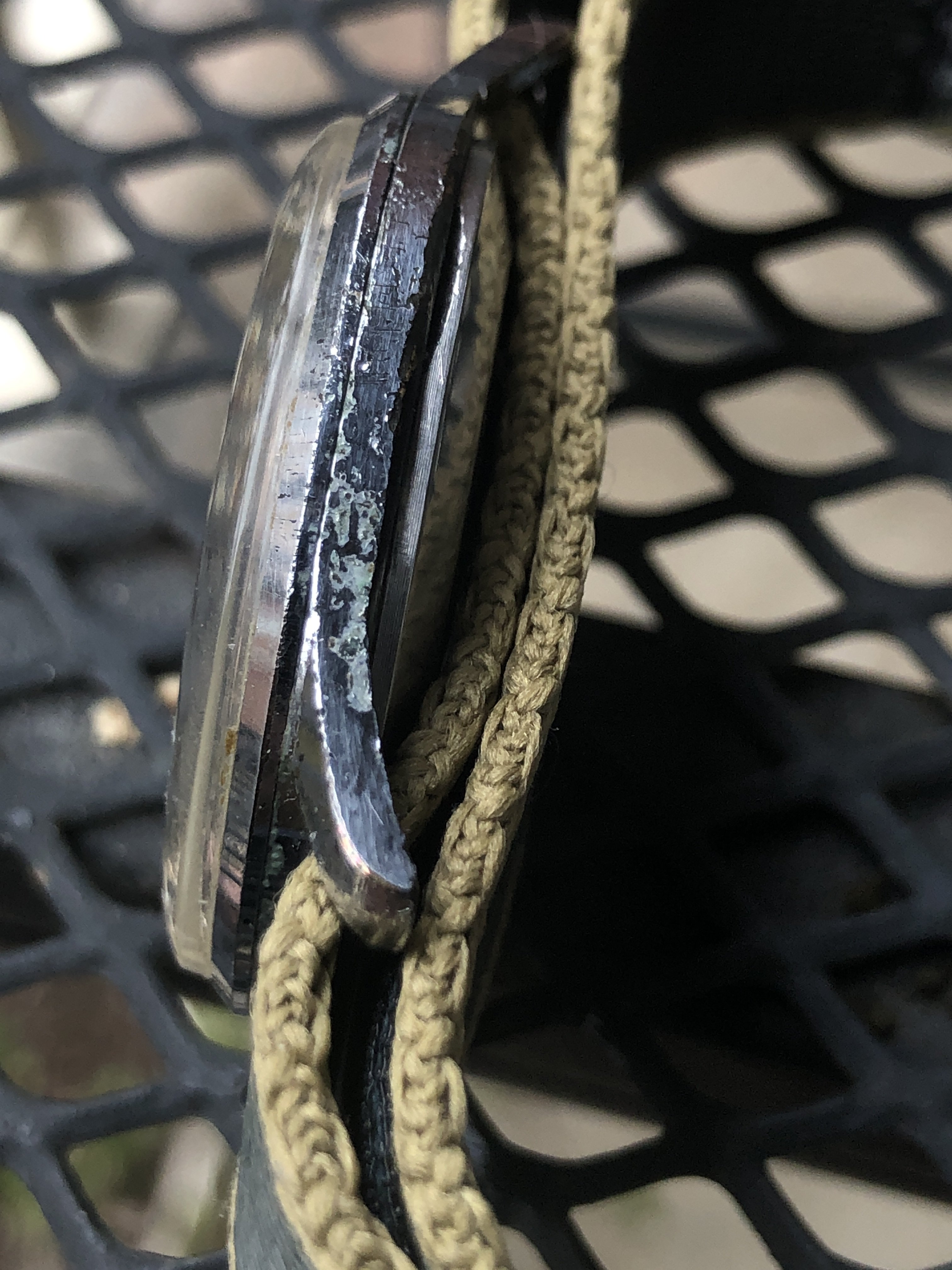 Case - Chrome plated case shows significant pitting, especially on the side of the case towards the upper left lug, and there is brass showing through on back of lug ends. Case edges are sharp.
