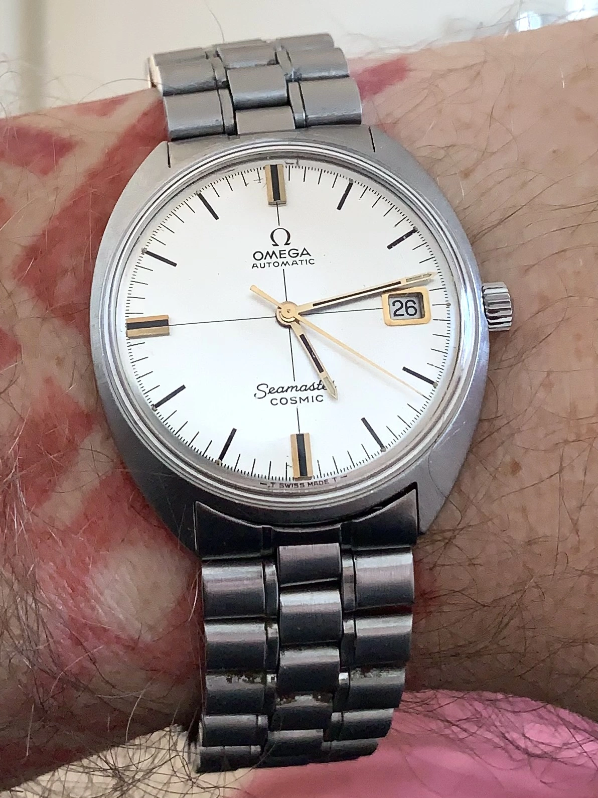 ·I caught this Cosmic on an auction to a fair price, bought a fitting original bracelet and original watch box on eBay and the end links on here. Yesterday it came back from service with the word from my watchmaker that the movement is in excellent condition but the crystal, although Omega with logo, isn’t original for this model.