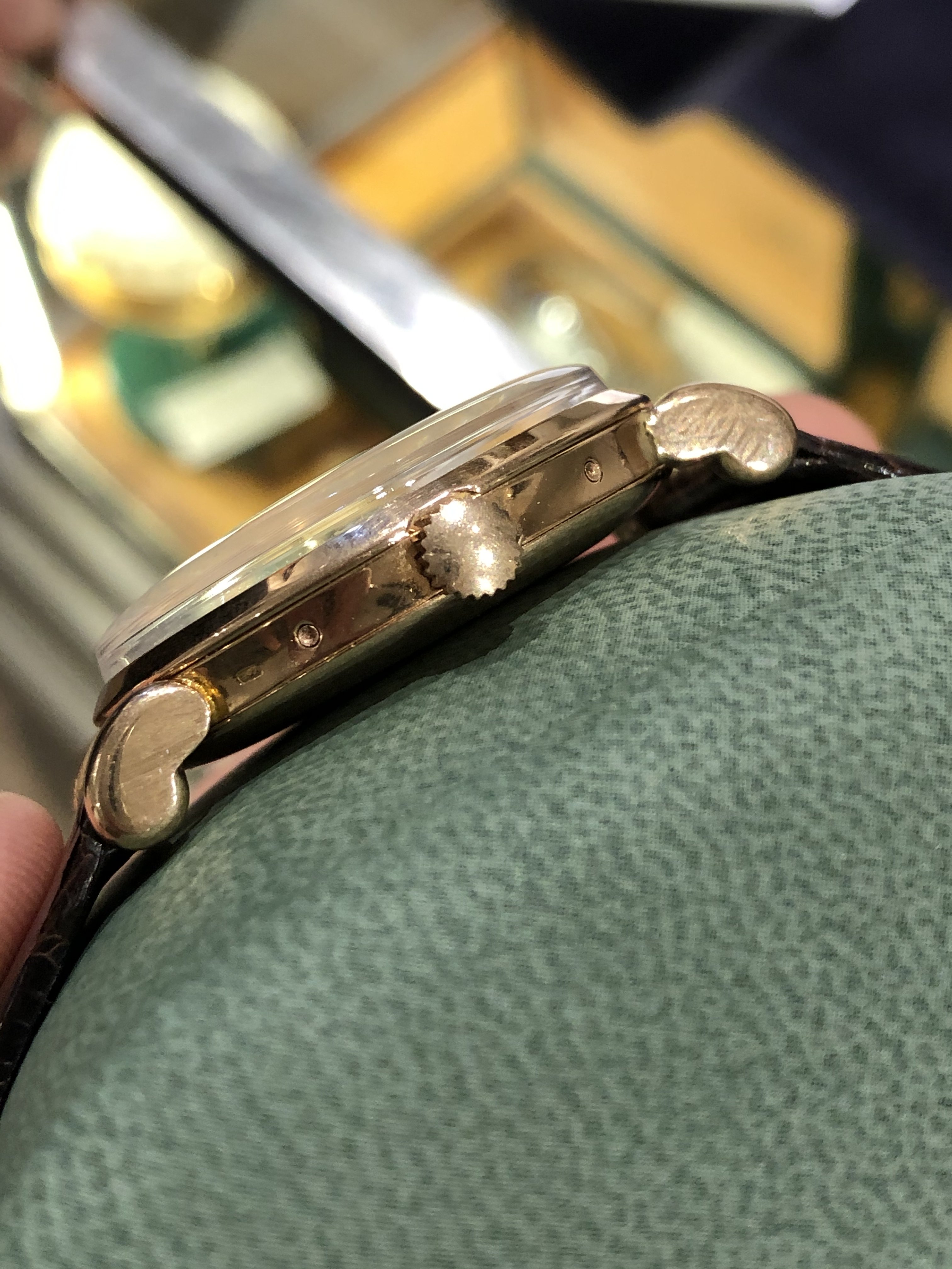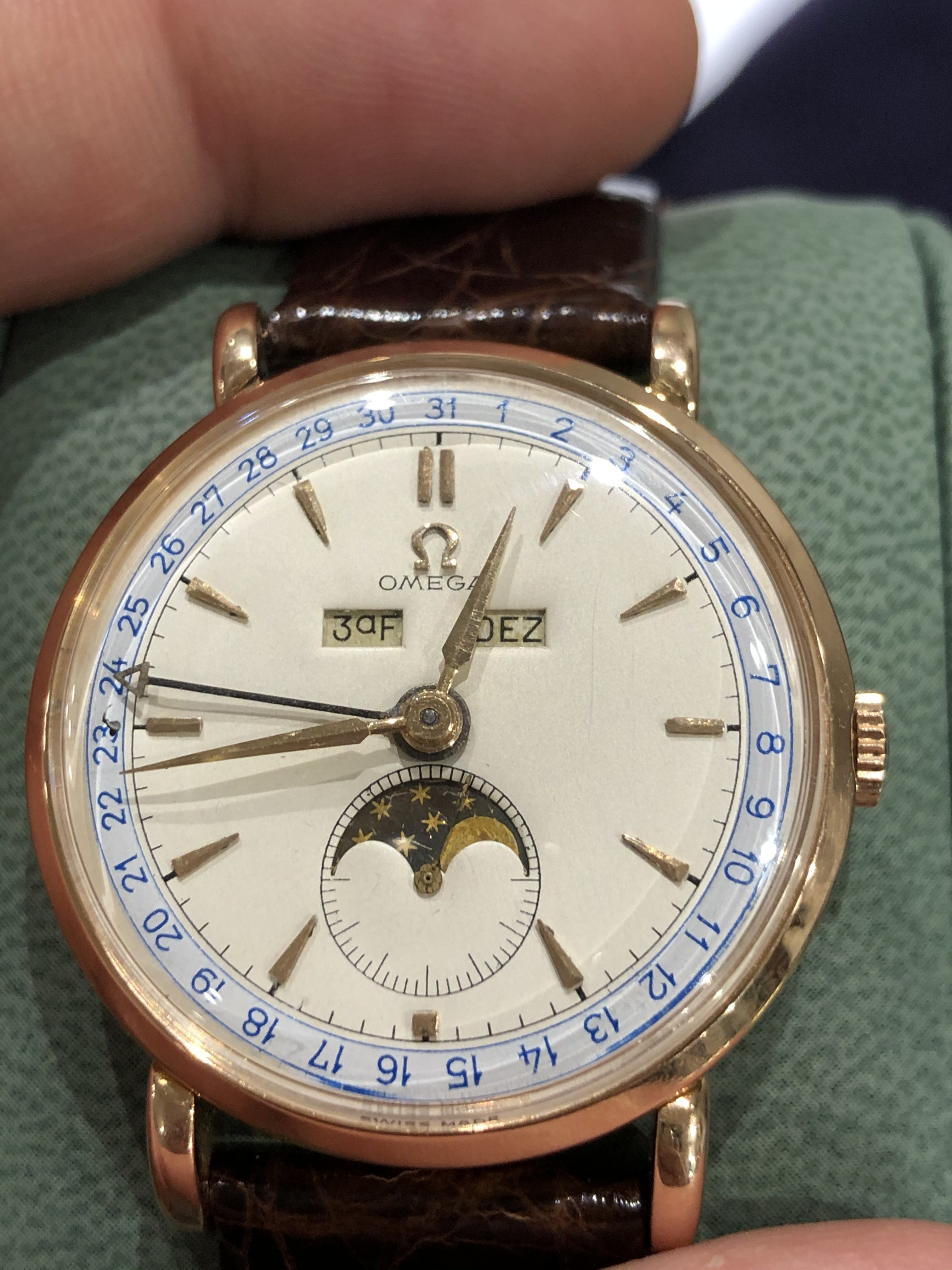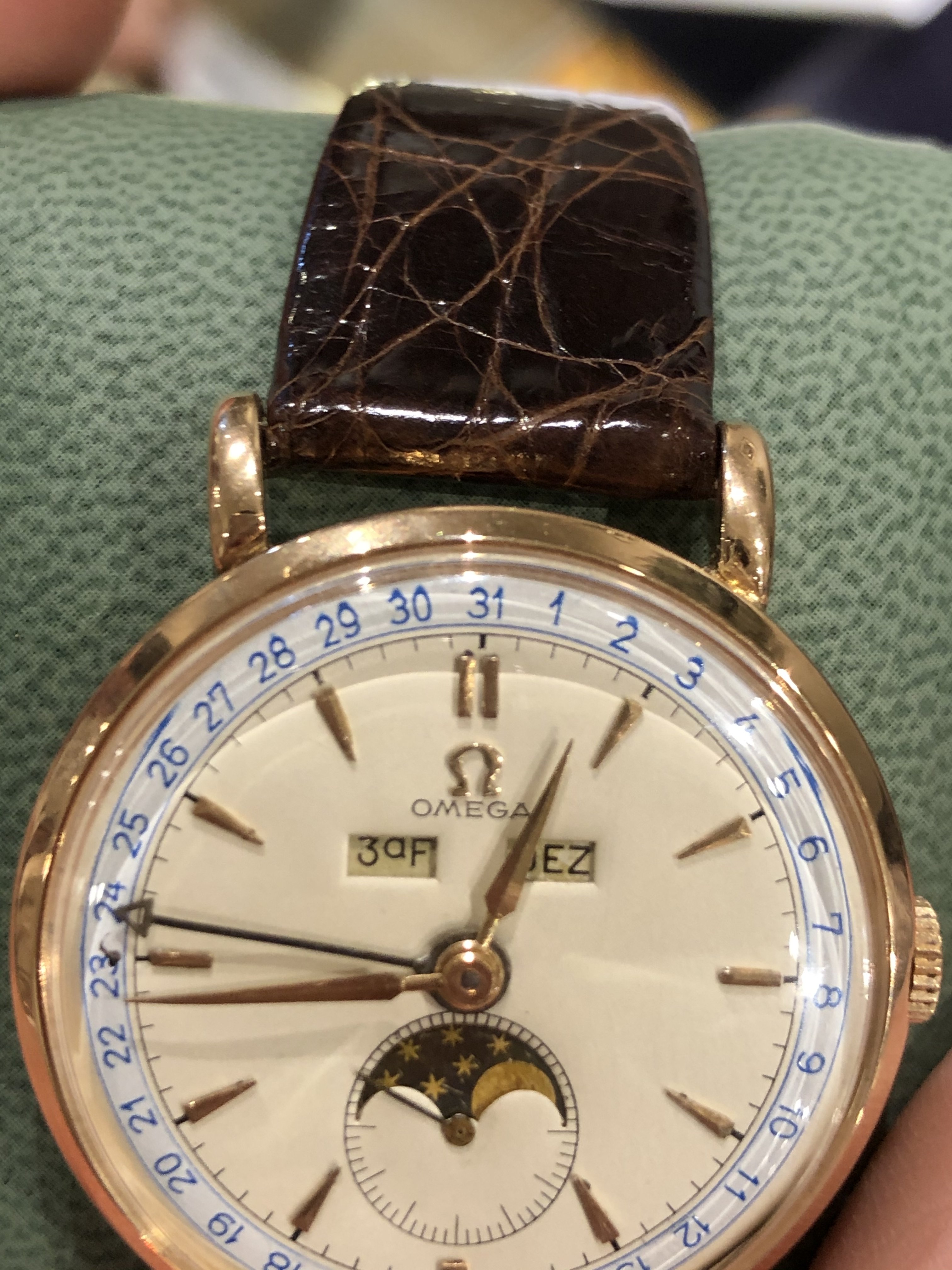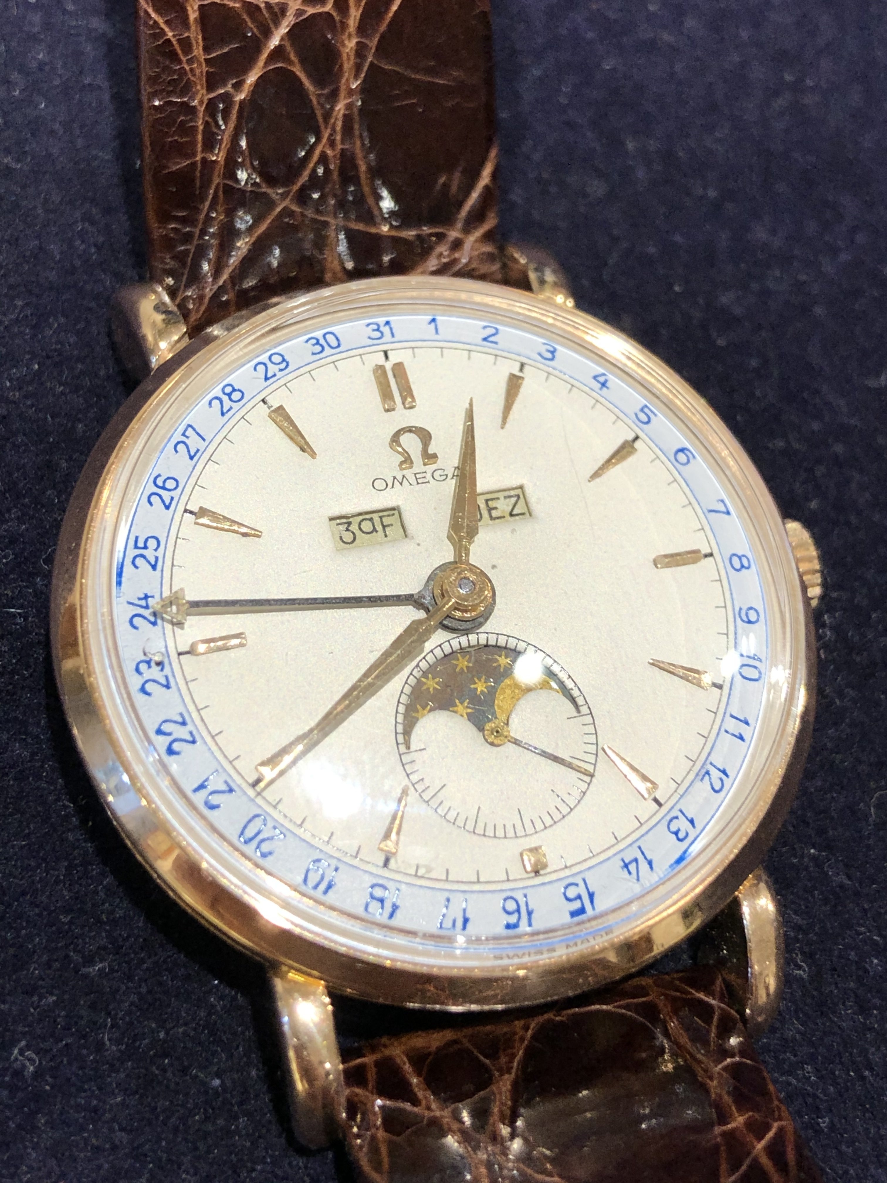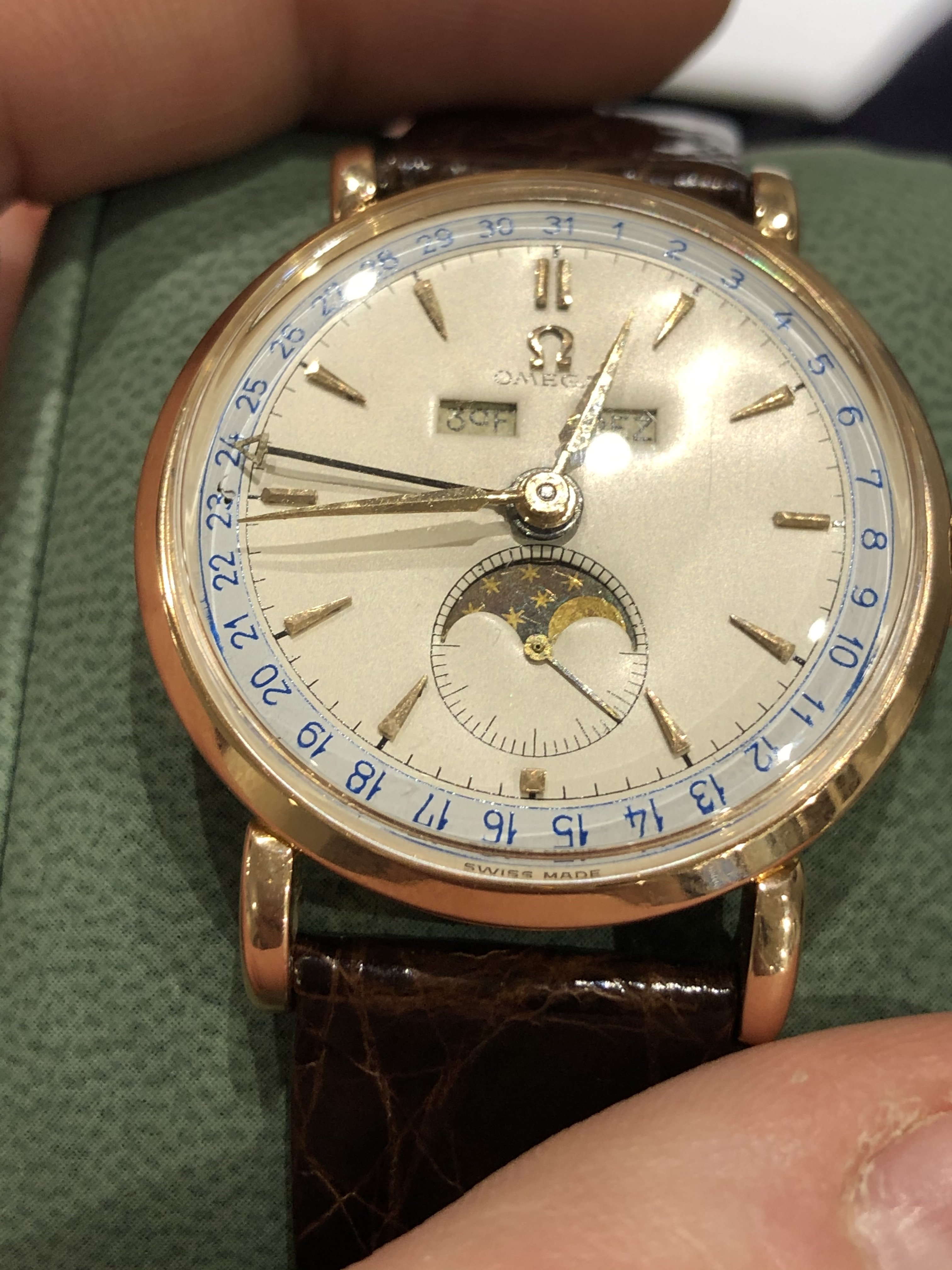 My parents have found a rose gold Cosmic Moonphase (Portuguese day and month) in a local vintage watch shop, and they want to buy it for me for Christmas. I have not been able to ask the shop for a REF yet, but I'm told it's a 1949 watch. The dial is in good shape, but not perfect (I think it has a slight concavity in it around the moonphase window); the watch is in good running order (the seller is well-respected and specialises in vintage Omegas). The case is in great shape, but not as-new of course. The plexi crystal has a single scratch about 7mm long, hard to see on the crystal but projects a shadow on the dial in the right light.