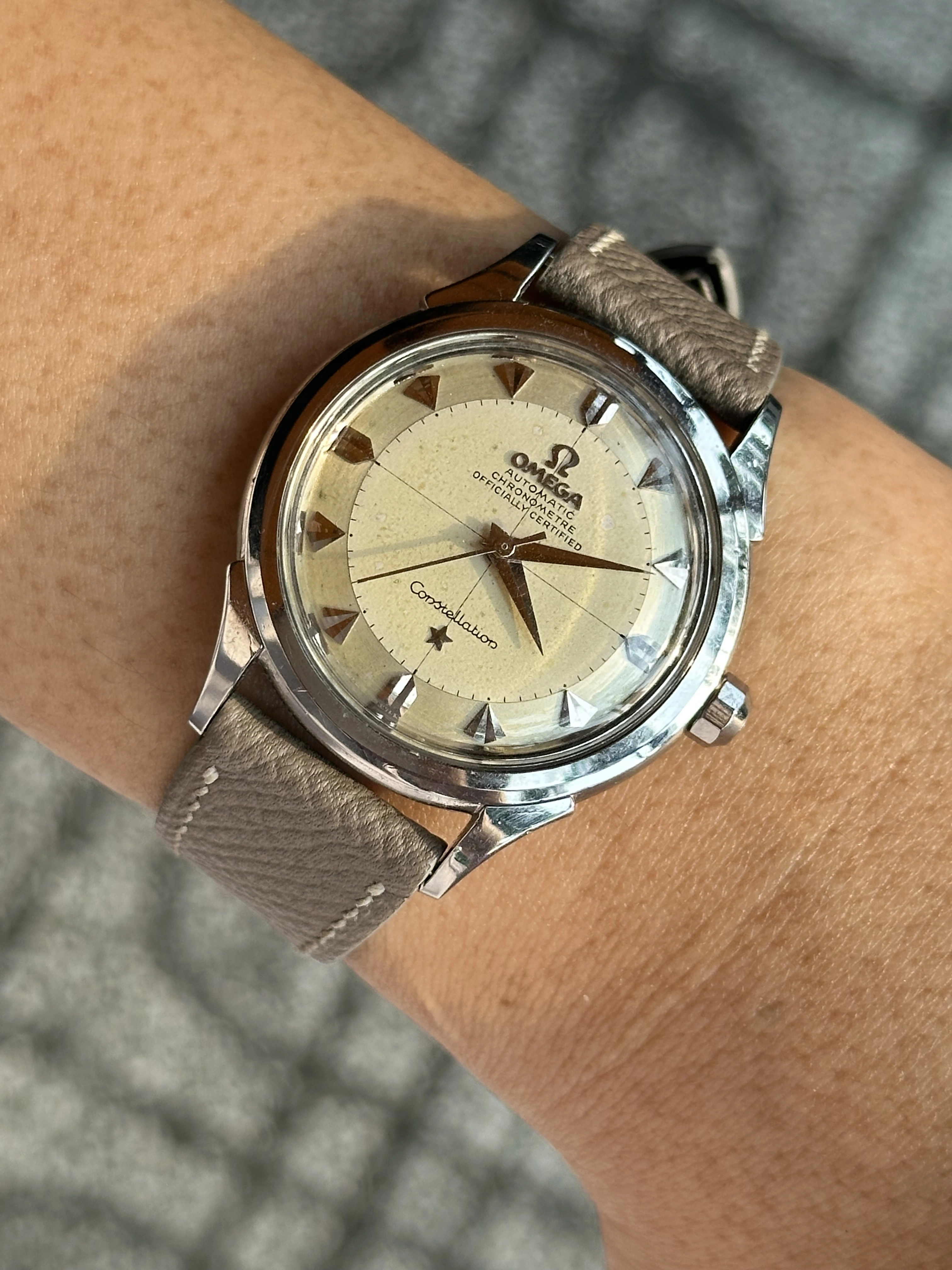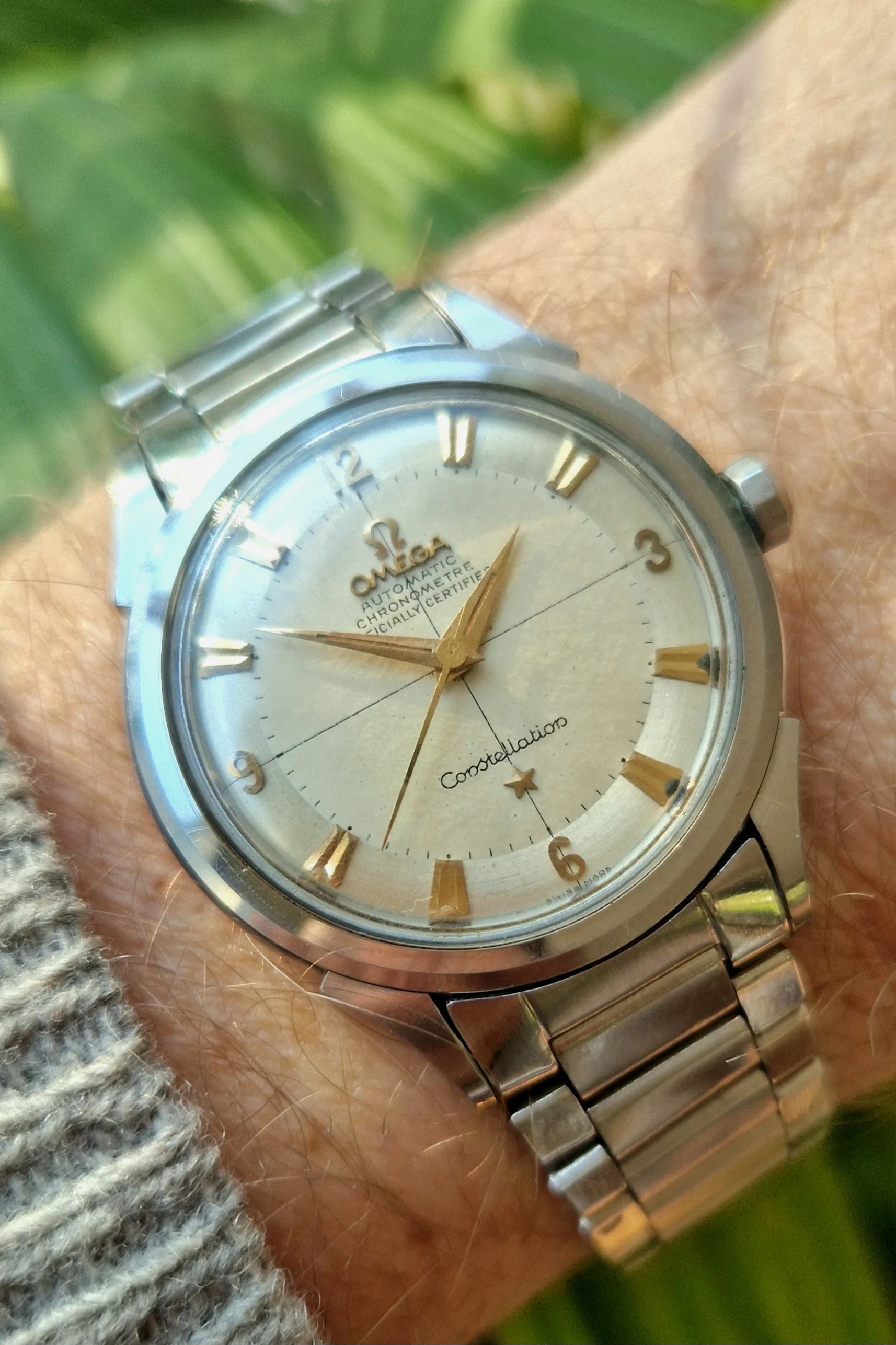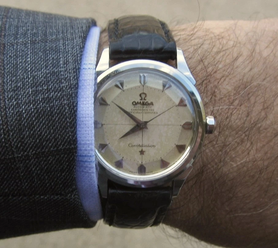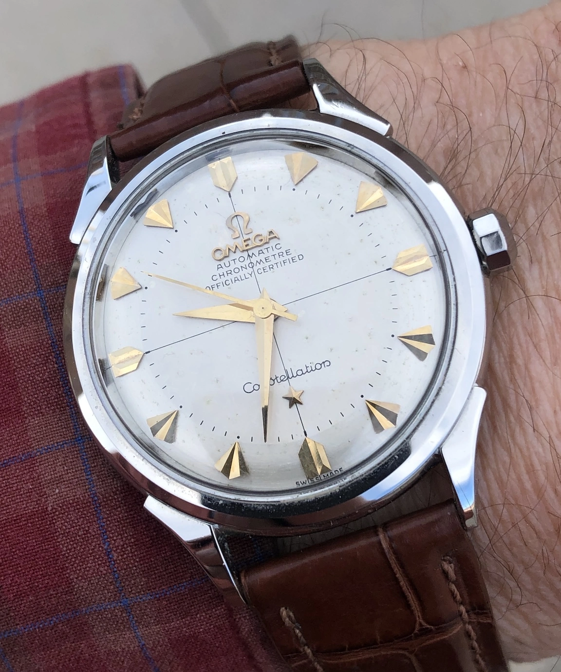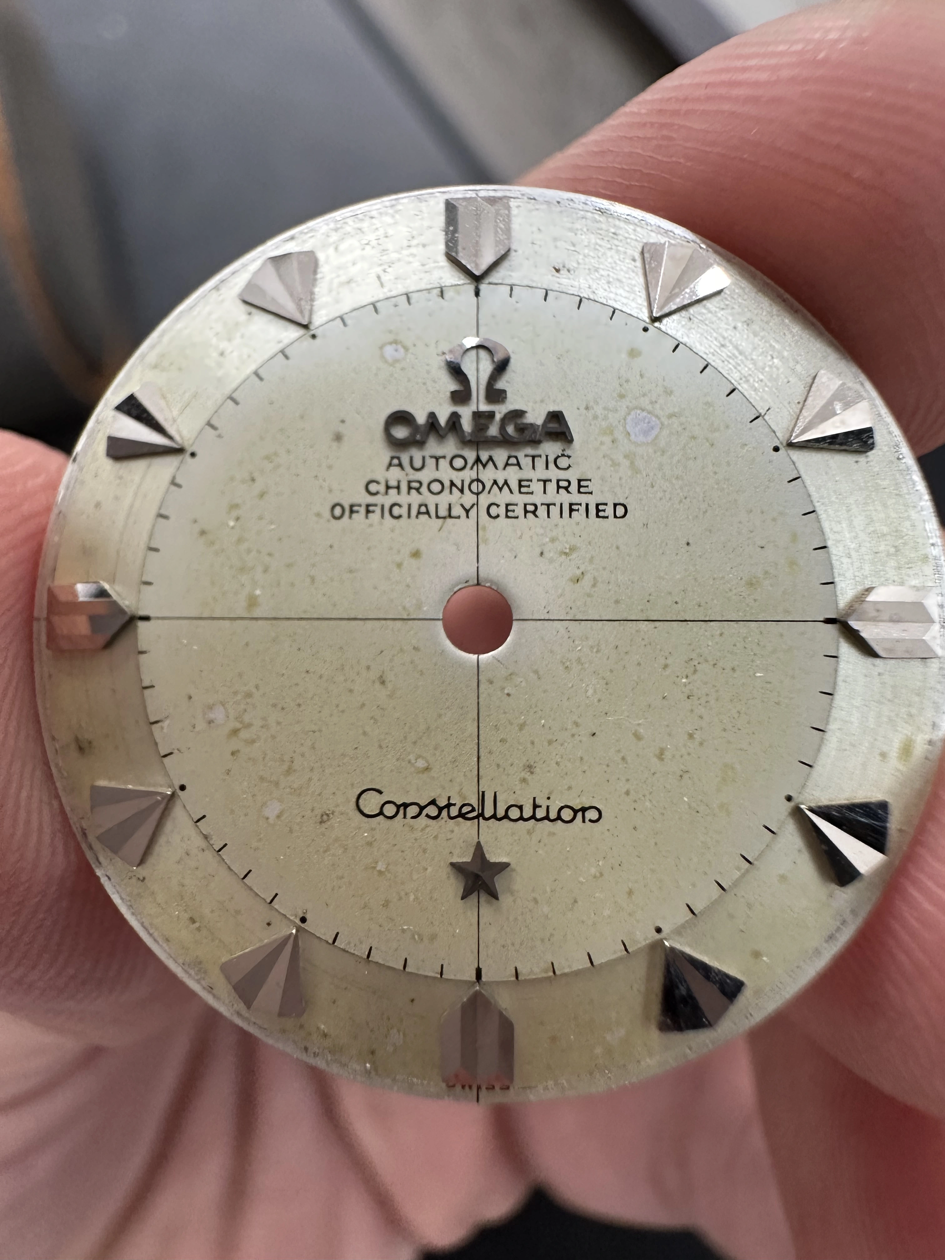 ·I just bought this morning, an Omega Constellation from 1958 with a patina dial featuring a crosshair and arrowhead hour markers. With my limited experience, I'd appreciate any advice on how to verify the authenticity of this dial. I would greatly appreciate any input.