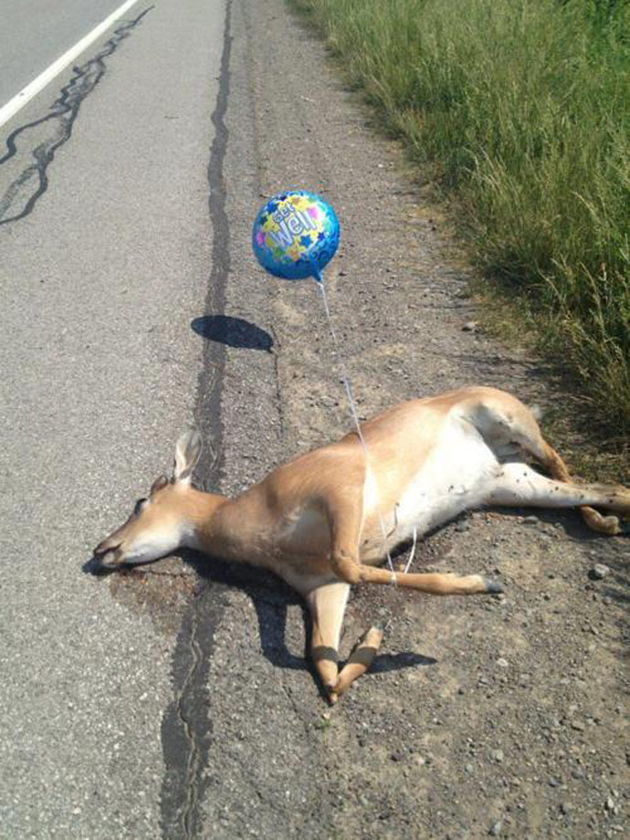 LOL! Have you ever driven down a highway in Michigan? Dead deer on the side of the road appears to be a statewide decorative theme. Some are like the one pictured, and some are nothing but bones and fur they have been left there so long...here at least we clean them up.