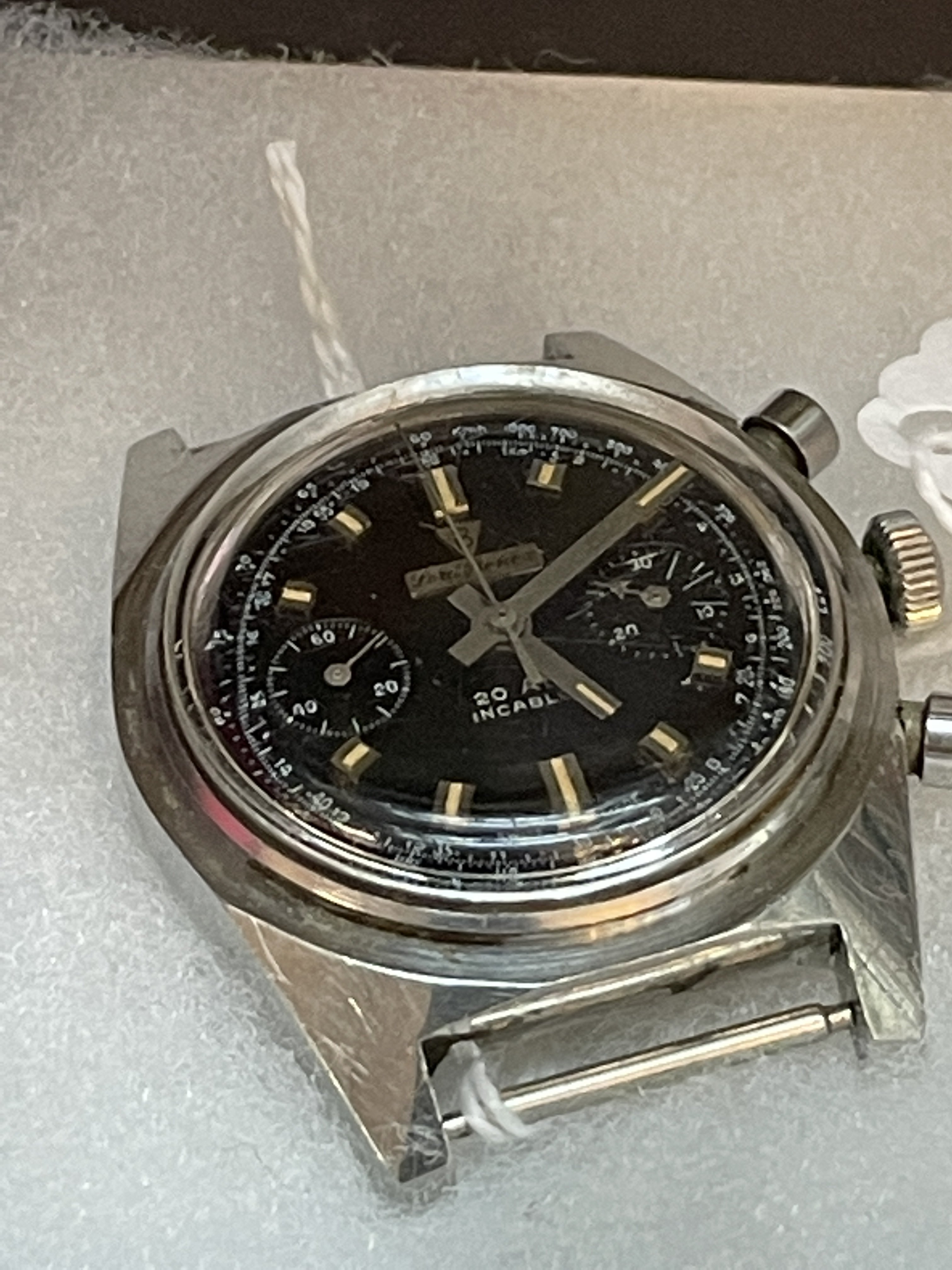 The Accro was NOS w/the original receipt from 1967 ($24.95) and listed for $150. The Lord Benex is missing it’s bezel and both pushers were frozen, $250.