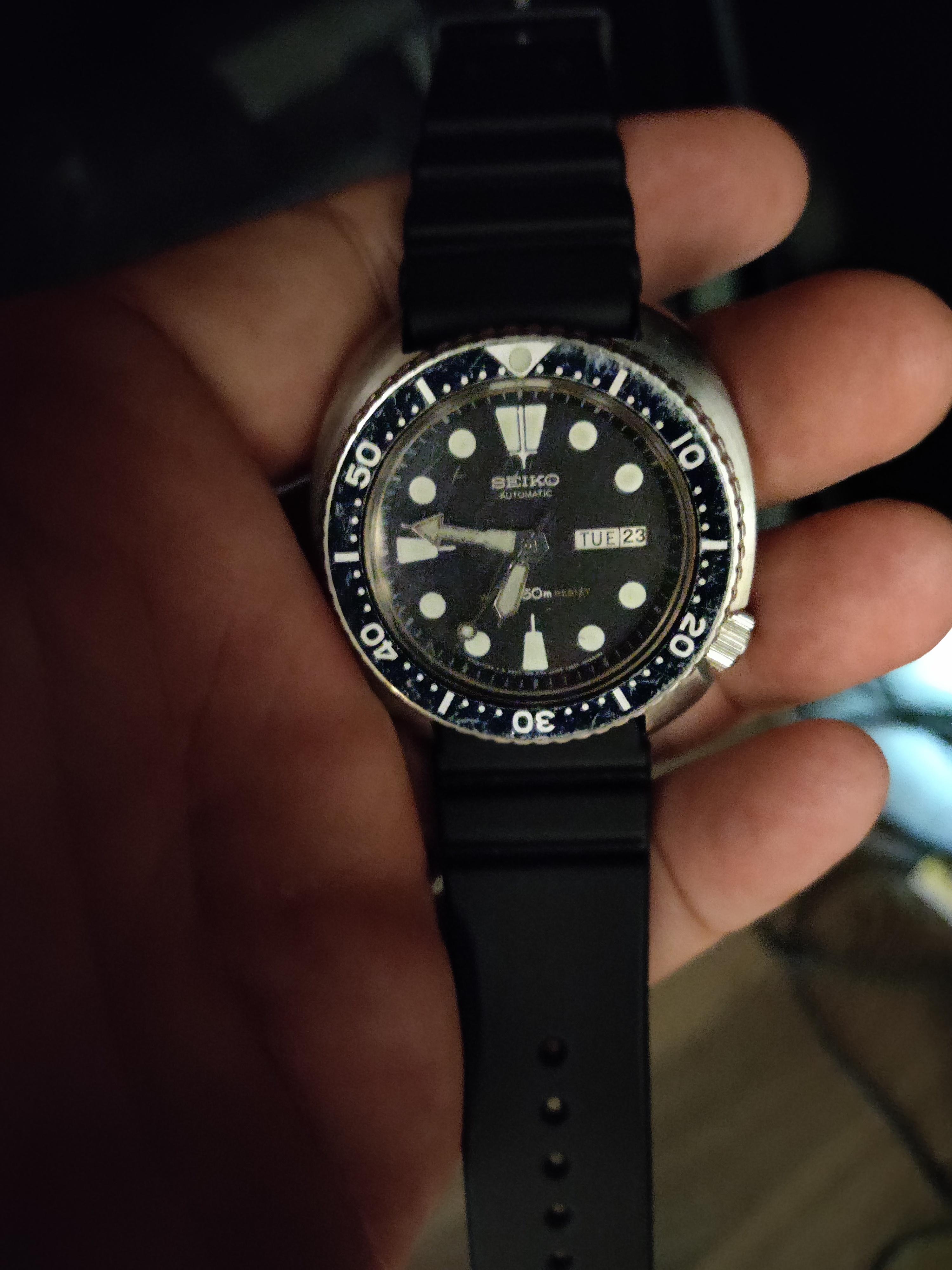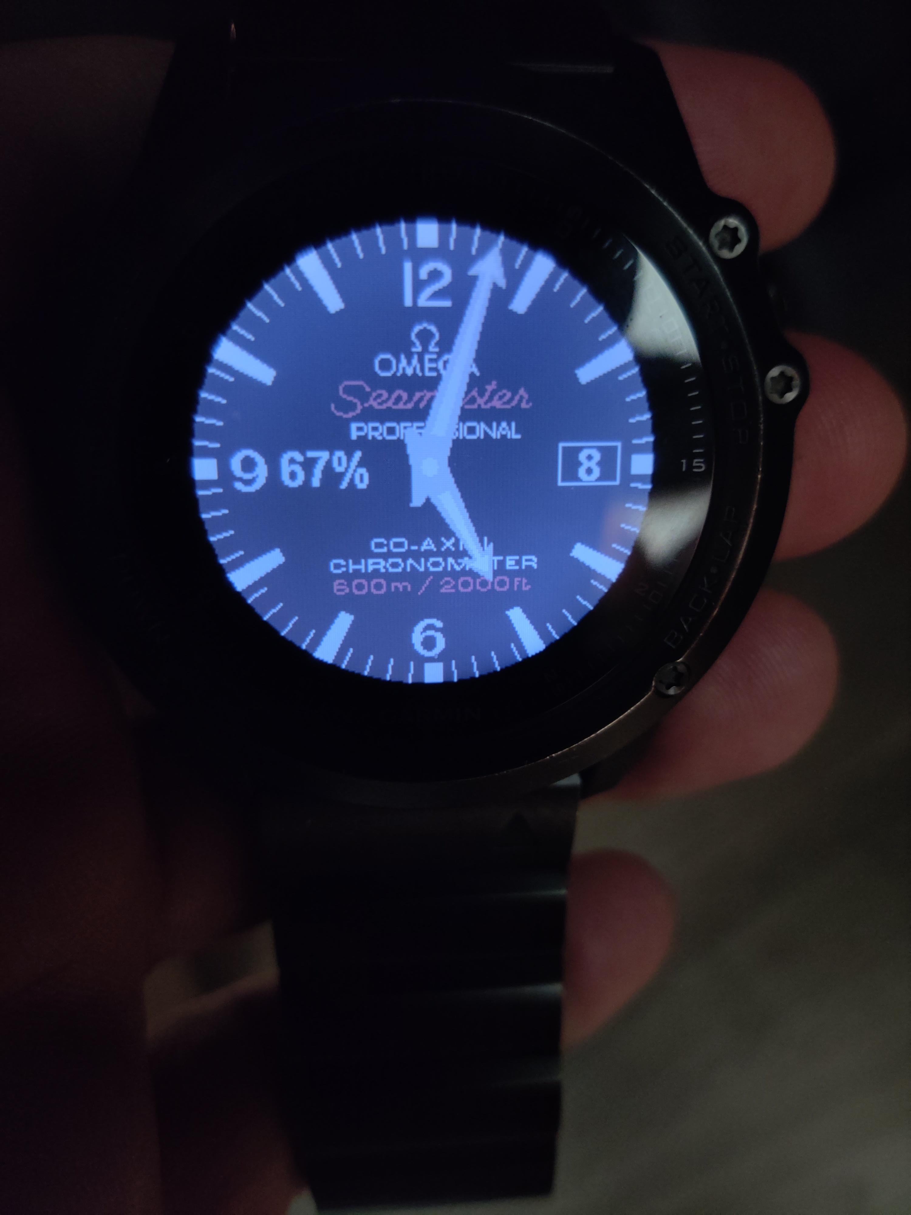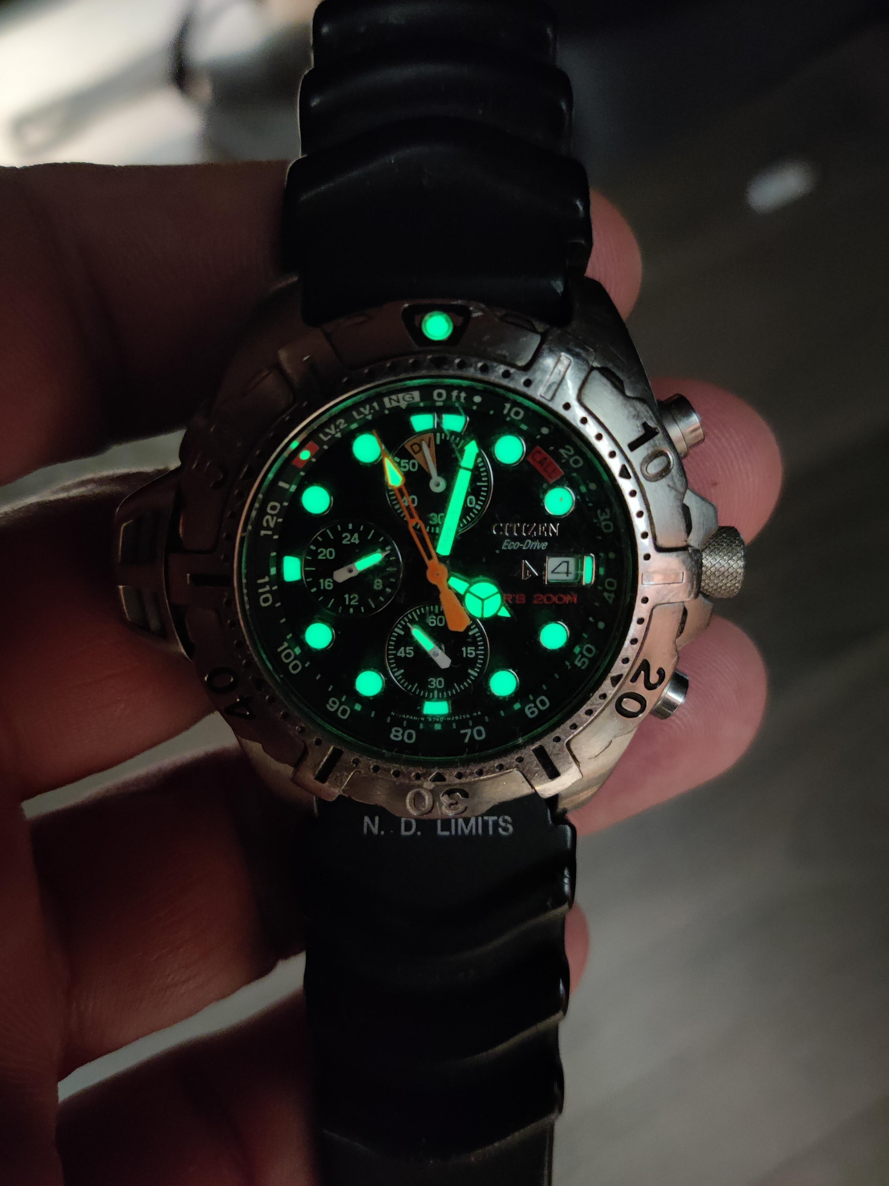 My Garmin...yes I put a Seamaster digital face on it years ago...I told you I have been jonesing for a Seamaster forever. LOL Then my Citizen Eco-Drive lit up nicely. Finally, my old trusted Seiko 6309-7049 I bought new in 1985...the lume is dead. Not sure whether to get re-lumed or leave original. Has been serviced twice and runs like a champ...but is showing some wear and tear after 20 years in military on deployments, in gym, in woods, paddling, working on old Land Cruisers, chopping wood and general daily manly activities. It gets worn less often now with the Garmin...but just bought a new oem rubber strap and an Uncle Seiko Oyster style bracelet for it to start wearing more often and selling the Garmin...as have real Seamaster or will tomorrow. LOL