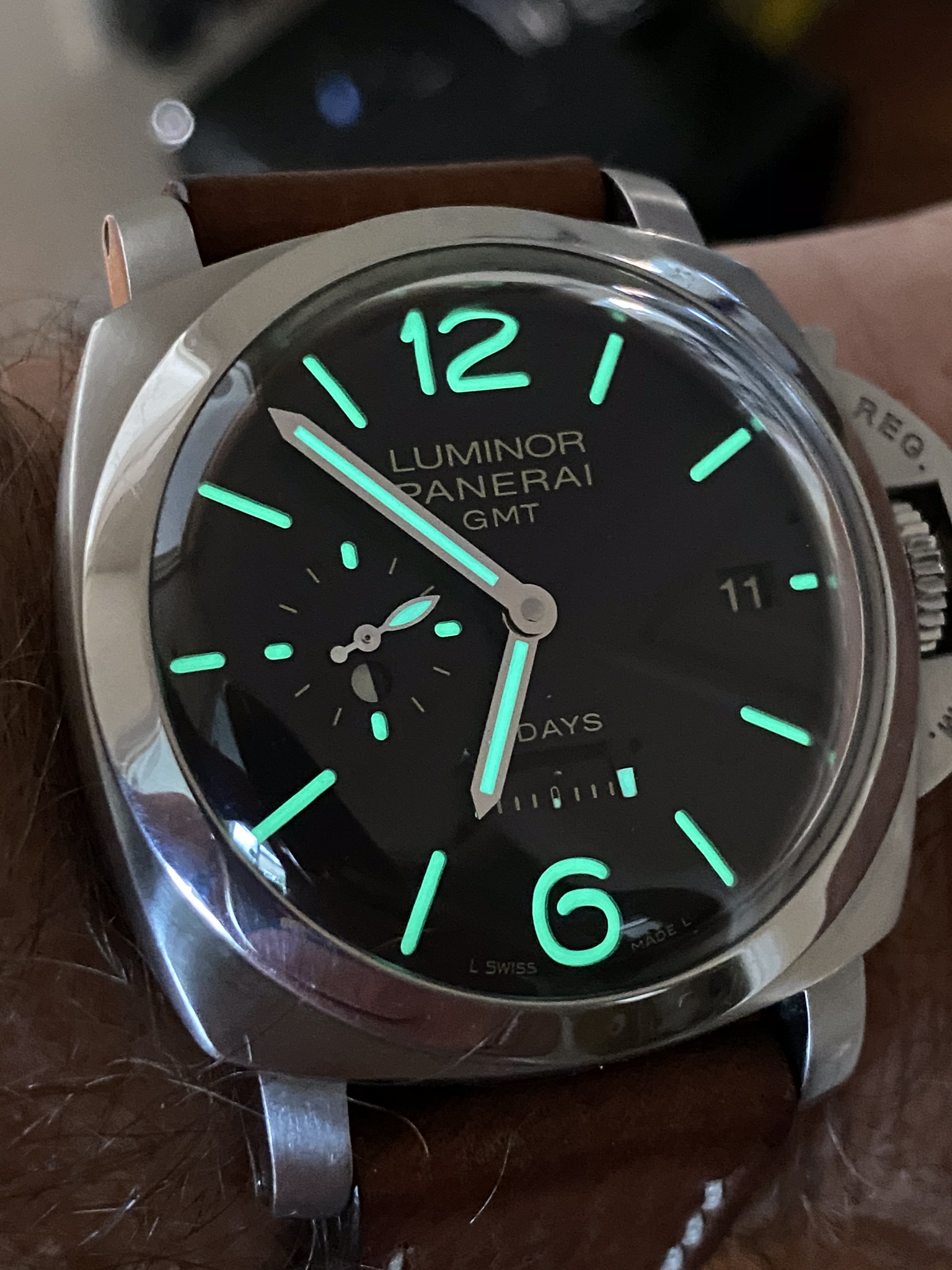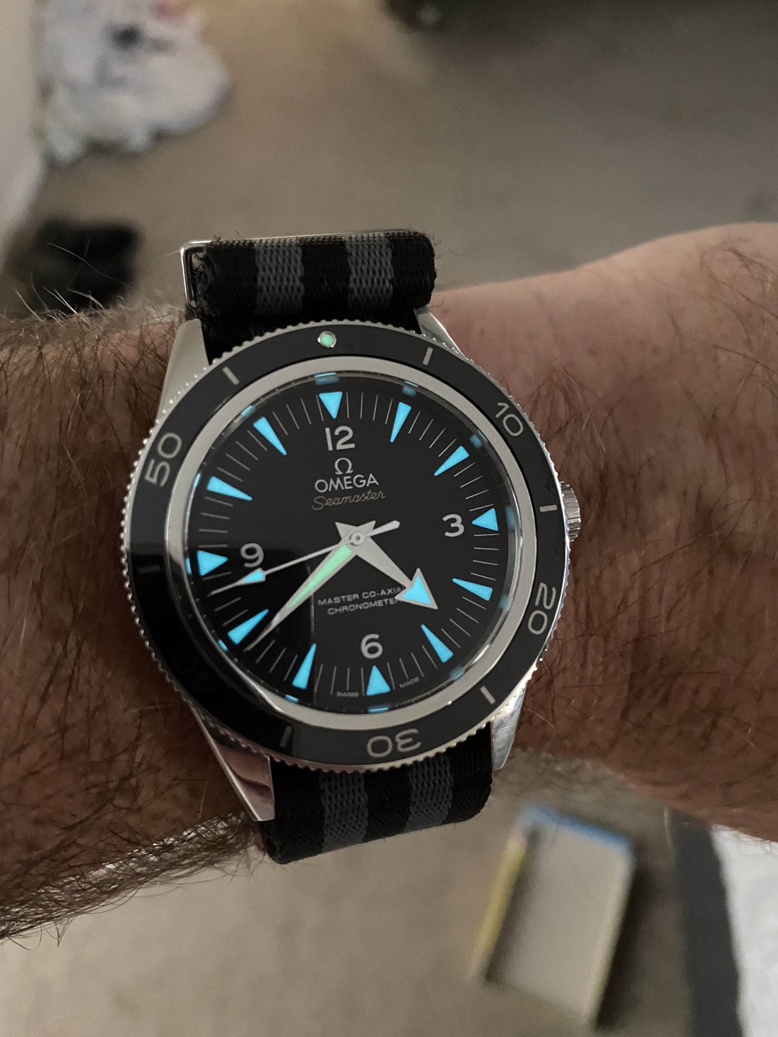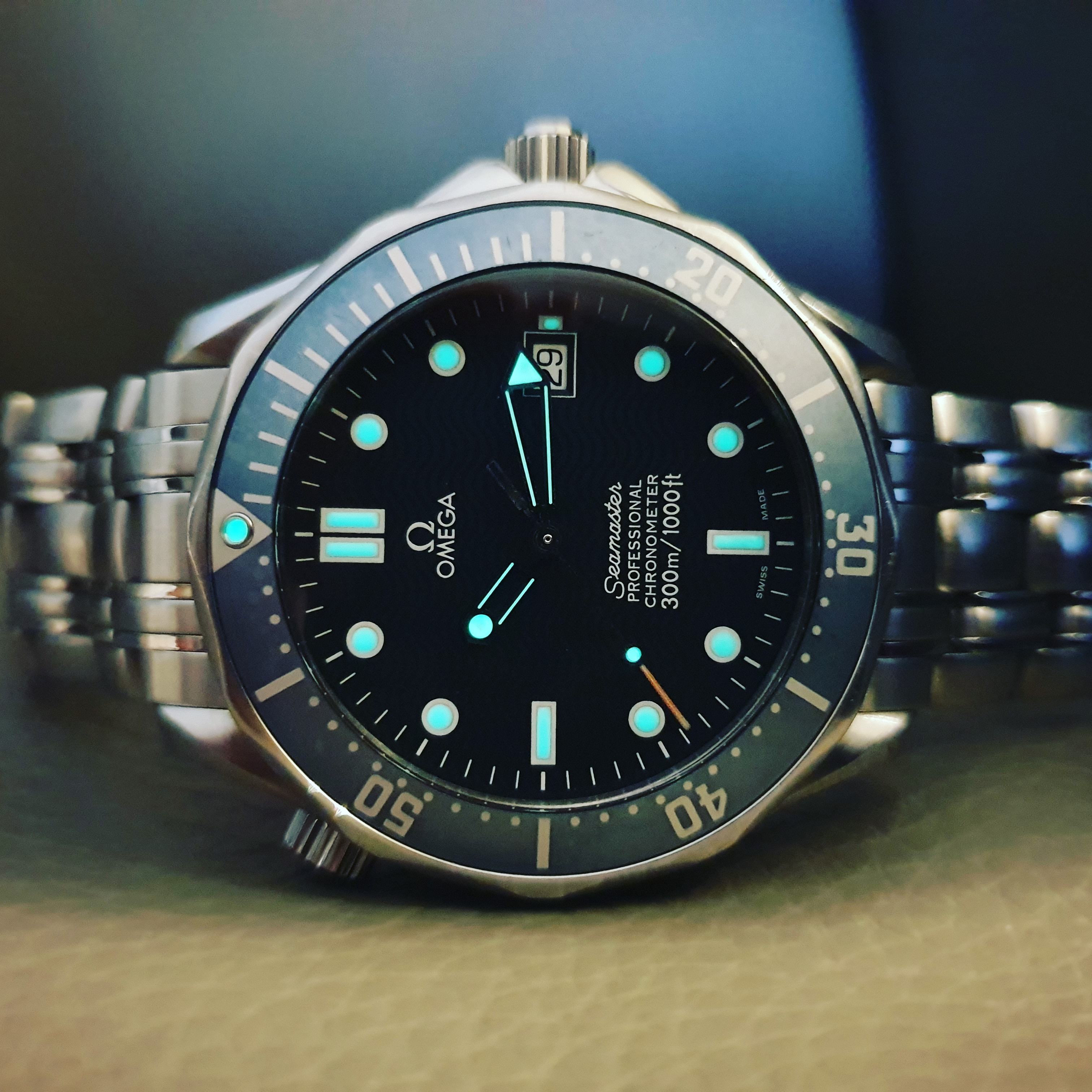 My Garmin...yes I put a Seamaster digital face on it years ago...I told you I have been jonesing for a Seamaster forever. LOL Then my Citizen Eco-Drive lit up nicely. Finally, my old trusted Seiko 6309-7049 I bought new in 1985...the lume is dead. Not sure whether to get re-lumed or leave original. Has been serviced twice and runs like a champ...but is showing some wear and tear after 20 years in military on deployments, in gym, in woods, paddling, working on old Land Cruisers, chopping wood and general daily manly activities. It gets worn less often now with the Garmin...but just bought a new oem rubber strap and an Uncle Seiko Oyster style bracelet for it to start wearing more often and selling the Garmin...as have real Seamaster or will tomorrow. LOL