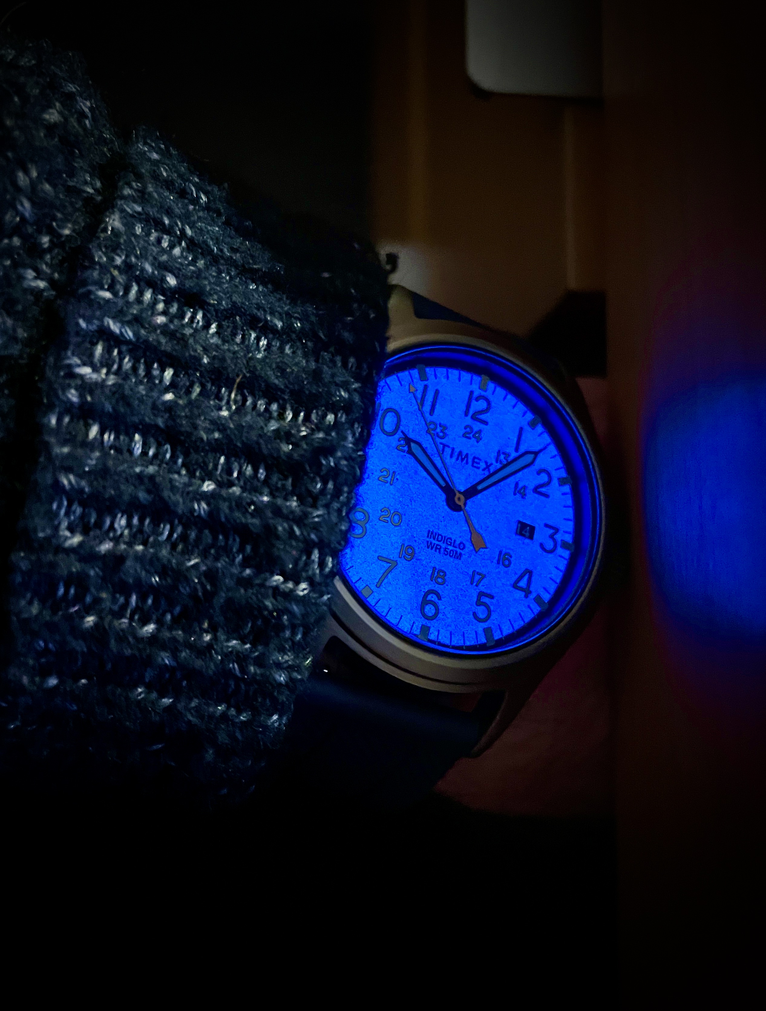 Posts 1,173 Likes 11,987 sah ·Apr 14, 2022 Alpha Timex doing its own thing 😀 Indiglo! My wife loves her Timex and calls it her “movie watch.”