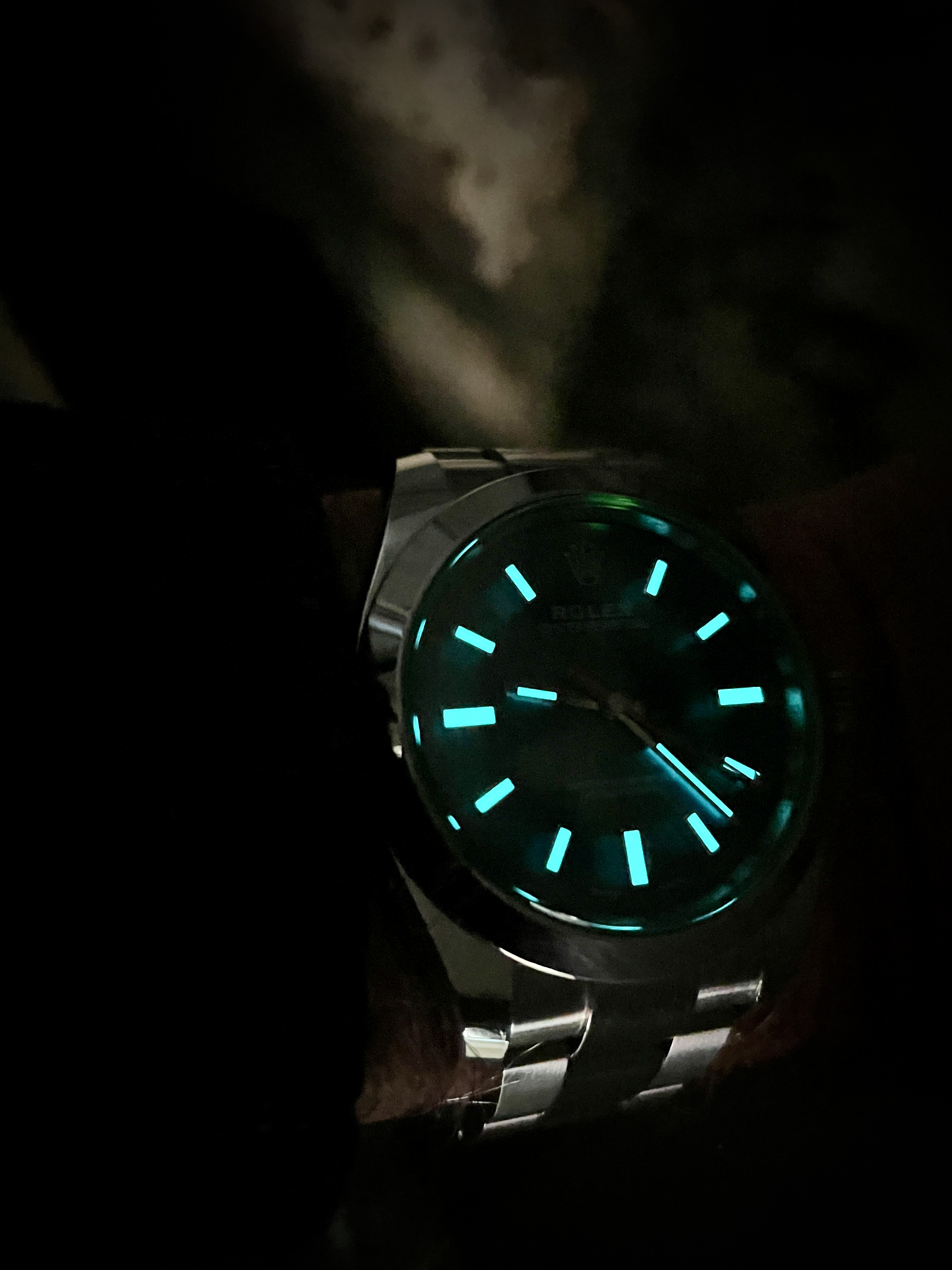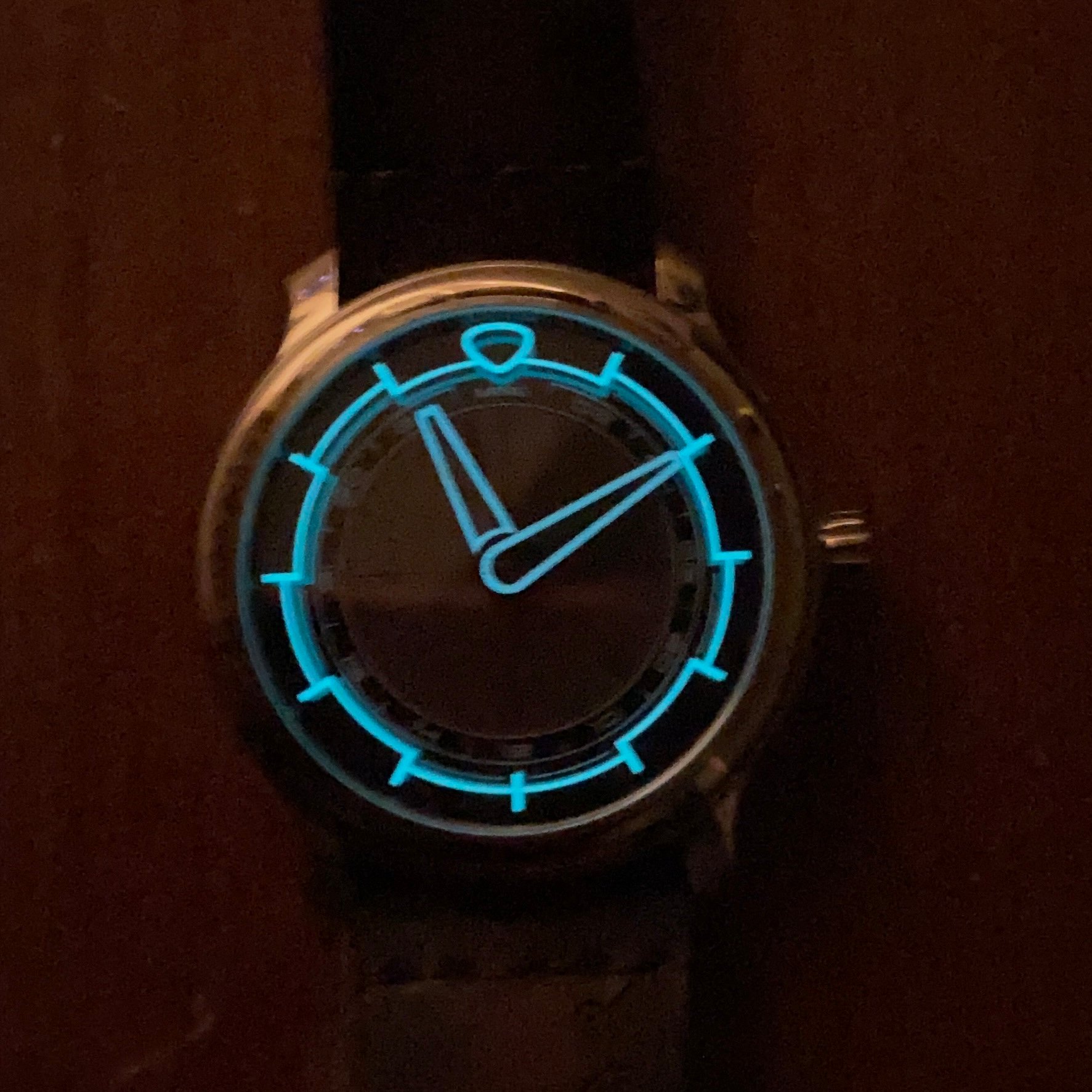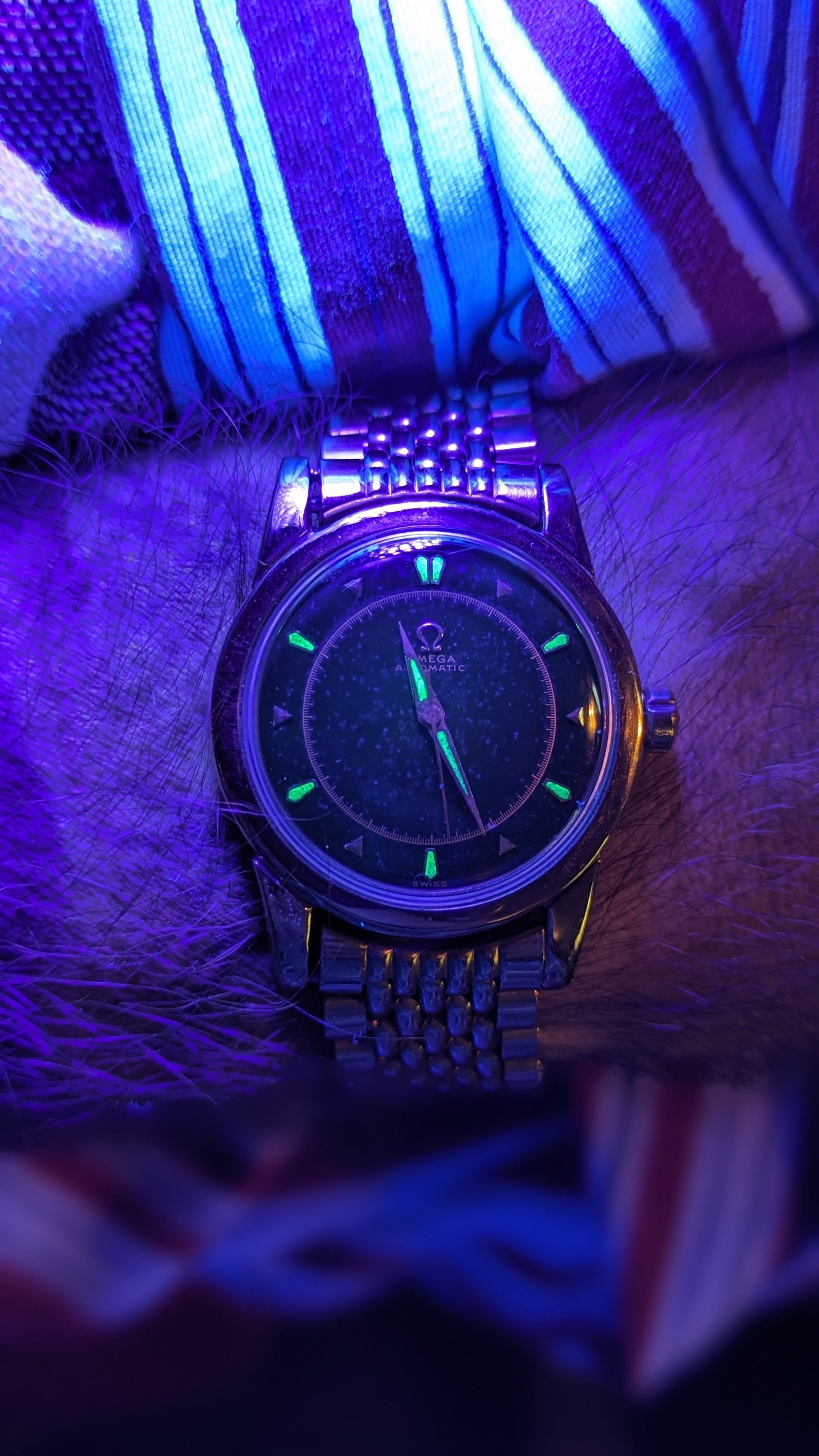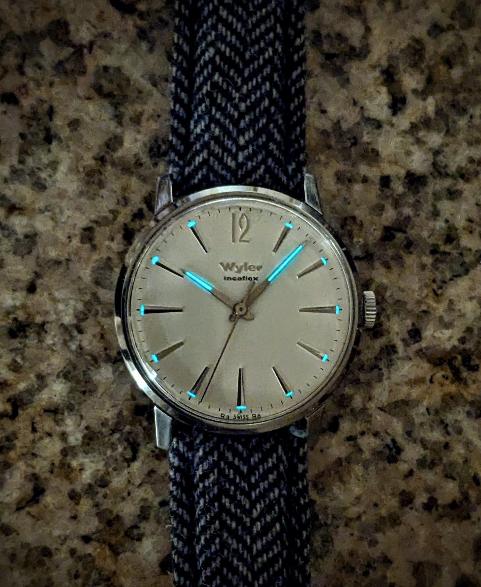 The old Radium lume does not glow on its own any more, at least not to the naked eye. But in a dim room & with long exposure can get a sense of what it looked like back in the day.