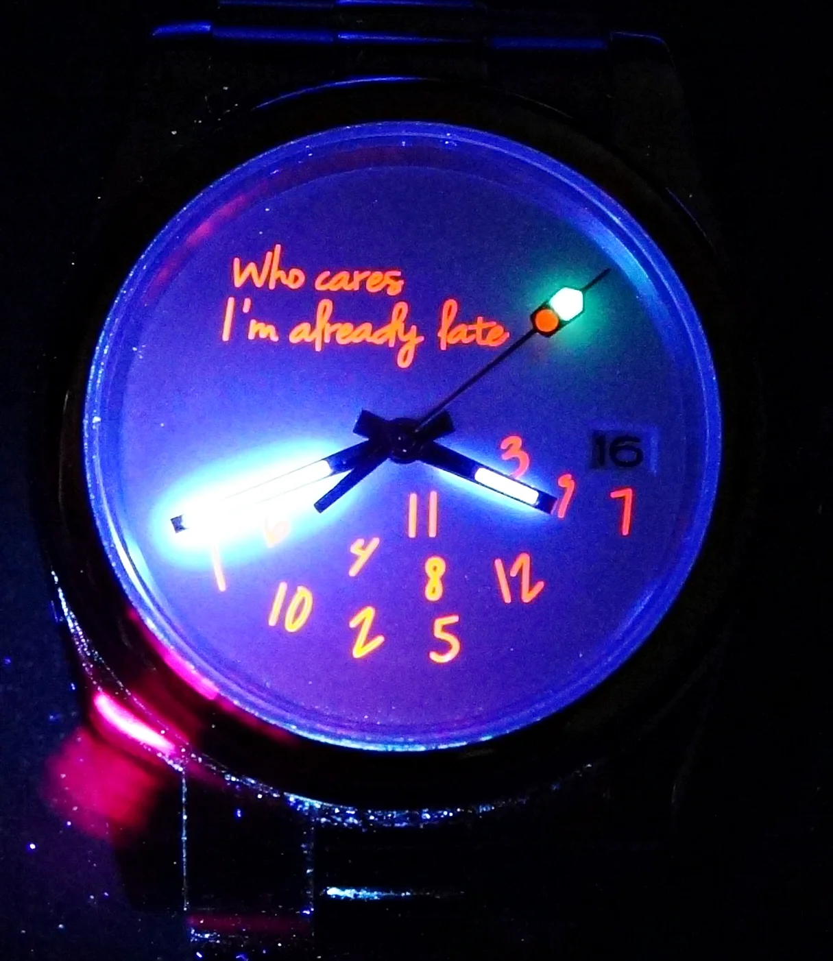 Posts 2,906 Likes 6,070 Fallout Boy ·Sep 28, 2025 IMO all tritium. This IMO yes: - you see the relumed hands (1980ies) Do not buy UV-lamps under/over 360/365 nm or without mentioning the wave-lenght! (And do not check the toilets with the light in hotels 😁 )