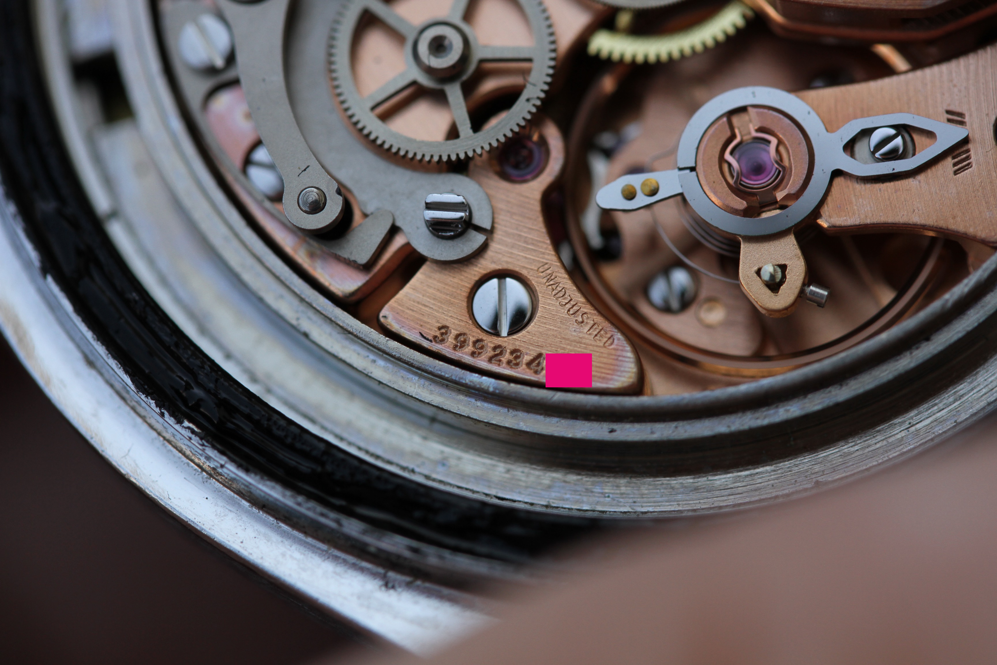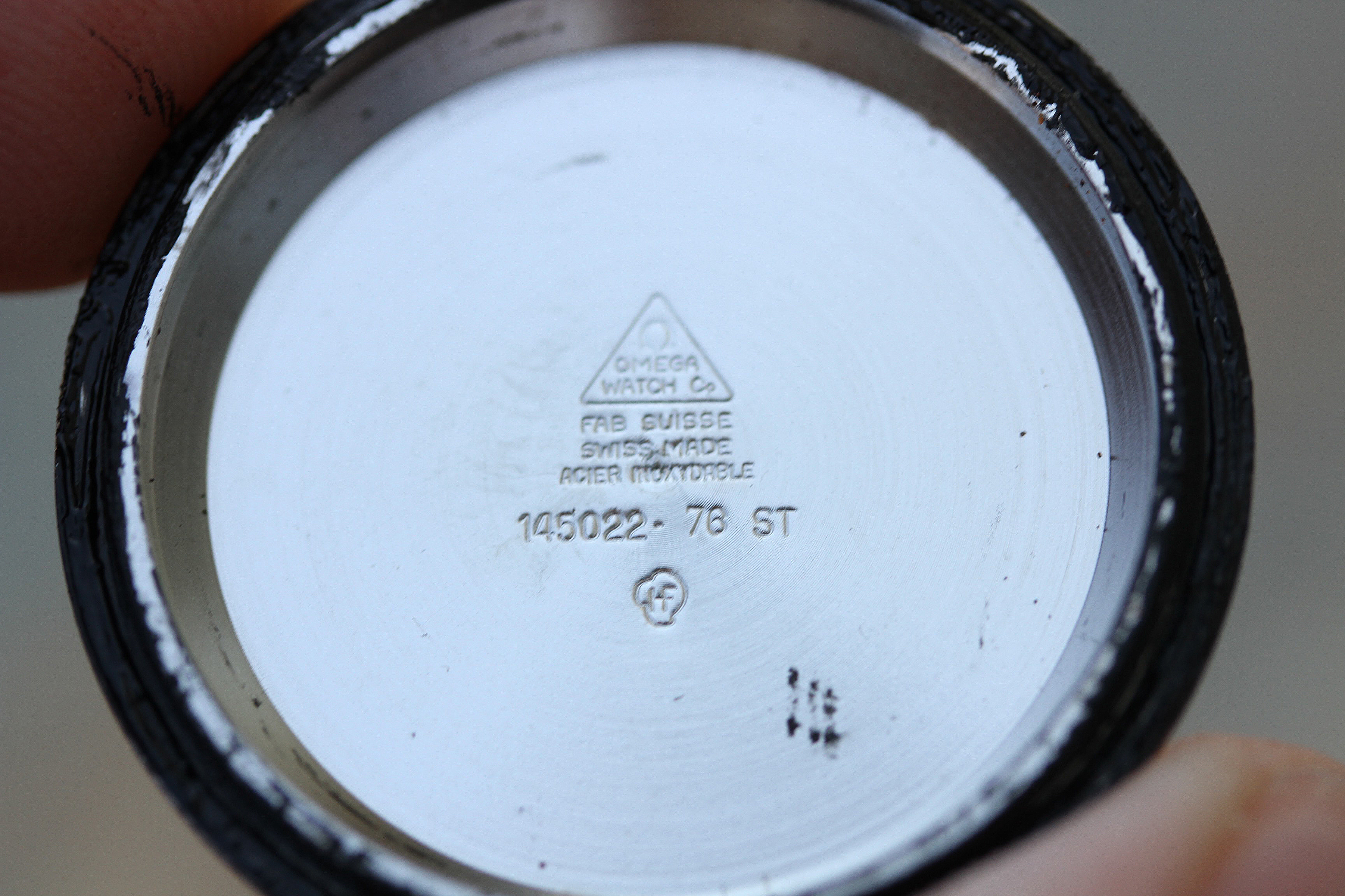 Caseback is super crisp, original finish on outside. Stamped 145.022 -76 inside. No service markings whatsoever on inside. The typical "gasket melt" of the caseback and case gasket is also additional evidence showing watch has not been touched in decades.
