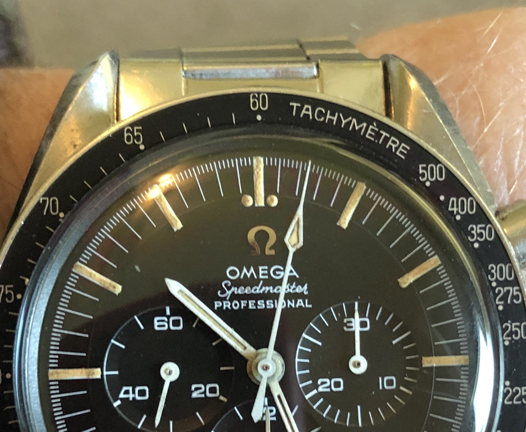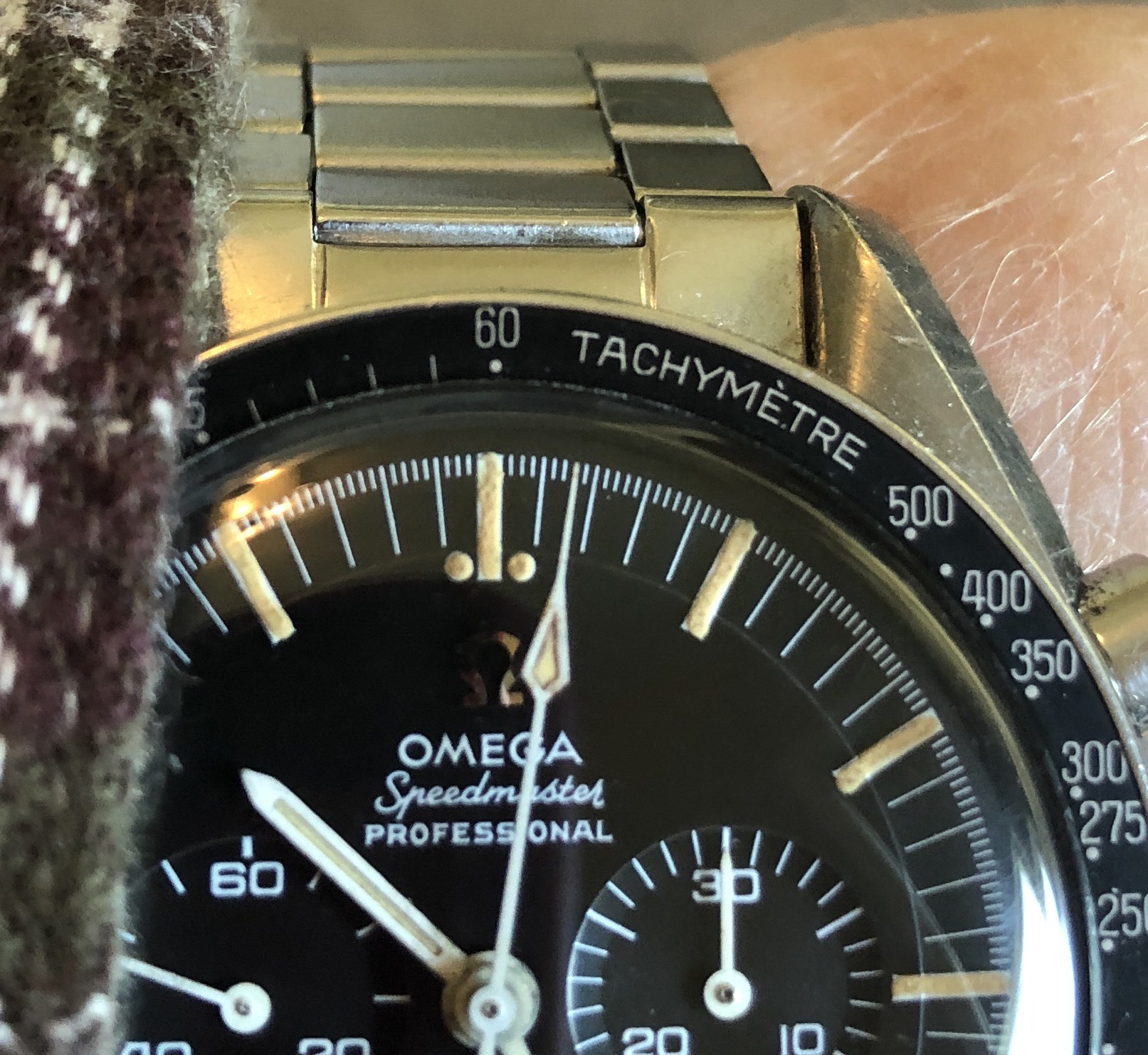 Ben, I believe your Chrono hand as well as hour and minute hands are just fine. And the watch is a gem. I can’t help with what a vintage buckle might befor this era, but the rich chestnut color of that padded strap compliments the watch very nicely IMHO.