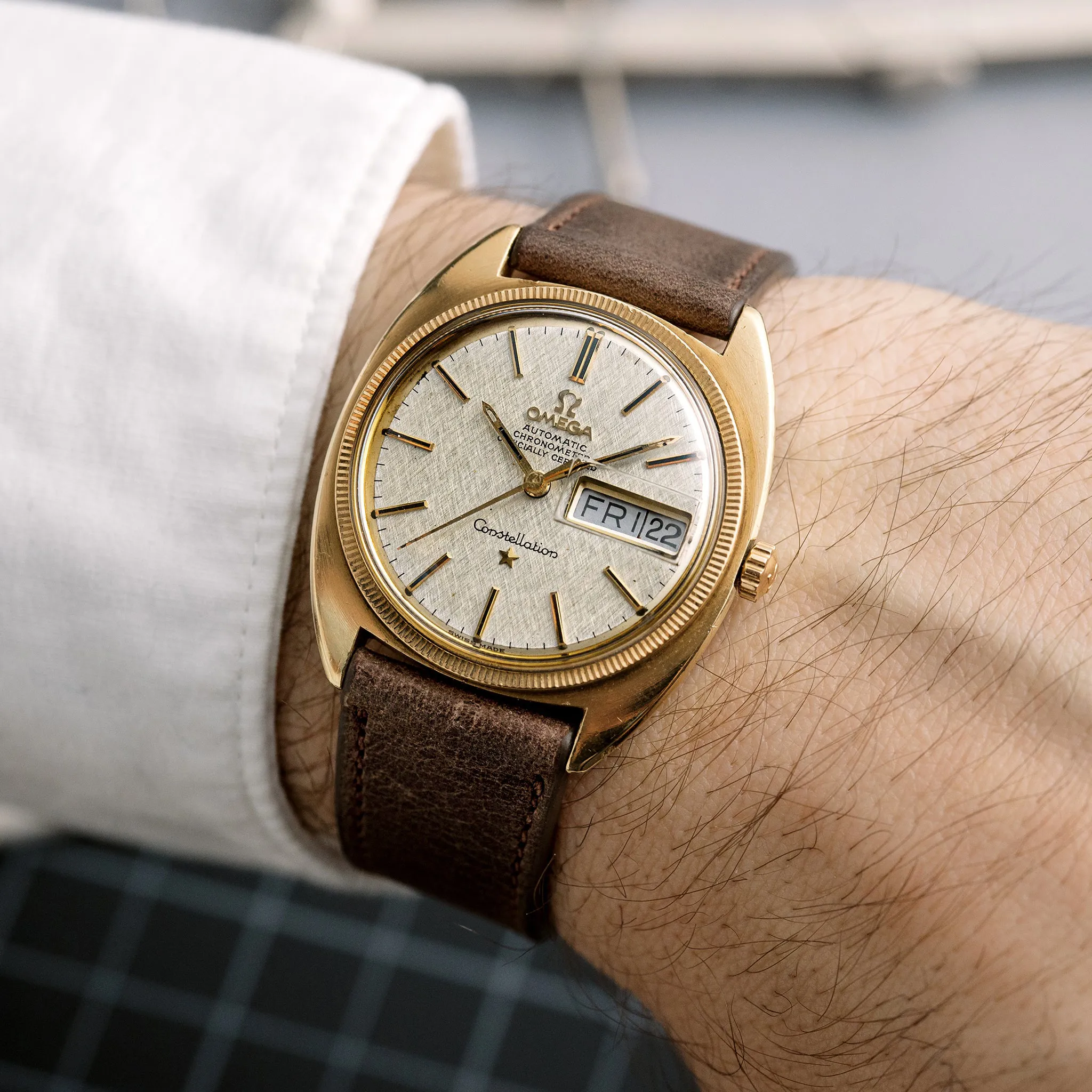 I was wondering if anyone could help me to understand which original crown I should purchase for my recently acquired Omega Constellation 168.029 yellow gold capped. Currently a different crown is present which is not usual for this Constellation. Please see some pictures below.
