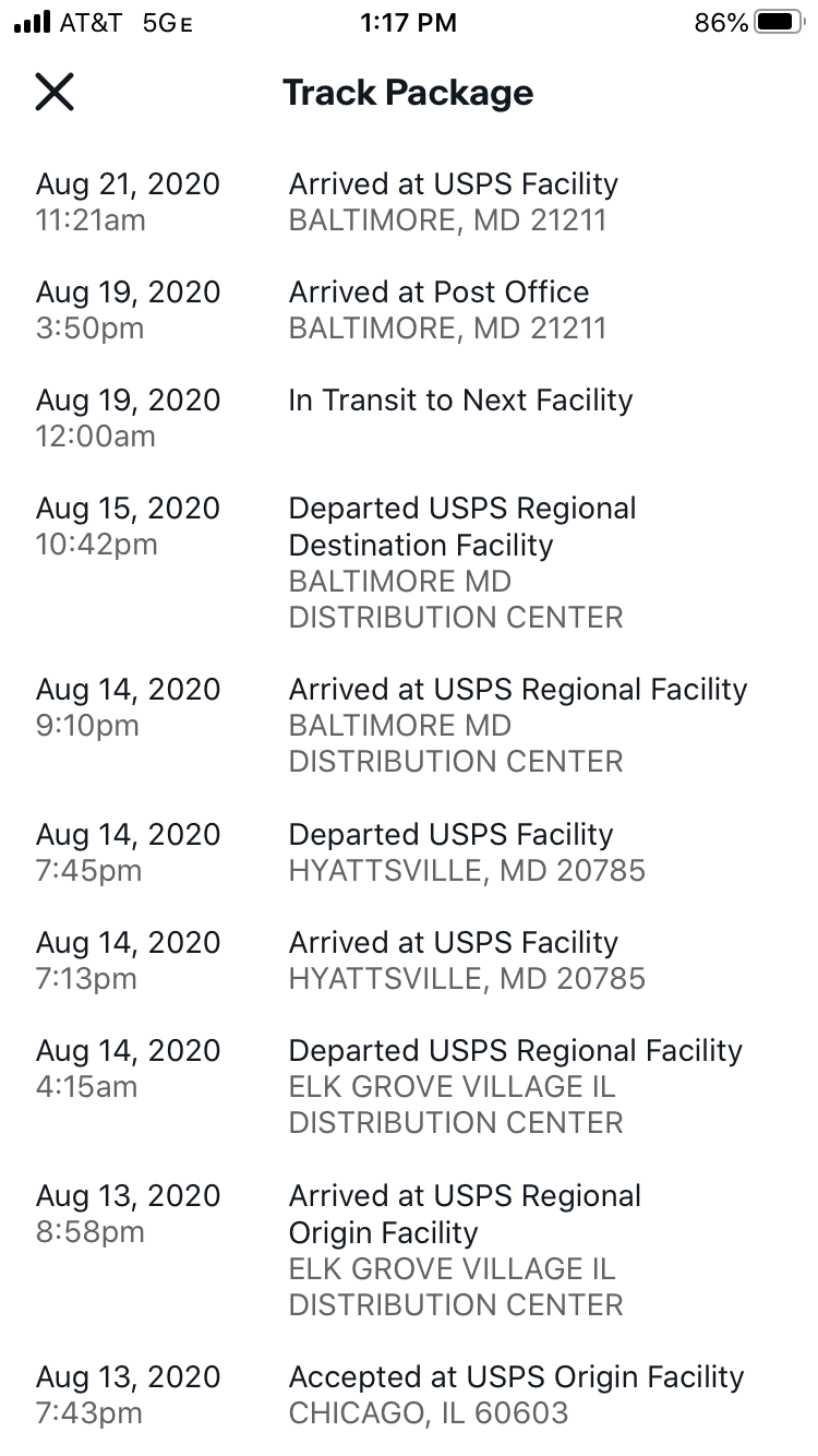 ·Your package will arrive later than expected, but is still on its way. It is currently in transit to the next facility.
