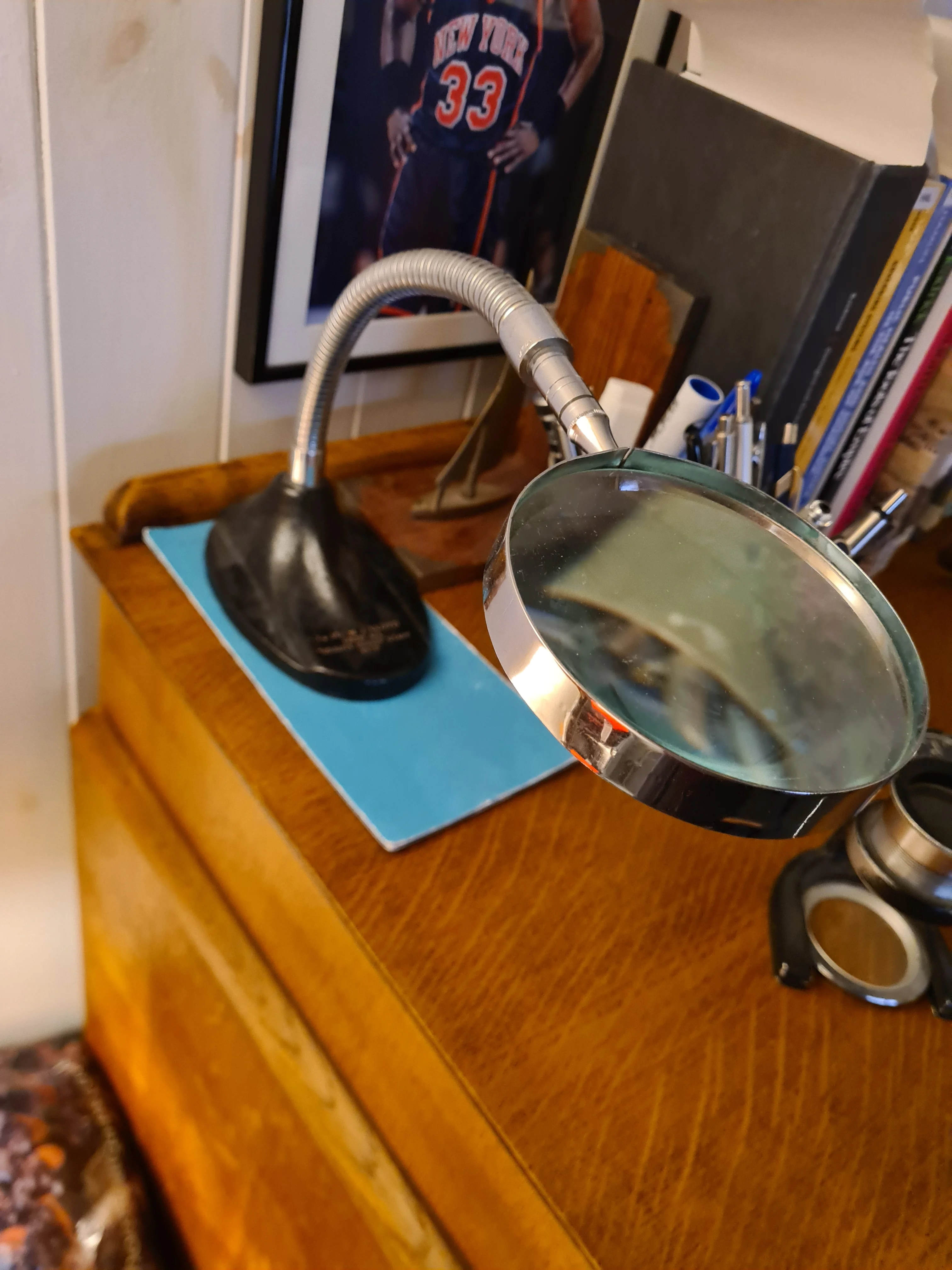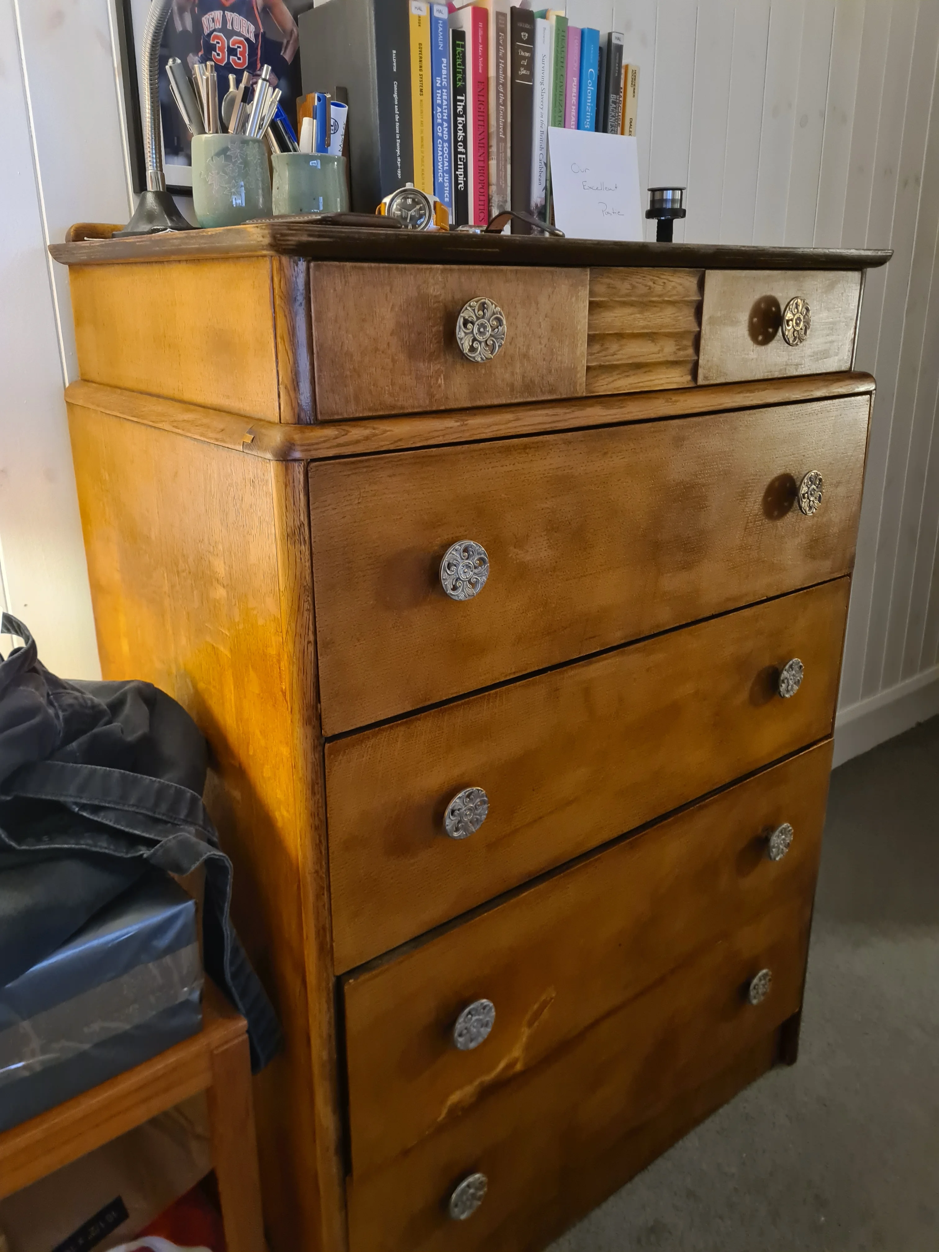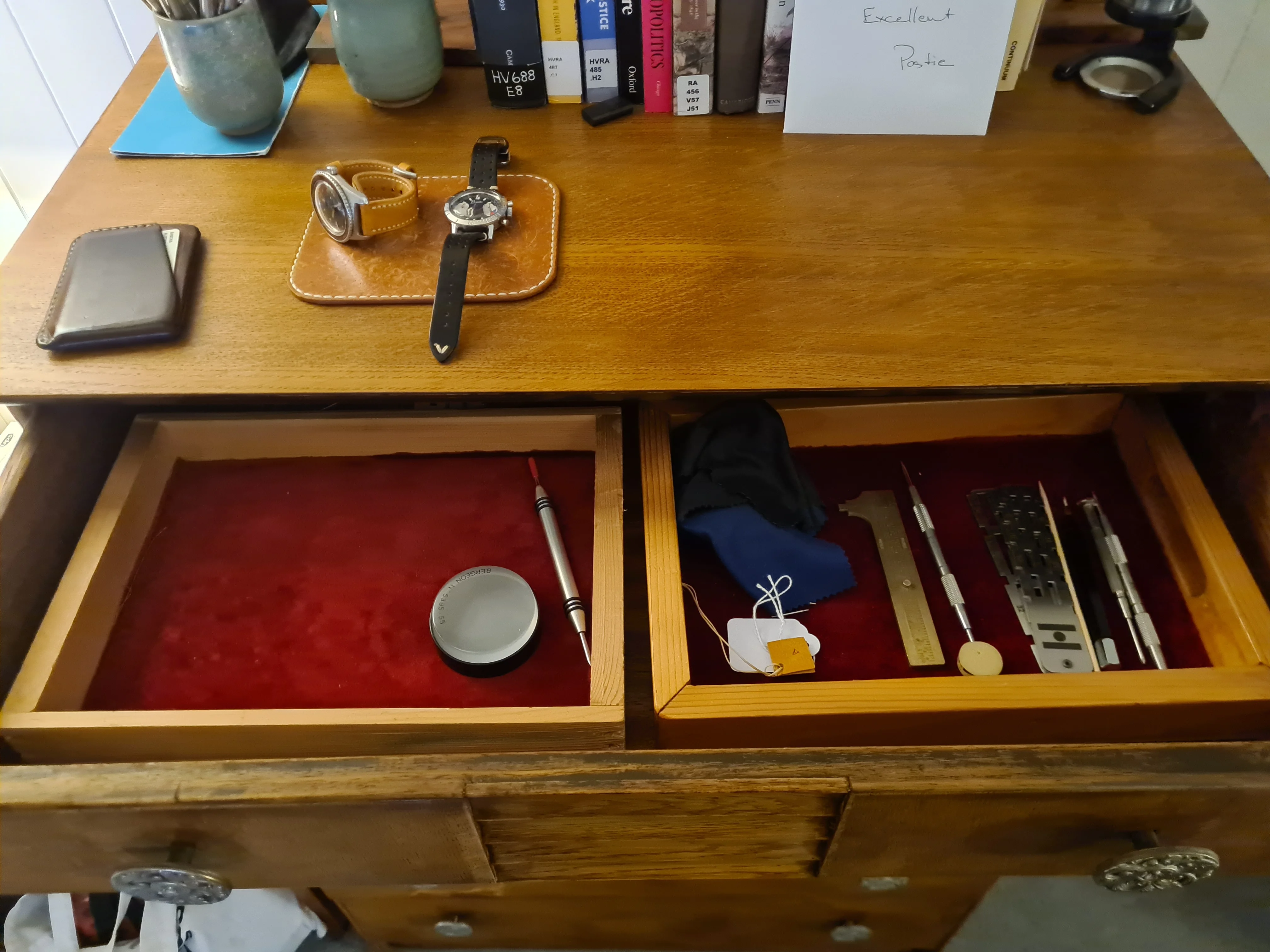 路As what is almost certainly my best holiday gift ever, my partner sourced a mid-century dresser, restored it, and customized it into a watch-cabinet and workstation. This involved the usual sanding and re-staining, along with laboriously cleaning the brass pulls (which were black as pitch on arrival_, installing a massive removable watch tray for the collection, and, as a final touch, sourcing vintage jeweler's trays for the top drawers. And all this was done by someone with no experience of furniture restoration!
