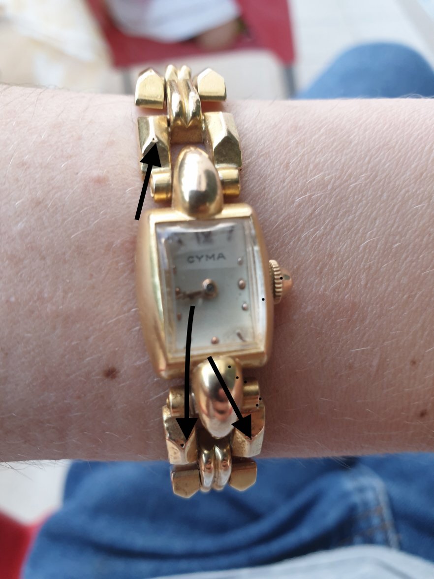 ·Worth more to you if you keep it than it would be to anbody who might make you an offer on it. The links on this bracelet are hollow. See the image. I have included three arrows pointing to places where the thin outer links are worn through! There are probably more that exhibit similar wear. Many who might make an offer might see the wear, and would temper their offer accordingly. That is another way of saying the offer might be based on scrap value, or perhaps a bit more. The movement in the case is, from appearances, in nice shape. Cyma watches of the era were well designed and nicely finished. They were a quality watch. If you keep it, and wish to have it serviced, DO NOT take it to the watch repair kiosk in your local department store! This movement is worthy of the attention of a watchmaker who appreciates it for what it is, and is capable of servicing antique mechanical watches. Keep it, and you’ll have it for a long time. Sell it and for what you’ll get for it, you’ll pi$$ away the money in a week. My guess is it is from the late 1940s, or early 1950s. The case (and likely the bracelet) are 18 karat gold. Inside the case back, see the stamping .750. The equivalent of 75% pure gold.