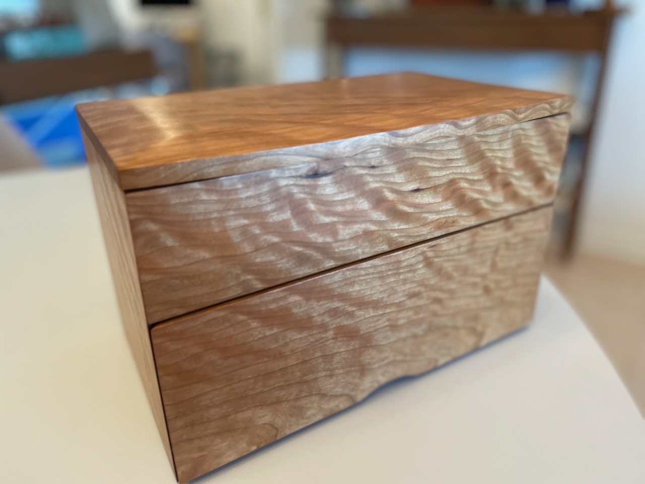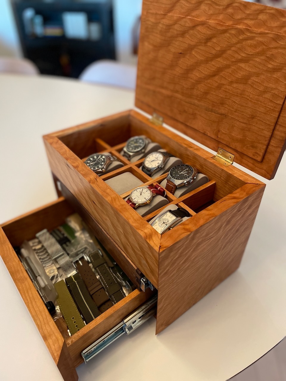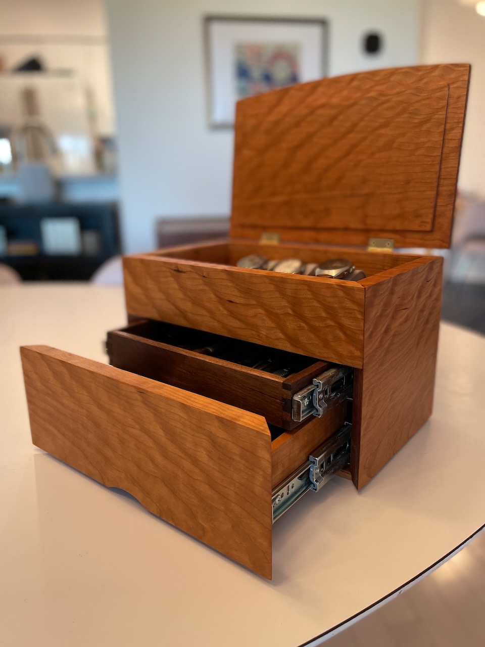 Here's a few photos of the box I built up from some lovely cherry last summer. Joinery is all double blind mitred dovetails. And I've added another tray for tools. The drawer glides are too much for a box this size, but am pretty happy with it. Of course, I've filled all 12 slots, so I might need to think about the next one!