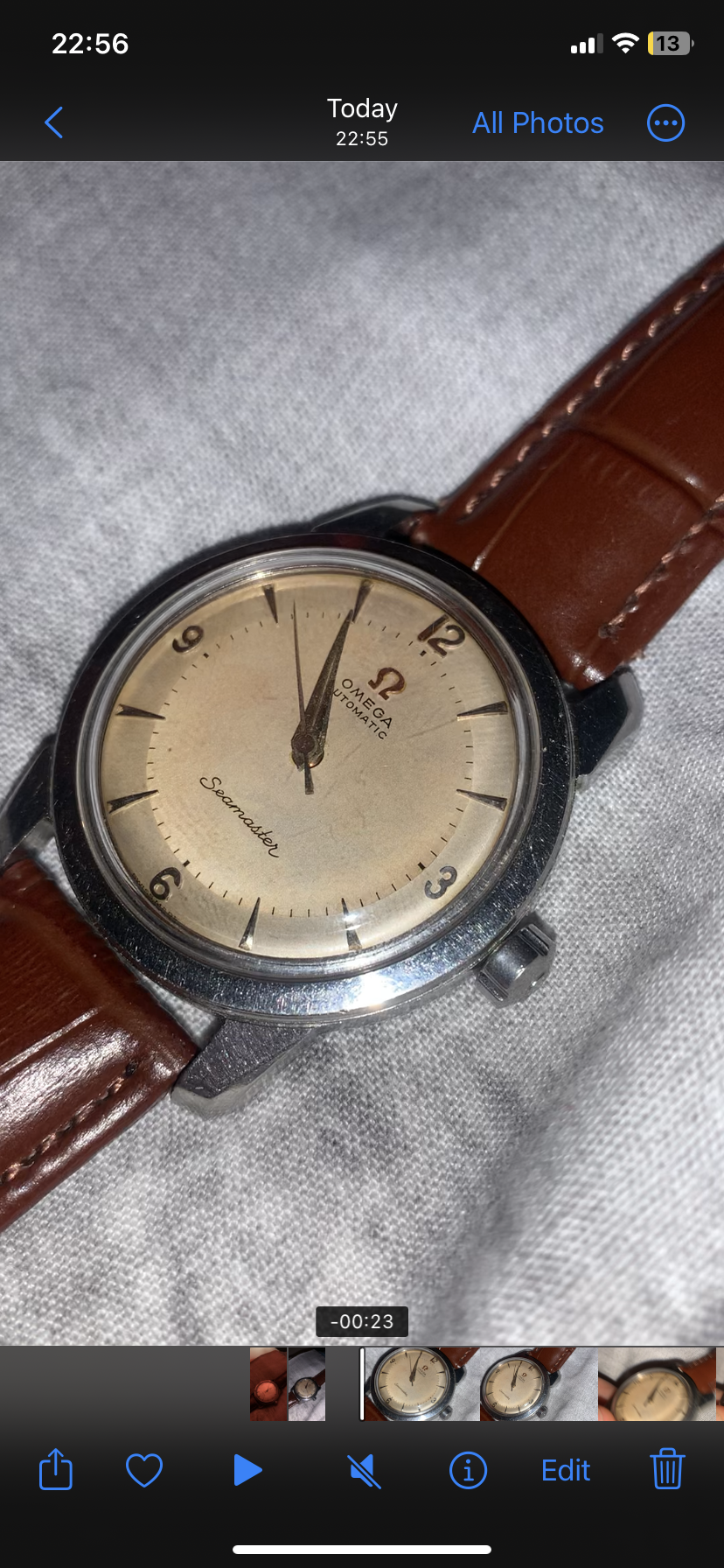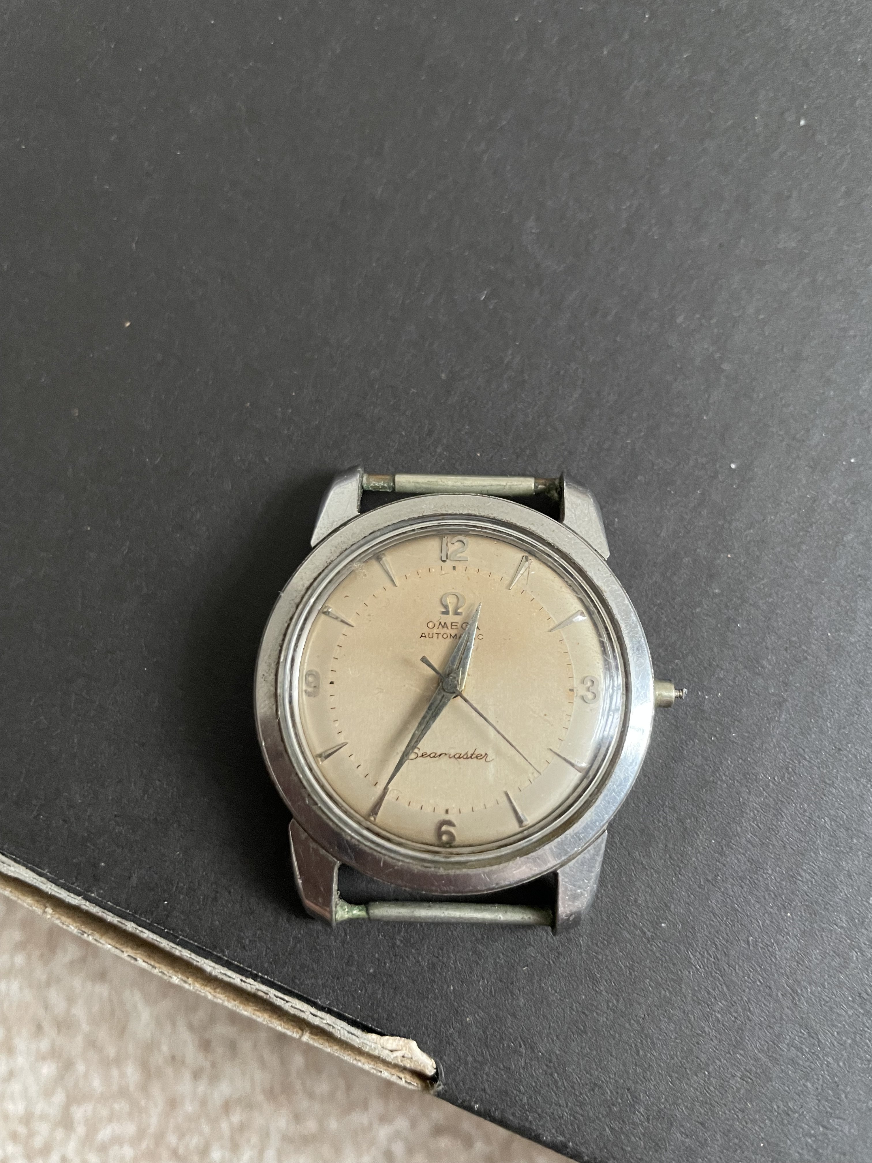 I have however had a major mishap on the dial. In an attempt to gently clean some specs of the dial (I KNOW IT WAS A BAD IDEA AND I AM PAYING THE CONSEQUENCES) I used a lightly damp cotton bud and immediately, immediately upon the water touching the dial, a brown material dissolved into the water and some sort of paint, or coating was severely ruined. In an attempt to make the dial more uniform, I decided to cut my losses and continue to remove the brown layer. This previously showed the patina of the lovely 50s dial.