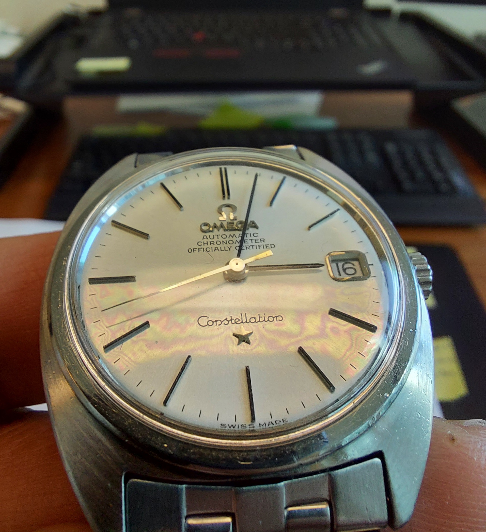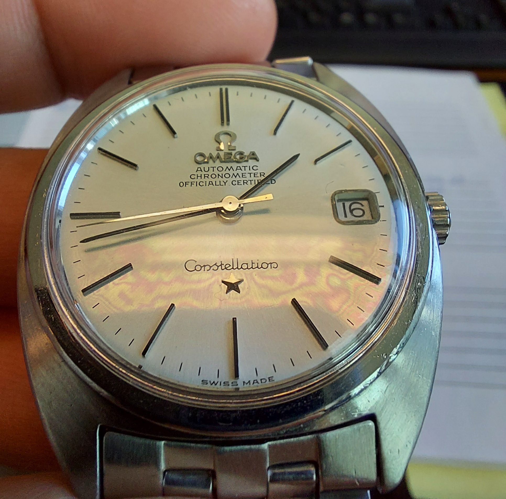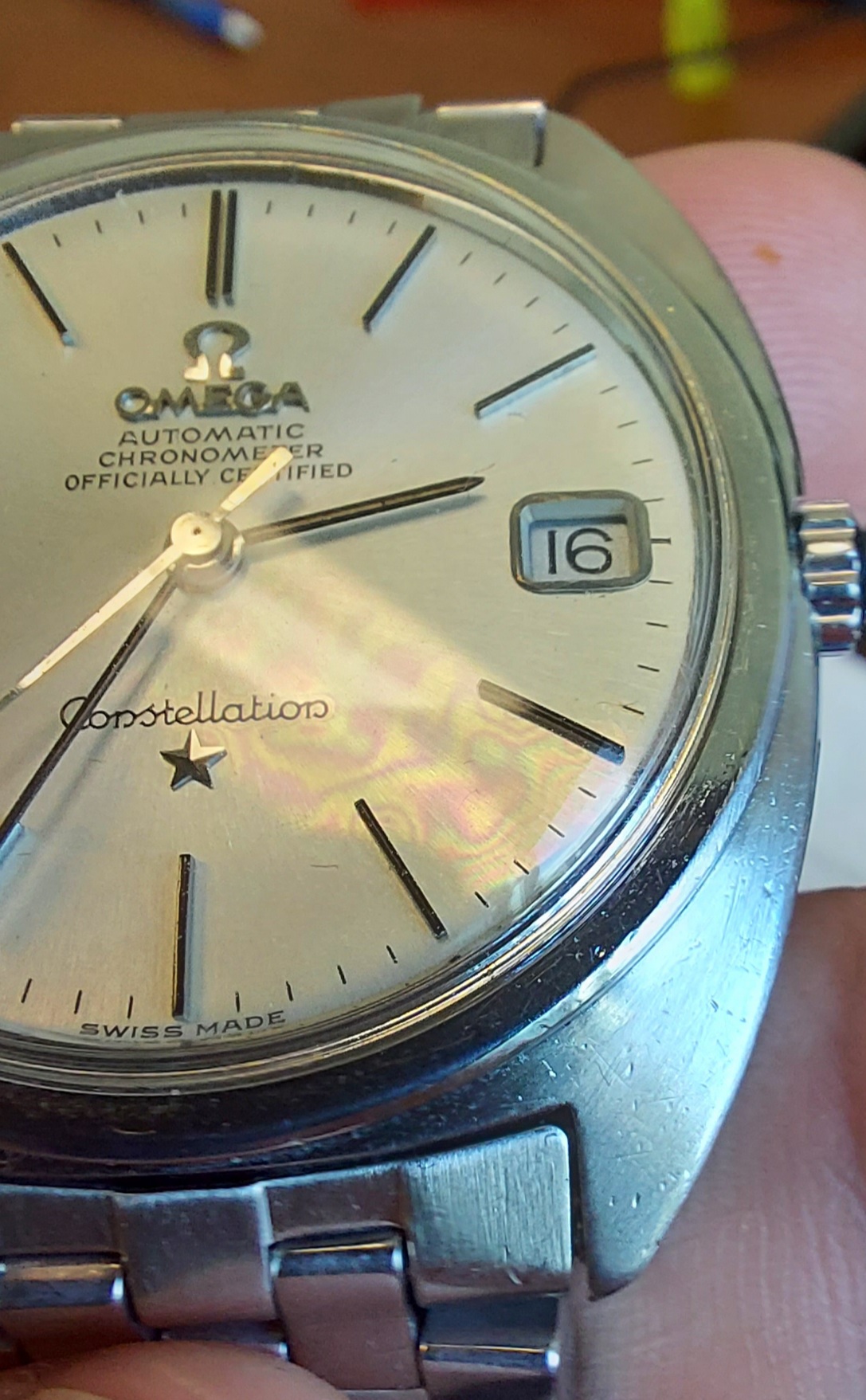 I bought this C shape Connie a while back and it's been sitting until I finally had it serviced recently. As I'm wearing it now I noticed that the dial has all these pearl like markings all over the dial that are only visible from certain angles and in certain light. Initially I thought the markings were on the crystal but I'm pretty sure it's the dial.