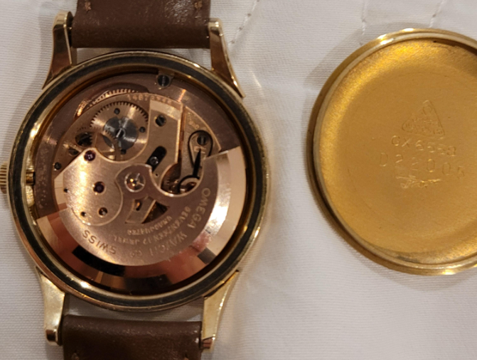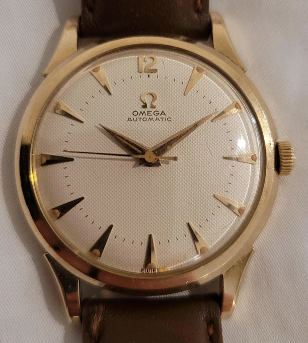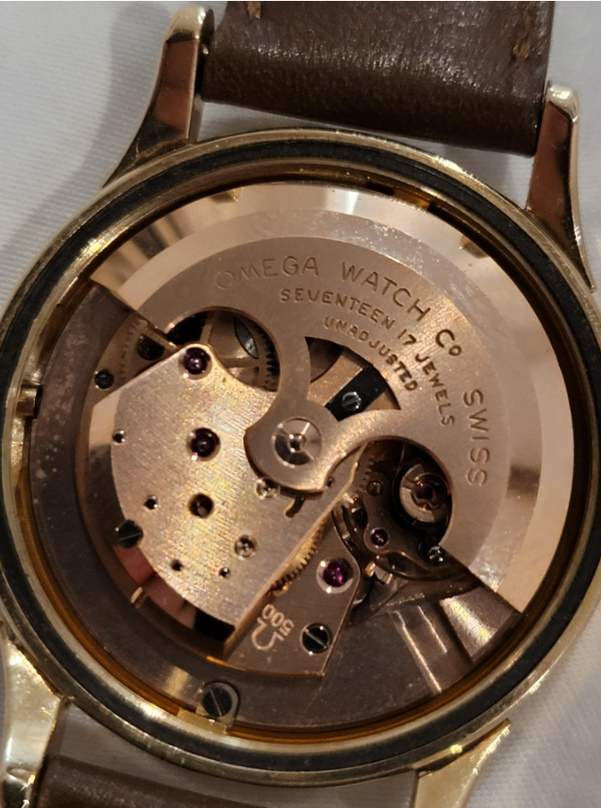 1957 Omega GX6558 14K Solid Gold with Cal 500 - all original, scratch at 3 is on the crystal not dial, small stain near swiss made on the dial. Question on the Call 500 stamp on the movement - I have seen it in other locations, but this one looks different. Waffle dial - are they as collectable as smooth dials?