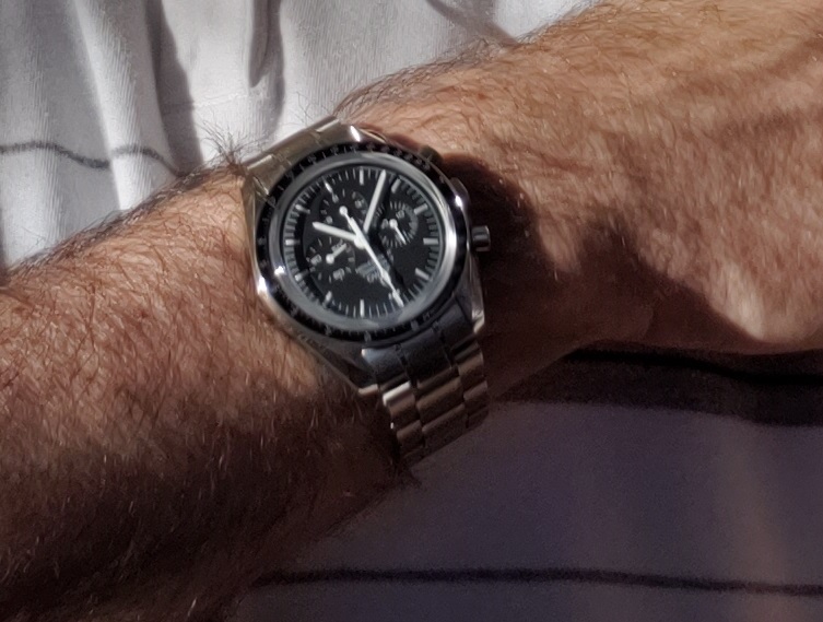 ·I am (by American standards) a thin guy with a 6.5" wrist (165mm for you metric types) which means that I have trouble pulling off a large watch. I had to get rid of my fabulous DSOTM speedy because at 44mm it just dwarfed my svelte waif-like arms. This is me with my 42mm Speedy Sammich that I'm wearing today: