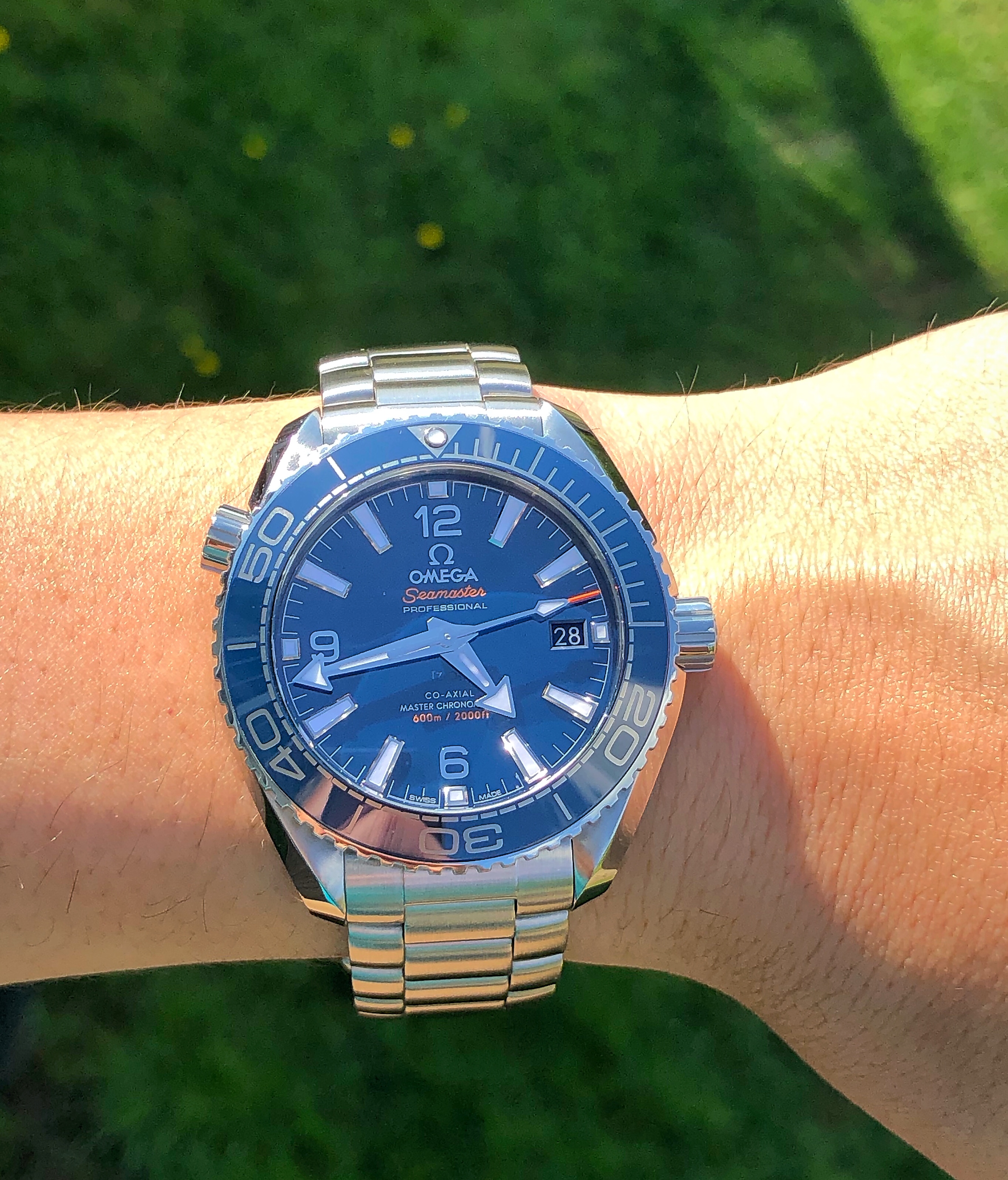 So, now I'm leaning toward the planet ocean. I like the kind-of subtle orange highlights, especially on the strap with orange stitching. My wife said that it looks "interesting" which is her way of saying that she doesn't like it, but gave me permission to get it. I don't "need" permission, but it's always polite to ask first. Pic of 39.5mm version on bracelet: