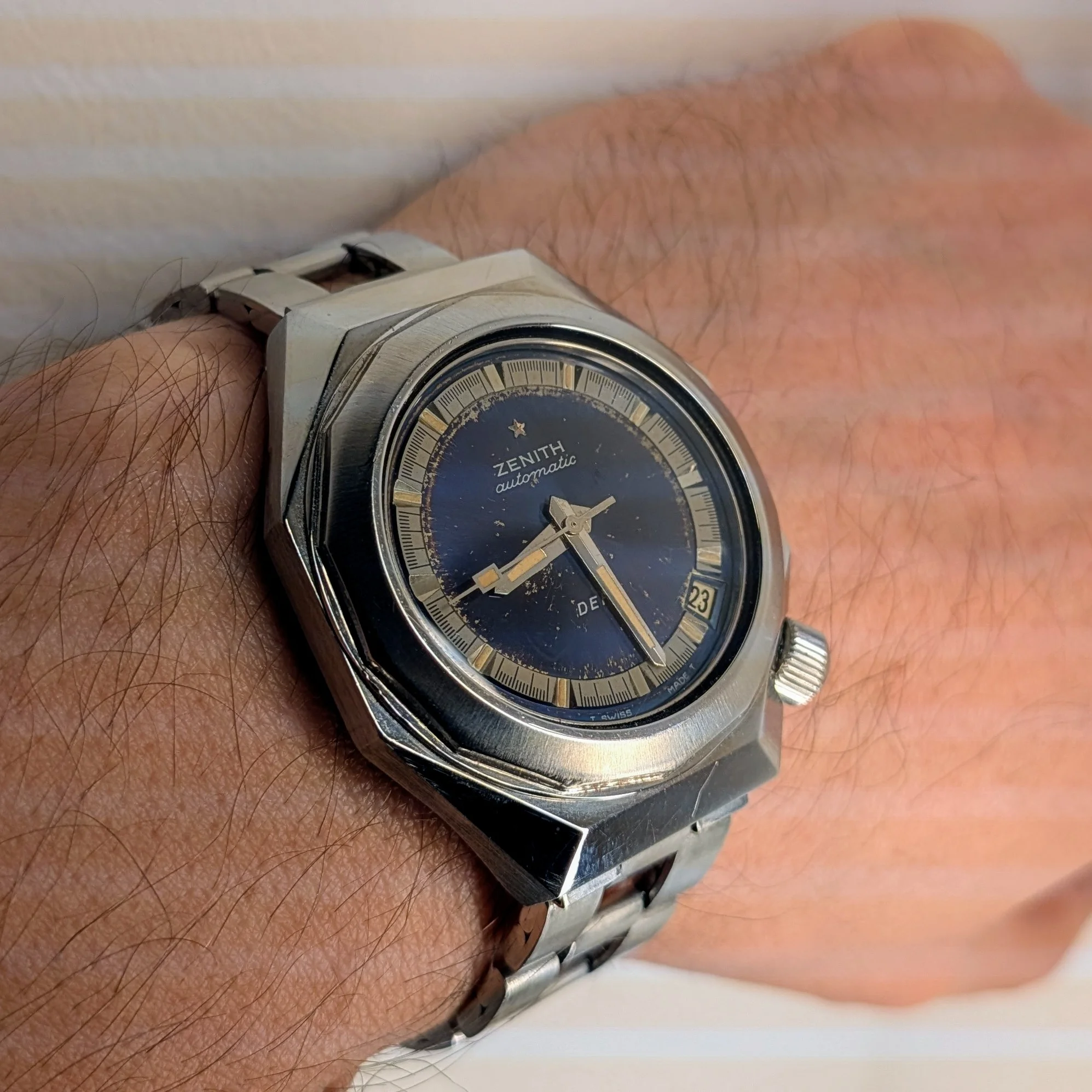 The watch runs well, has the typical Zenith blue dial patina - hands and crown are orignial with nice tritium patina and the Nato star on the crown. Case is polished but not to death (as unfortunately many of them are). Please see pics attached. If you need further details/pics let me know I'll provide them.
