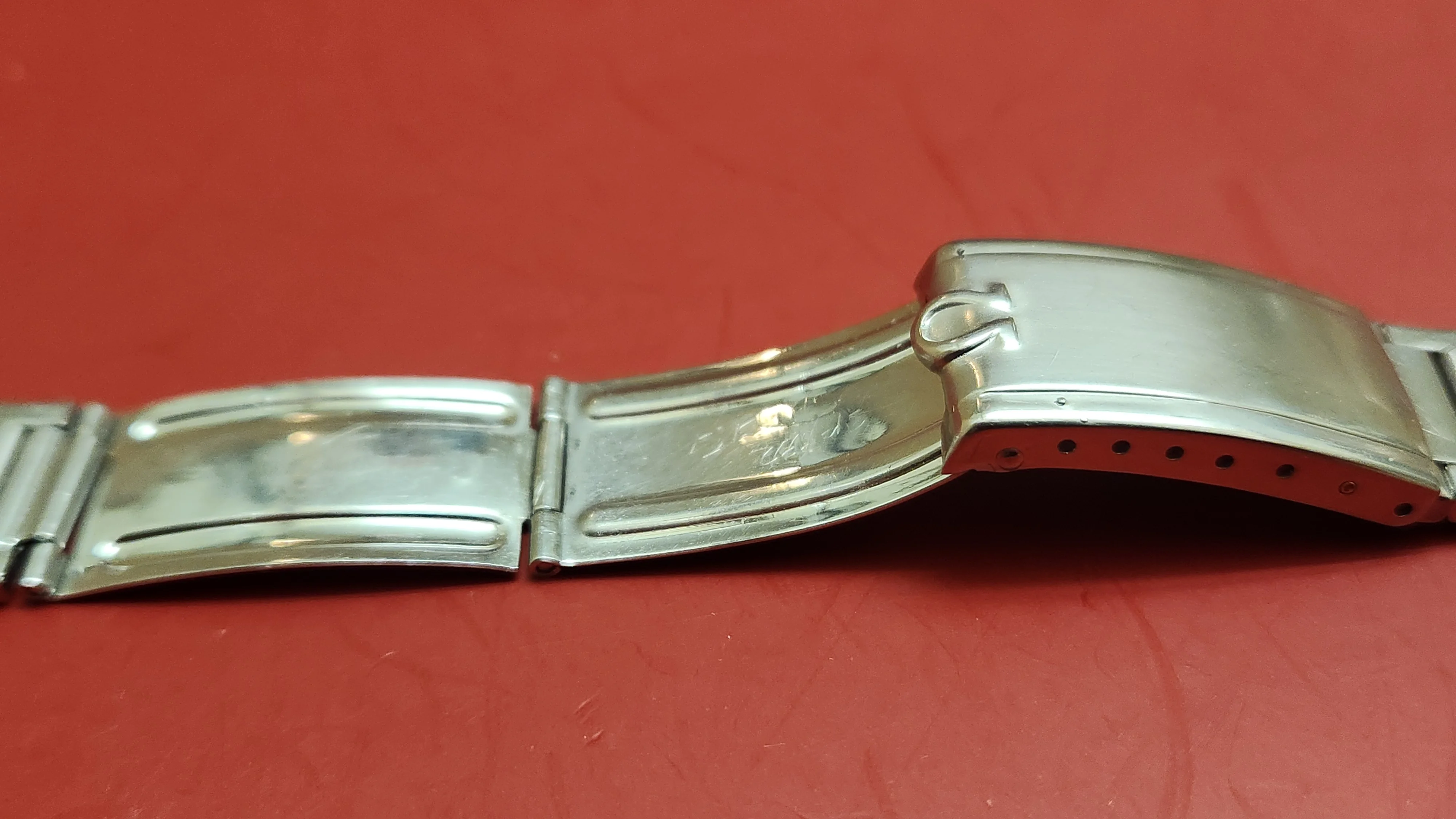 The bracelet is includes 15 permanent links (the widest terminal link has been removed from the 6 o'clock side and nicely re-installed in the 2nd link position). The clasp cover is from either a later generation 7077 or a 7912 and the clasp leafs are from a 1971 1039 bracelet. The links themselves have very little stretch and are therefore likely from a 1035 bracelet. 7 spring/stretch links are included and the springs work well. The date stamp on the clasp denotes 4th quarter of 1971 and there some minor tool marks and signs of polishing on the clasp cover.