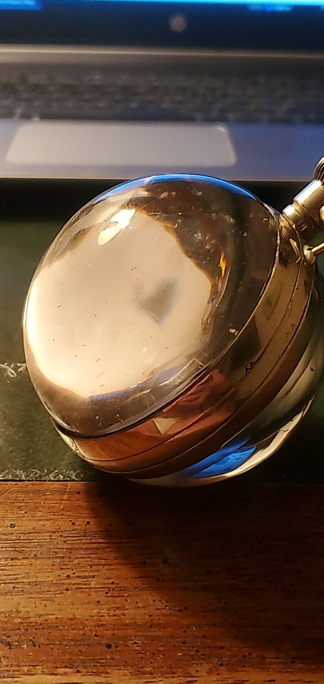 As in a pocket (and other) watch, the movement and dial are mounted in a case - with a crystal (glass) on the front and a caseback to cover the movement. With the crystal ball, each crystal hemisphere is mounted in a metal rim which in turn is pressed onto the case.