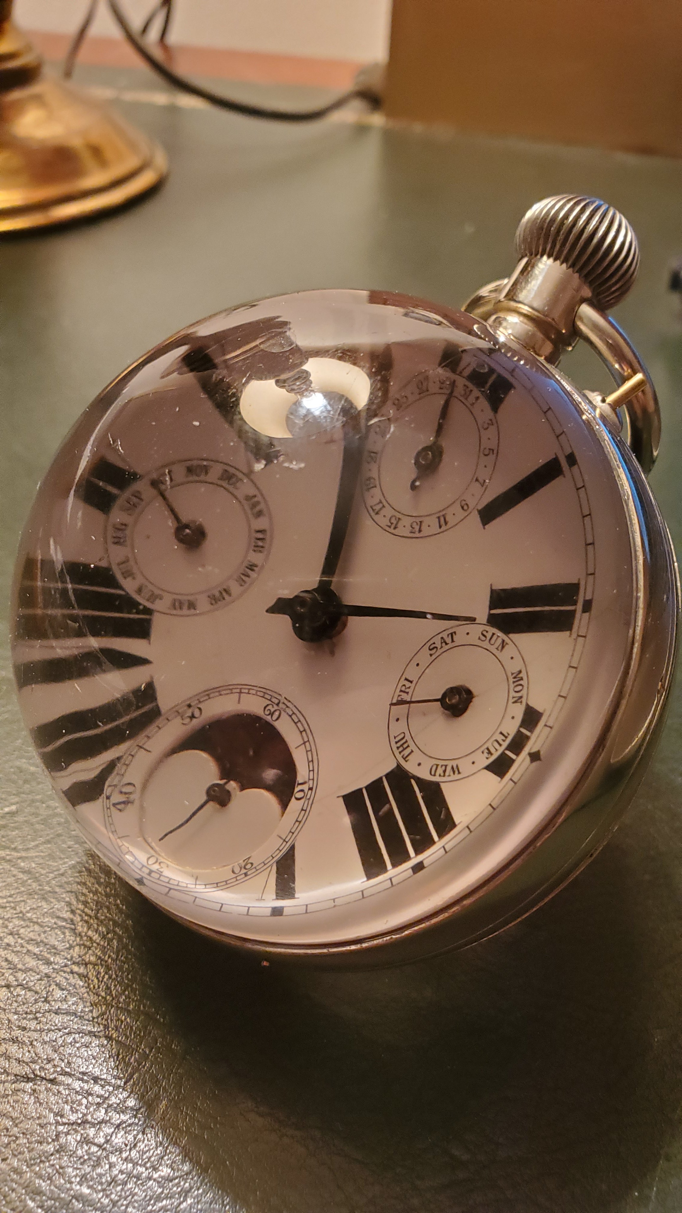 As I mentioned before, the ‘lunar’ dials were popular in the period 1890 - 1900 (based on the same movements as ‘ordinary’ dials). The crystal balls were similarly produced at around this time, for Omega a bit later. It’s just possible that you have an original lunar-dialled crystal ball - it would be very unusual.