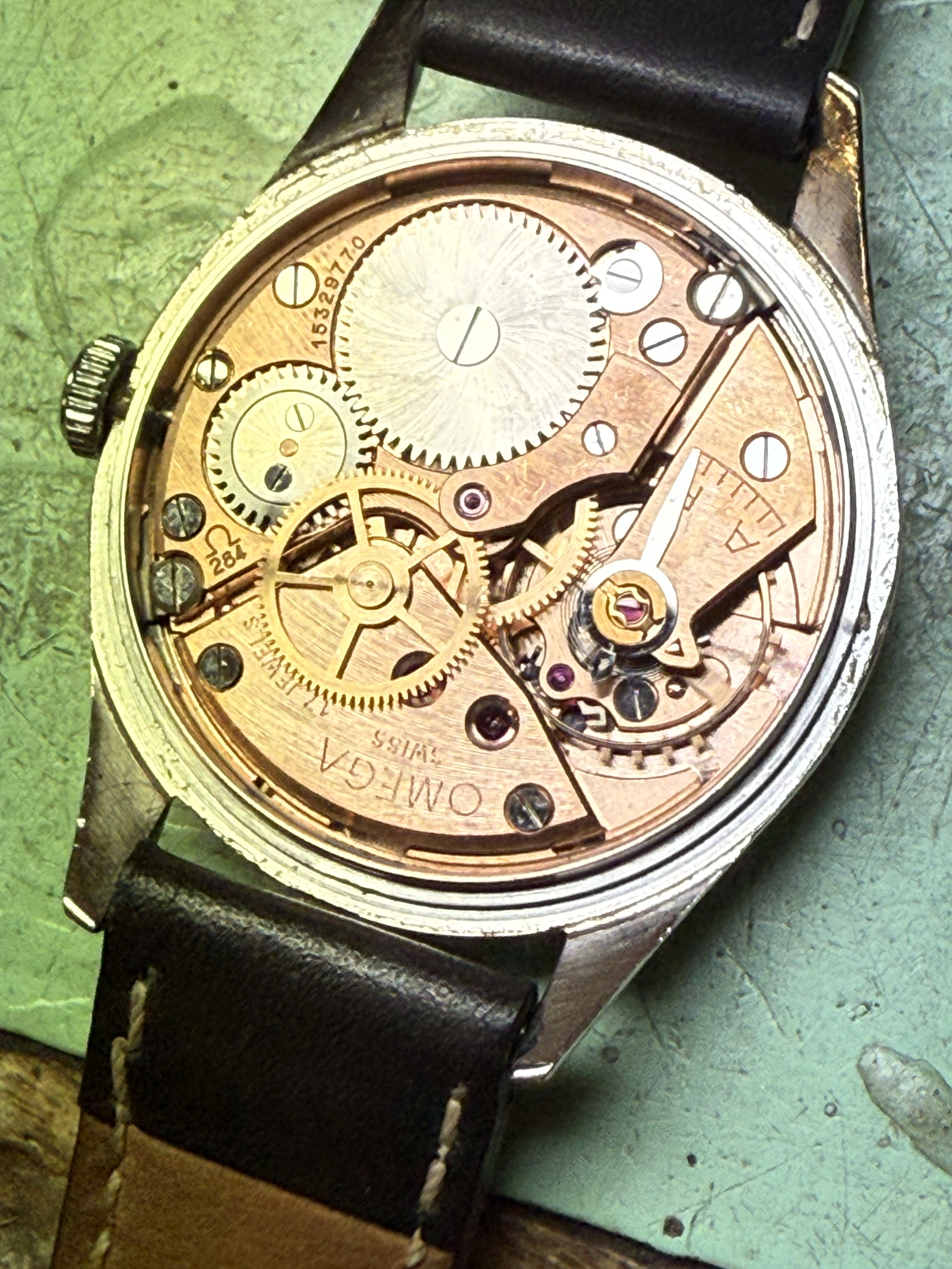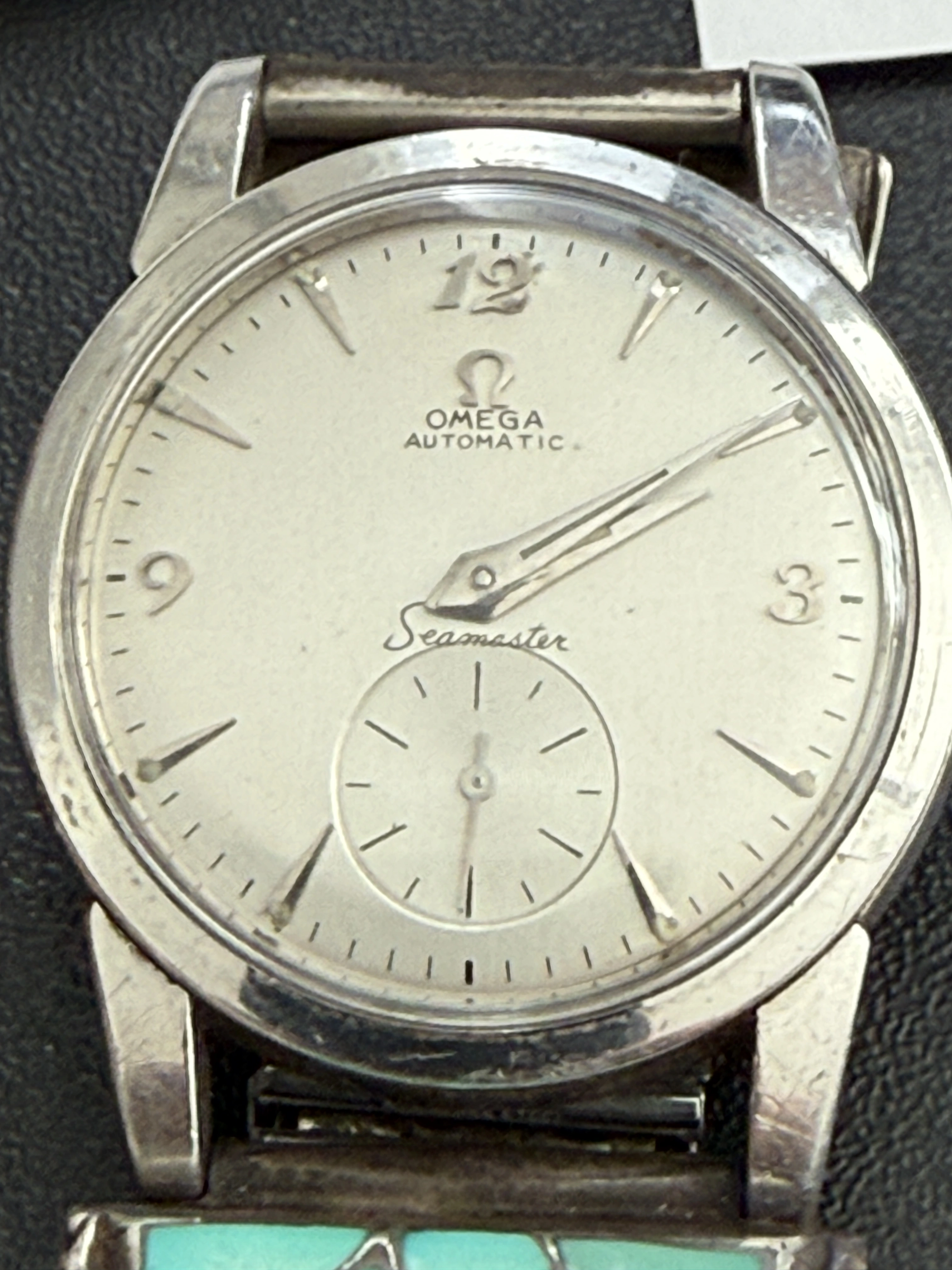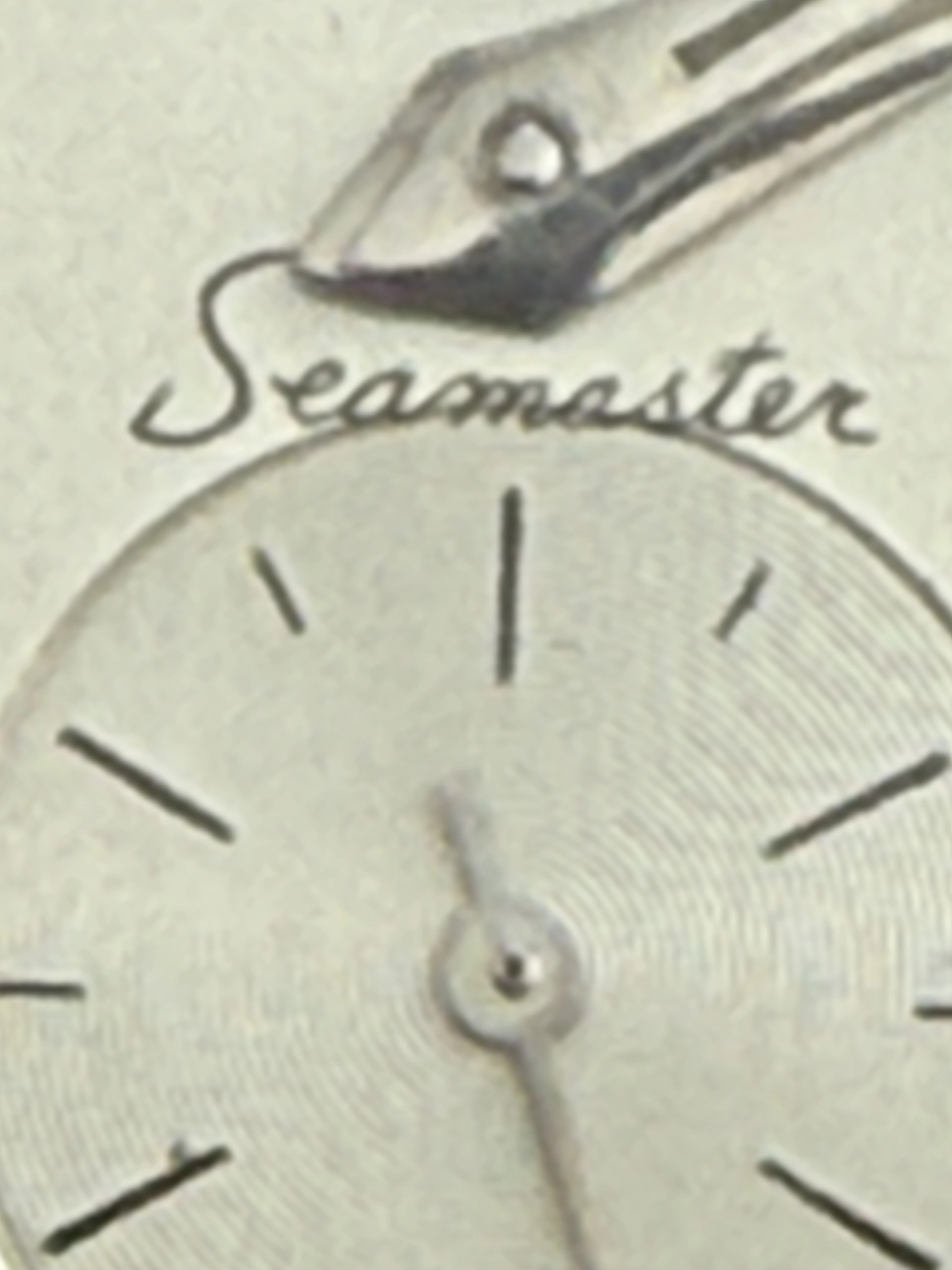 At any rate, it’s clear that the watch has been redialed, and not well. I think someone took a dial or stamp or something for the 2577 or some other reference with a central seconds and used it here, which would explain the terrible placement of the Seamaster logo.