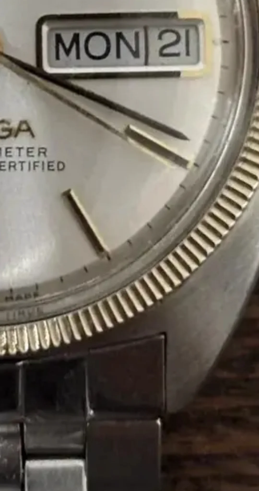 Do you think this dial is correct on this vintage omega model 168.029? It is a stainless steel case with a silver dial with gold hands and gold markers. Does the font and print looks authentic as well? I bought it from a vintage dealer who said it is all original parts, but I can't seem to find this dial configuration from google images and chrono24.