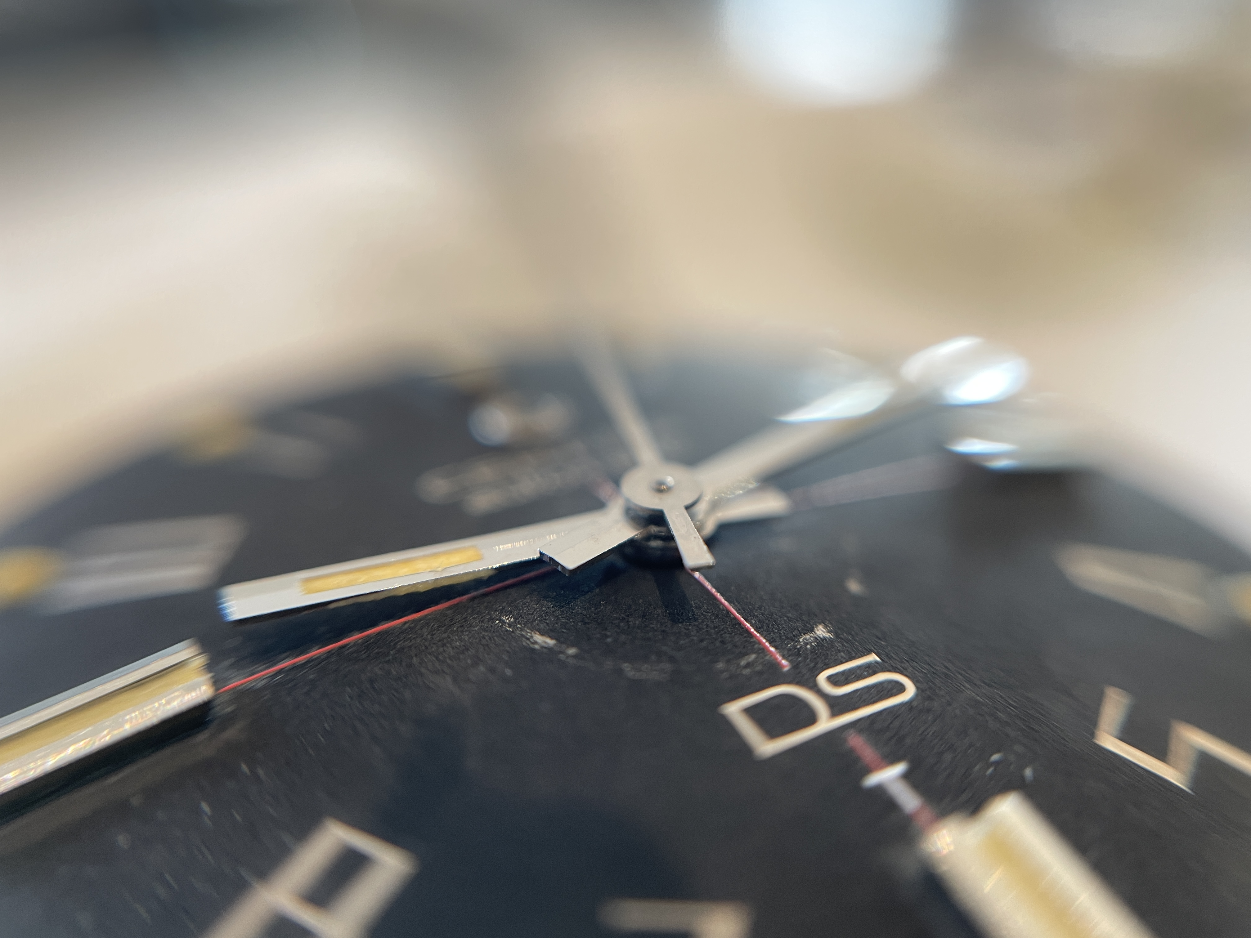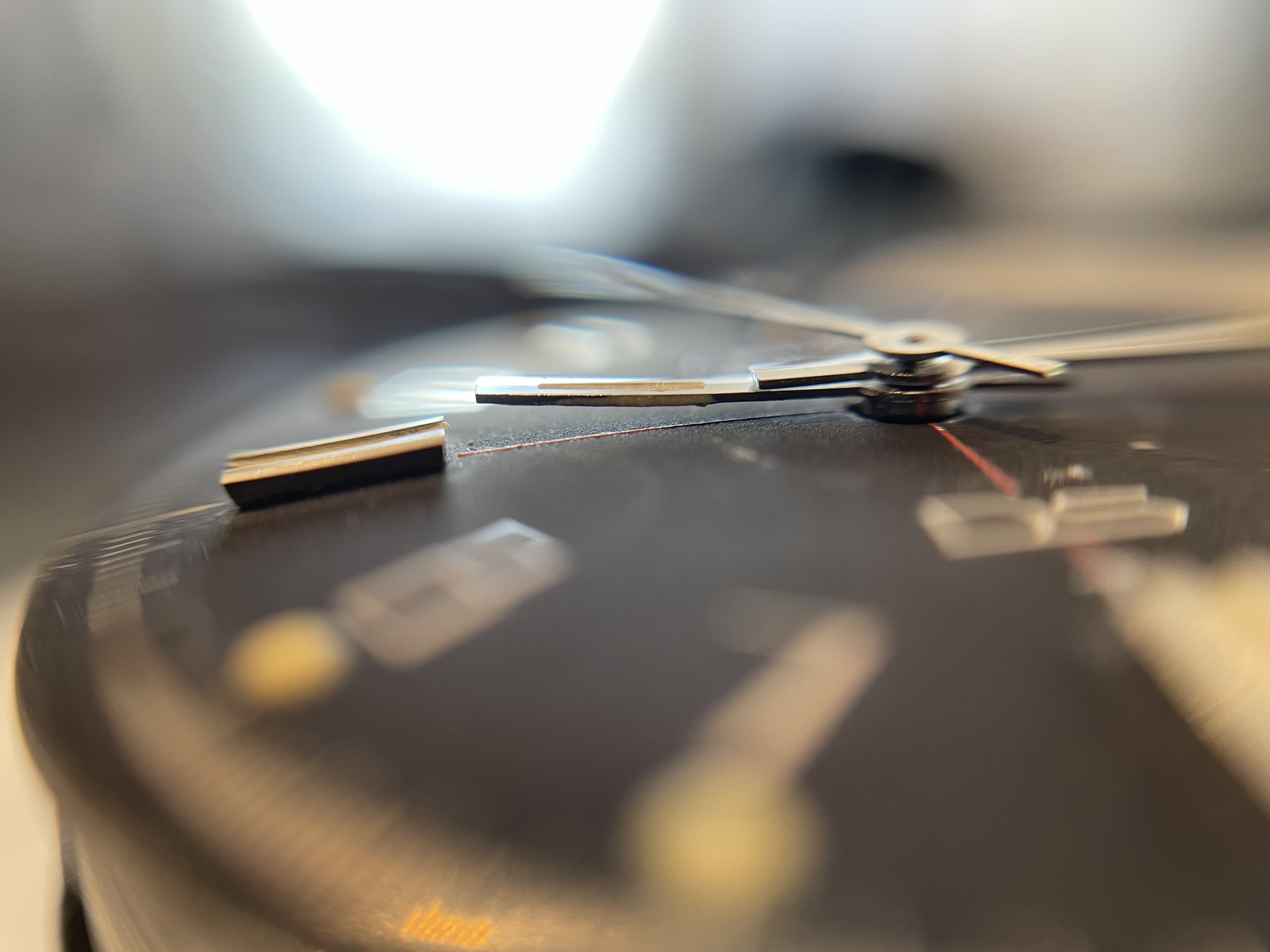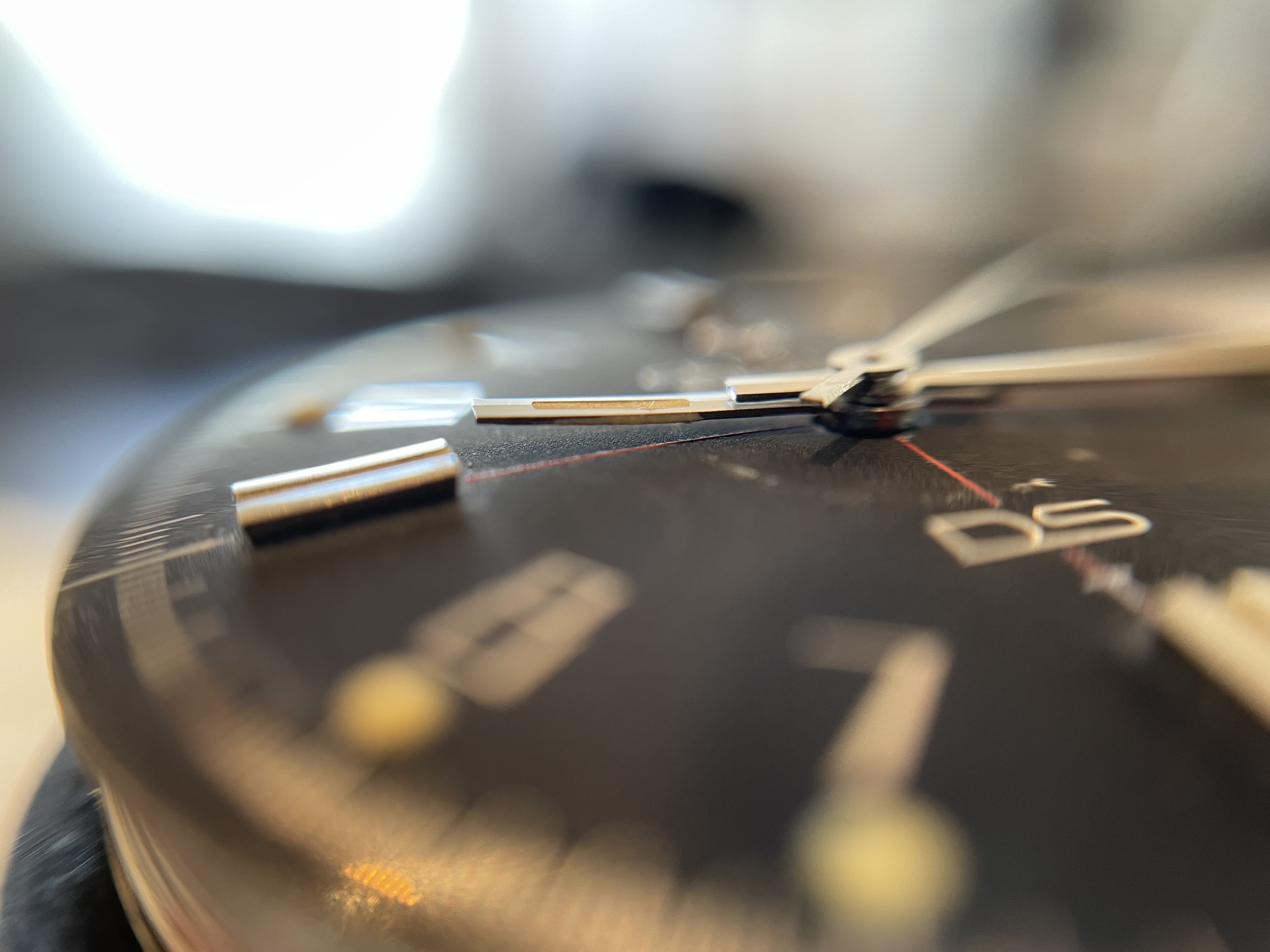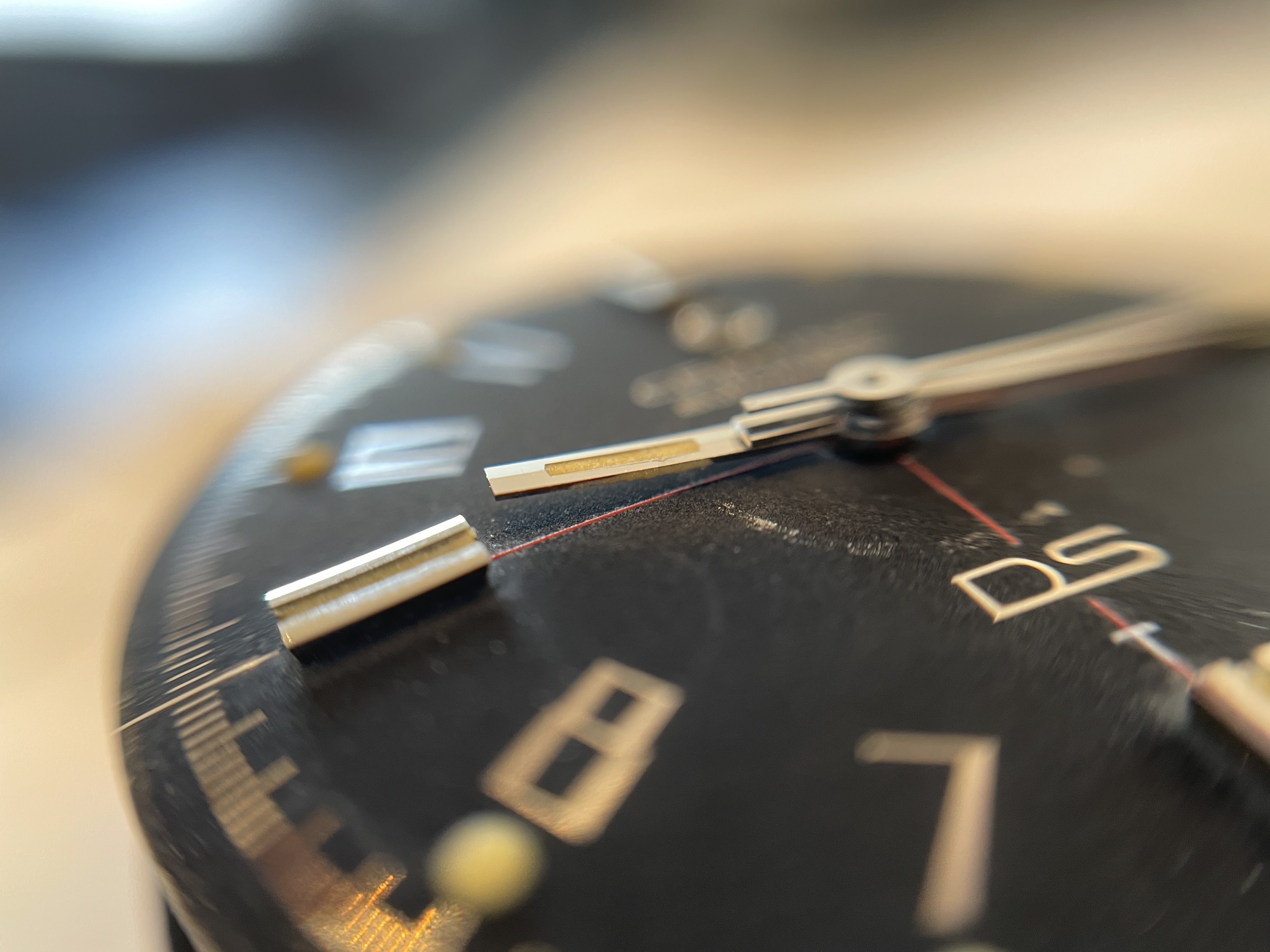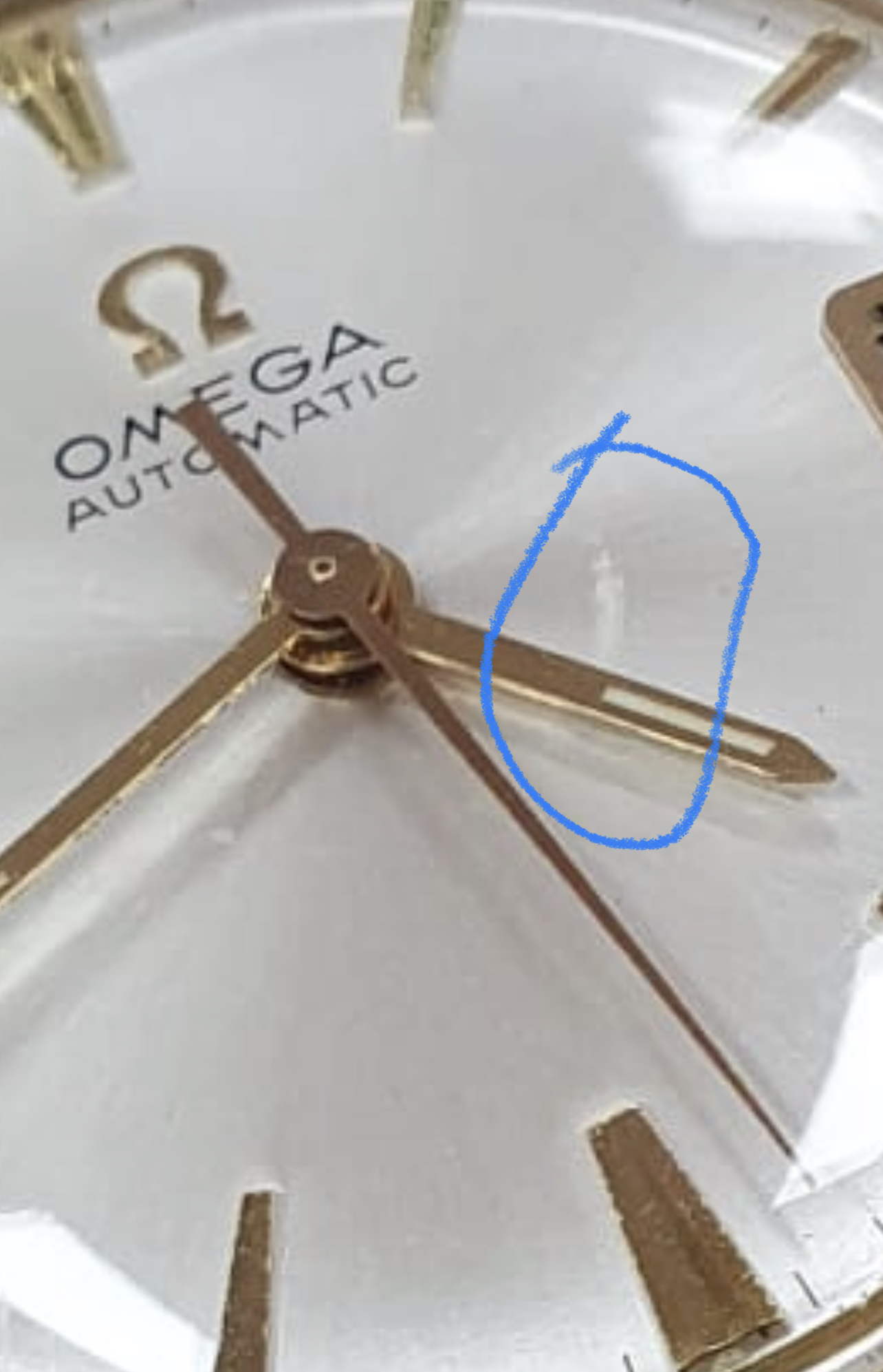 The circular mark, caused at some point, and in some way, by the hour hand, was actually present when the seller owned the watch, but obscured by a light "touch-up" job executed under previous ownership. The refinish looked good enough to the naked eye so as not to arouse attention, but, during the recent international shipping, as a result of one, and possibly more shocks, the thin layer of old, dry material was jarred loose.