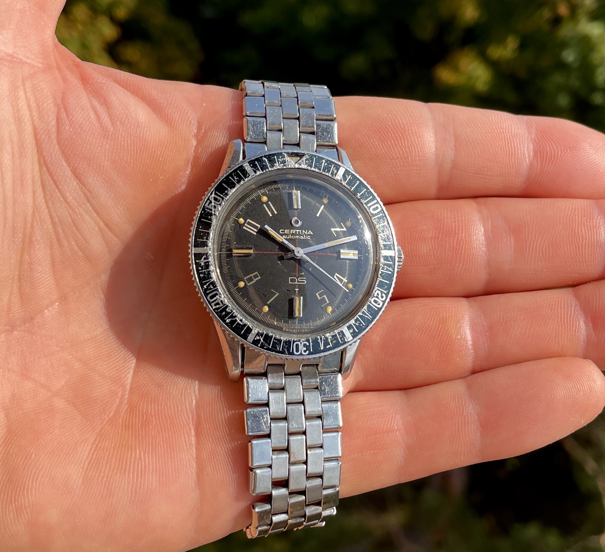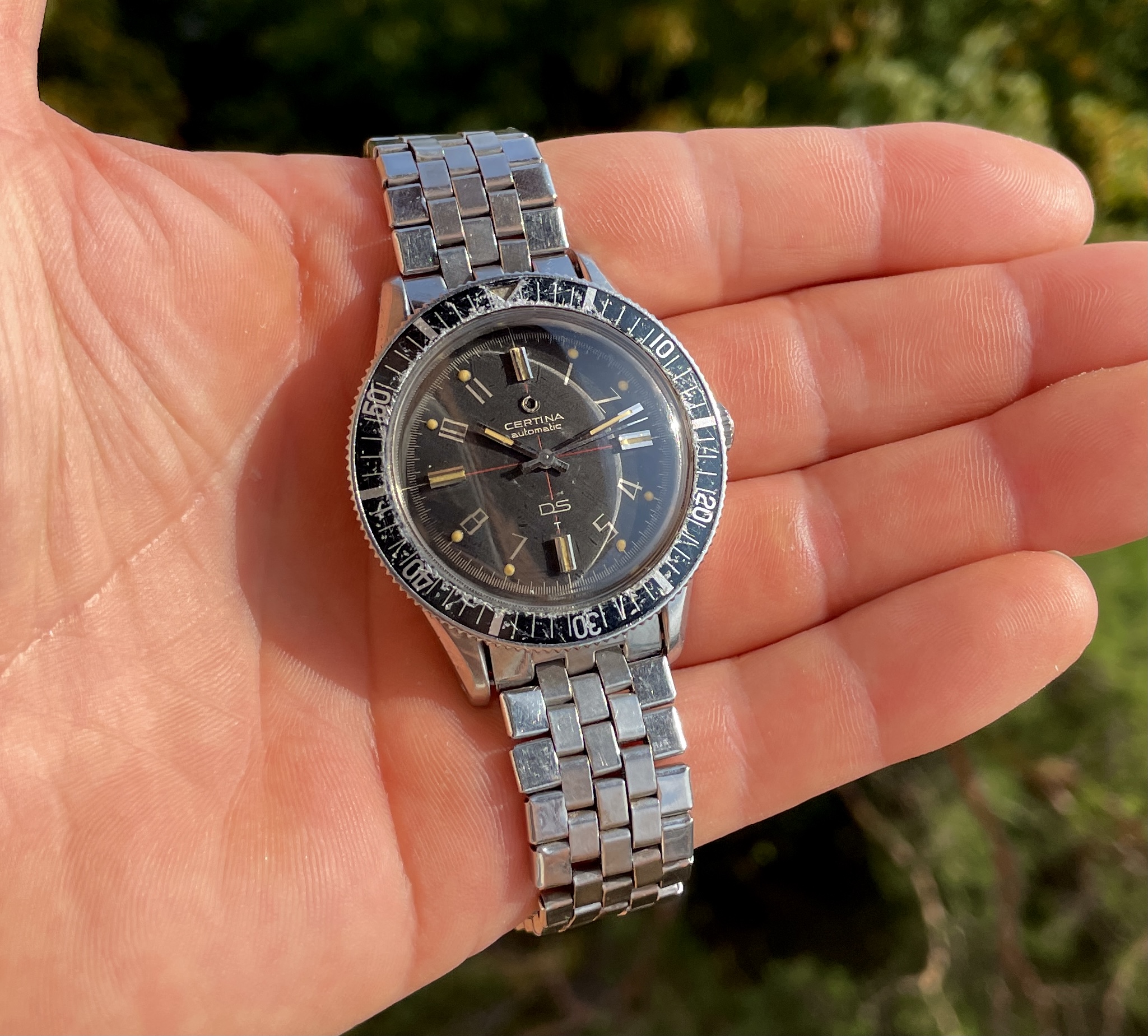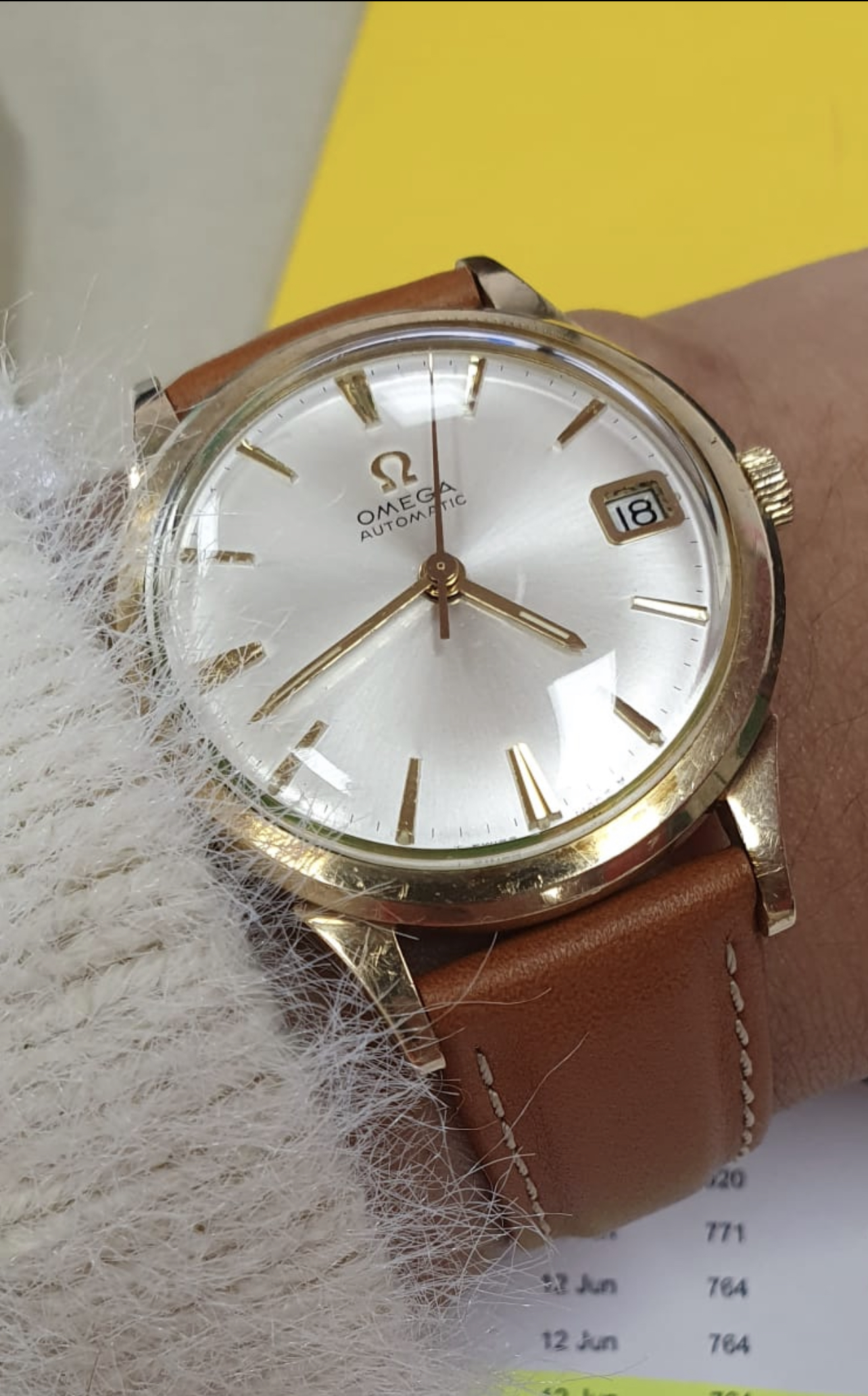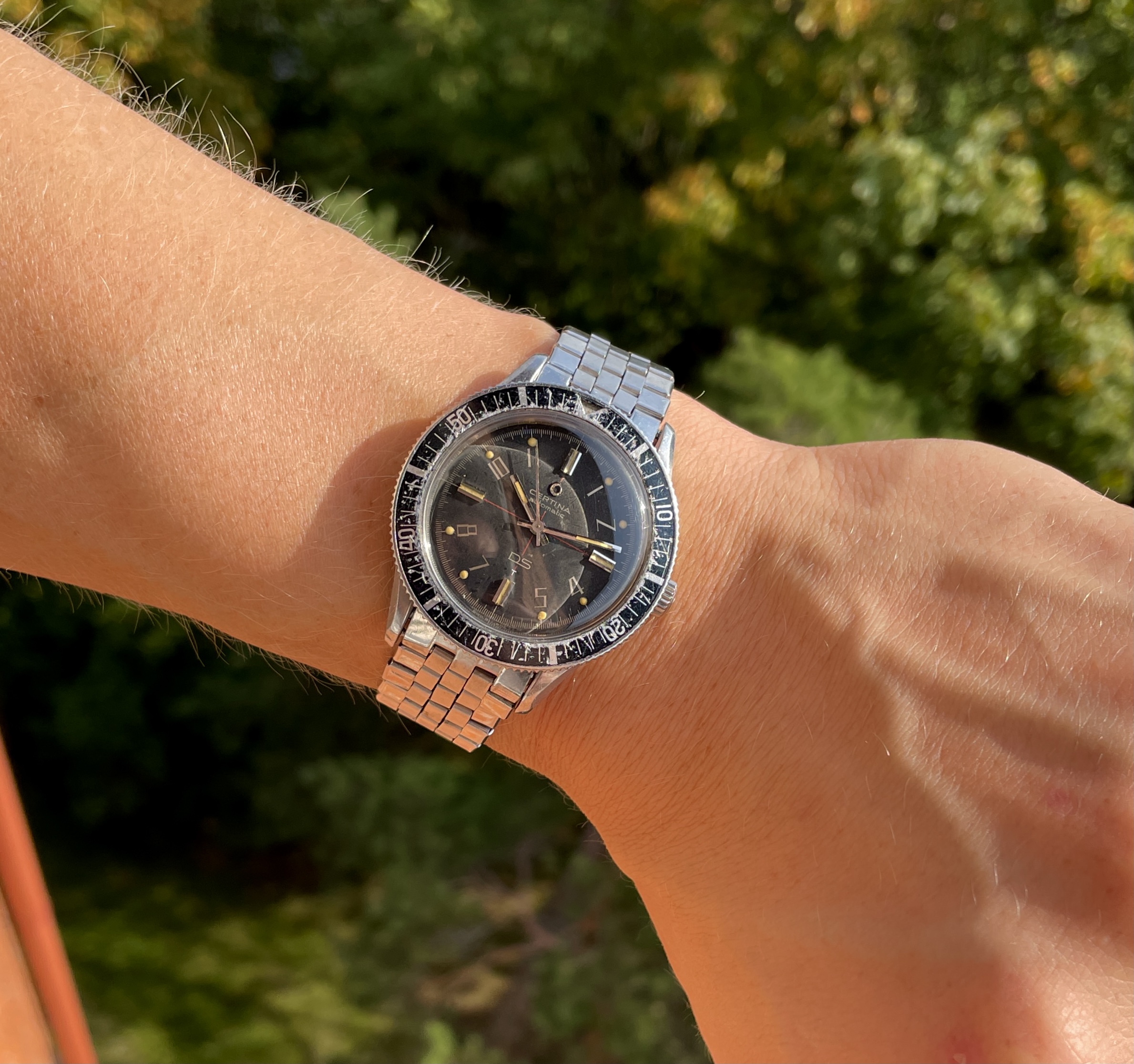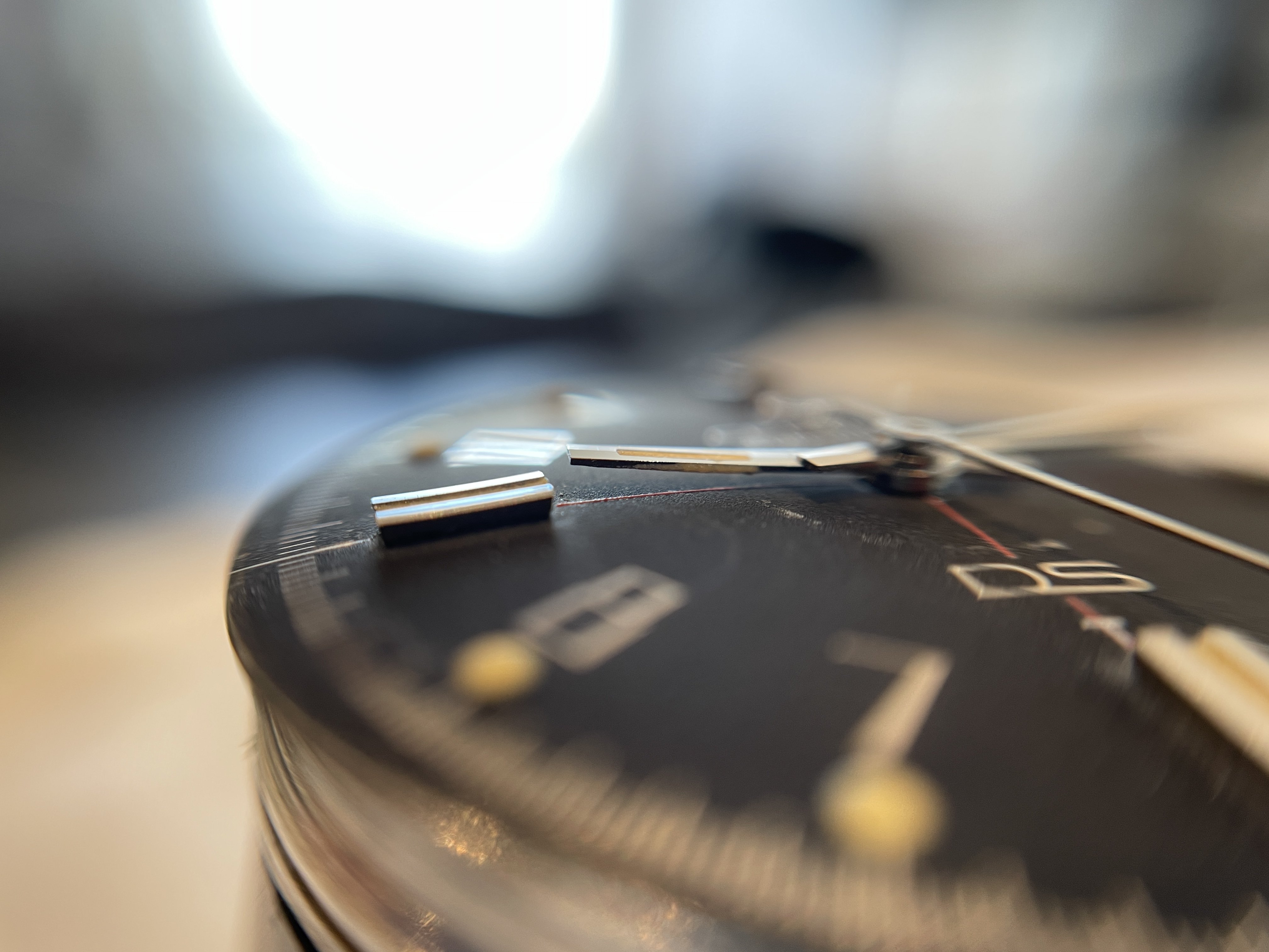 The circular mark, caused at some point, and in some way, by the hour hand, was actually present when the seller owned the watch, but obscured by a light "touch-up" job executed under previous ownership. The refinish looked good enough to the naked eye so as not to arouse attention, but, during the recent international shipping, as a result of one, and possibly more shocks, the thin layer of old, dry material was jarred loose.