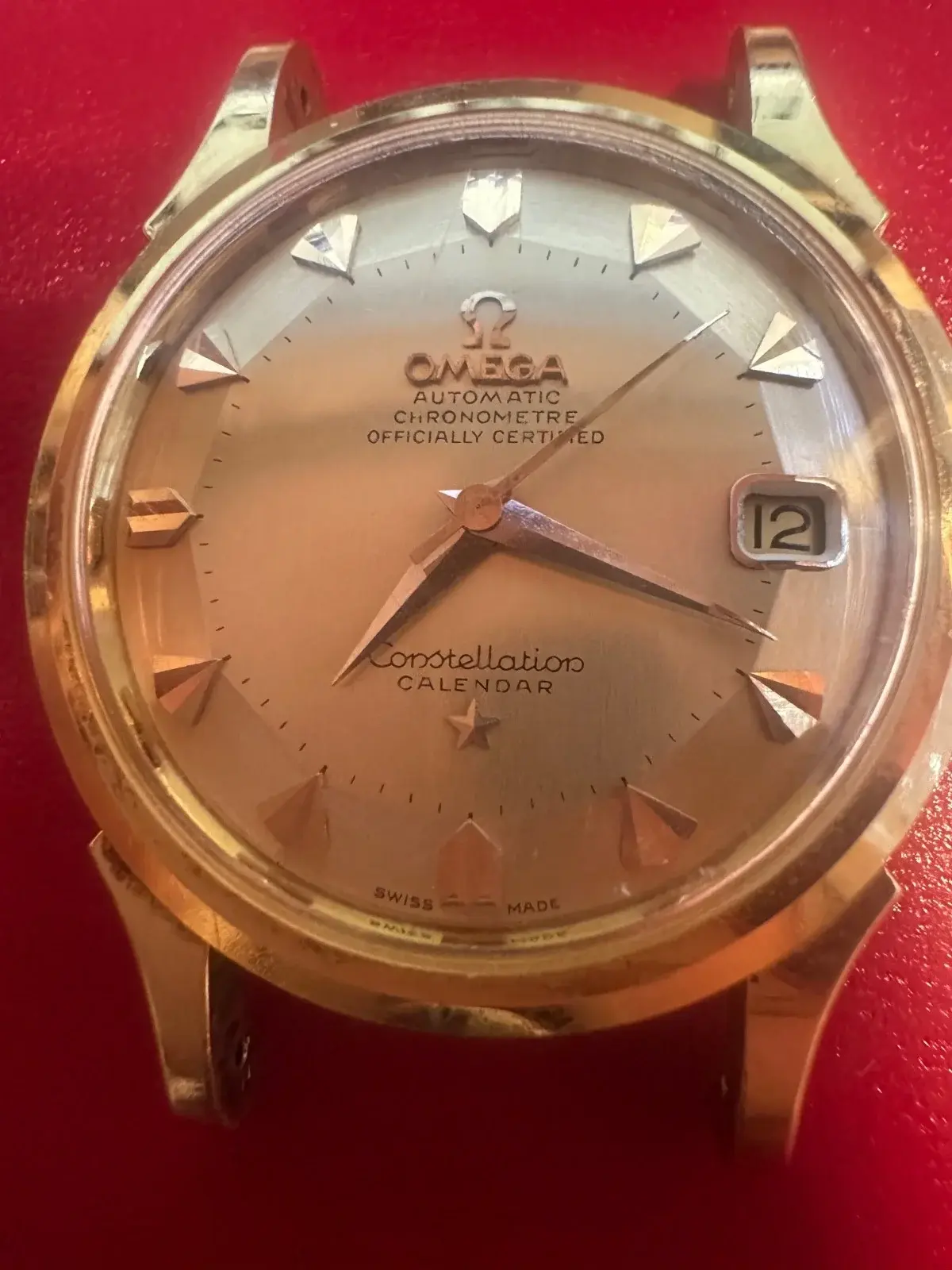 Posts 6,323 Likes 9,771 Peemacgee ·Oct 10, 2025·Purrrr-veyor of luxury cat box loungers As @dsio says, OM appears on Constellation dials in the late 60s. Gold (deluxe) dials tend to have a slight vertical graining or (in pie pans) tend to be very shiny. The watch you posted looks like a ‘standard’ 18k 2943 as opposed to the 2954 deluxe with a gold dial.
