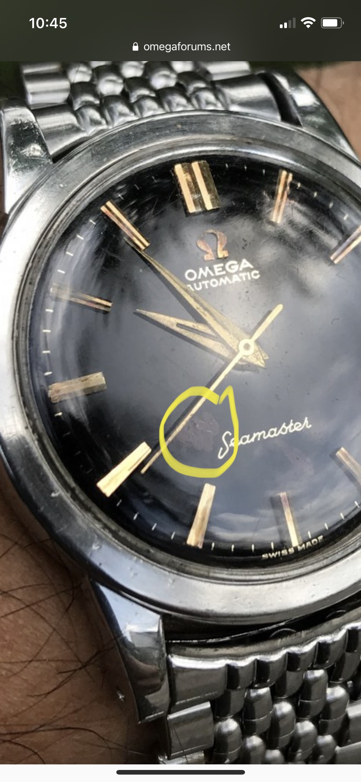I assume that’s the shit in question. Which looks like it’s on the dial and not reflection/crystal related. I can say this with certainty: if that’s the original dial, those are not the original hands.
