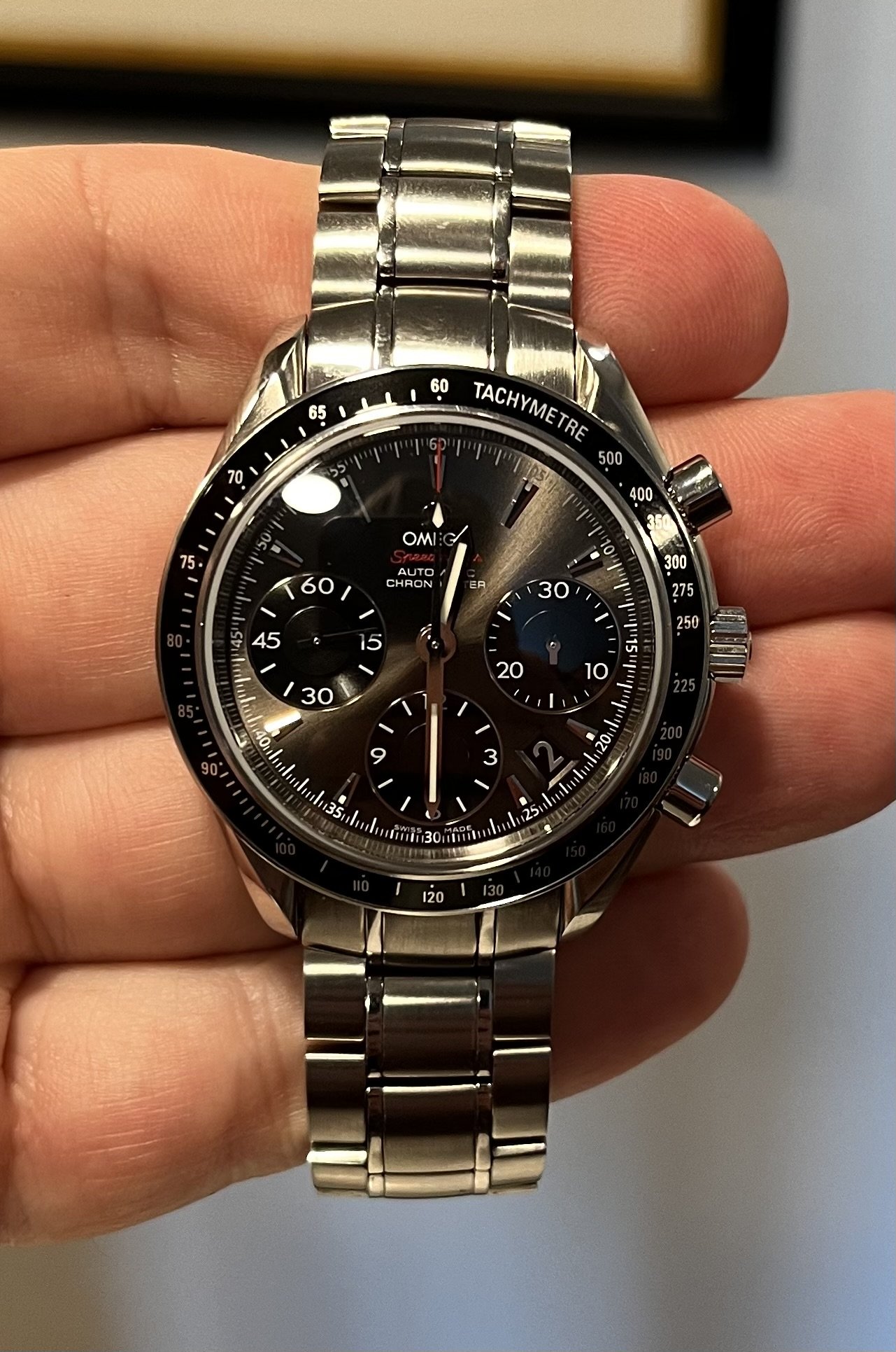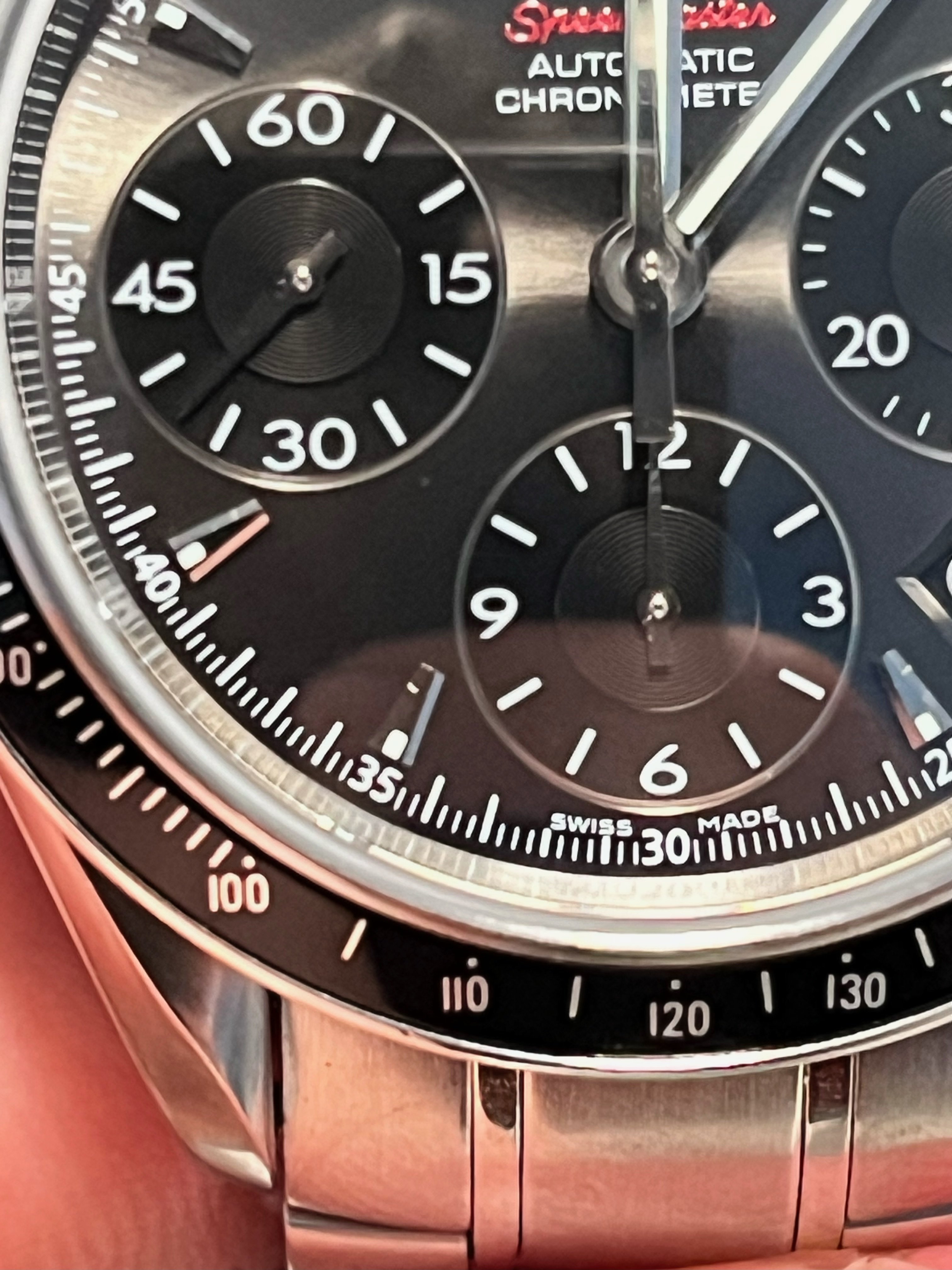 ·Hello! I just purchased a Speedmaster Date for my son for his 21st birthday. It's a reference number 323.30.40.40.06.001. I purchased the watch from a reputable dealer in Japan (Watchnian). I was told the watch was serviced last month prior to them listing it for sale and it essentially looks brand new. When I look at the dial with a loupe, though, each of the hour indices has a hairline scratch running across it, all of which appear to be an equal distance up from the tip. It seems as if they may have occurred when the indices were placed on the dial since they're all uniform.