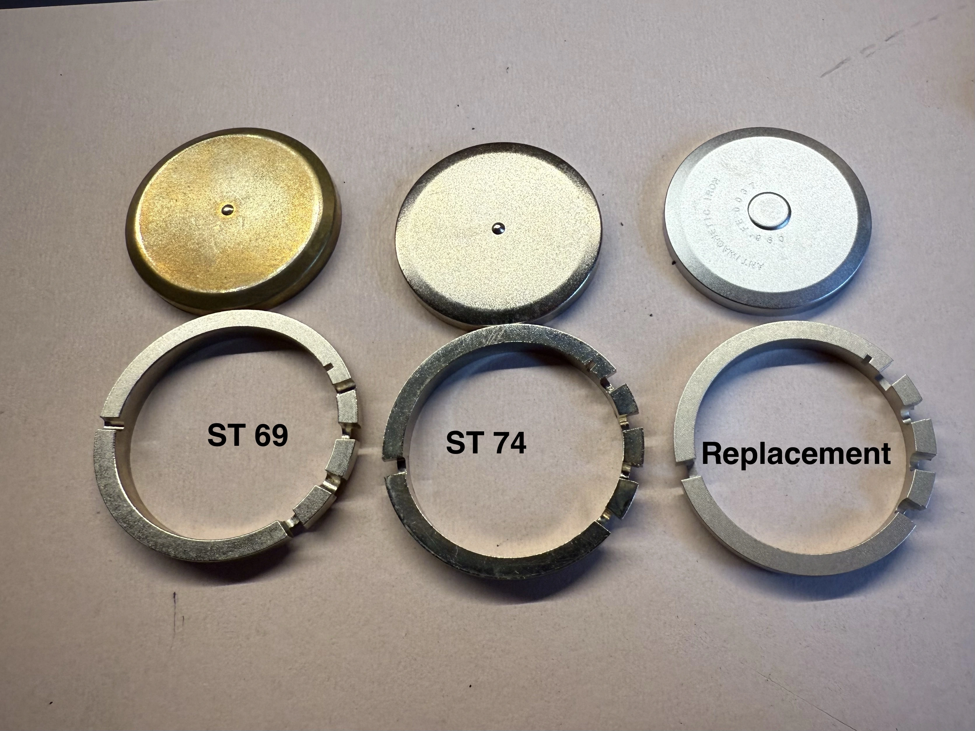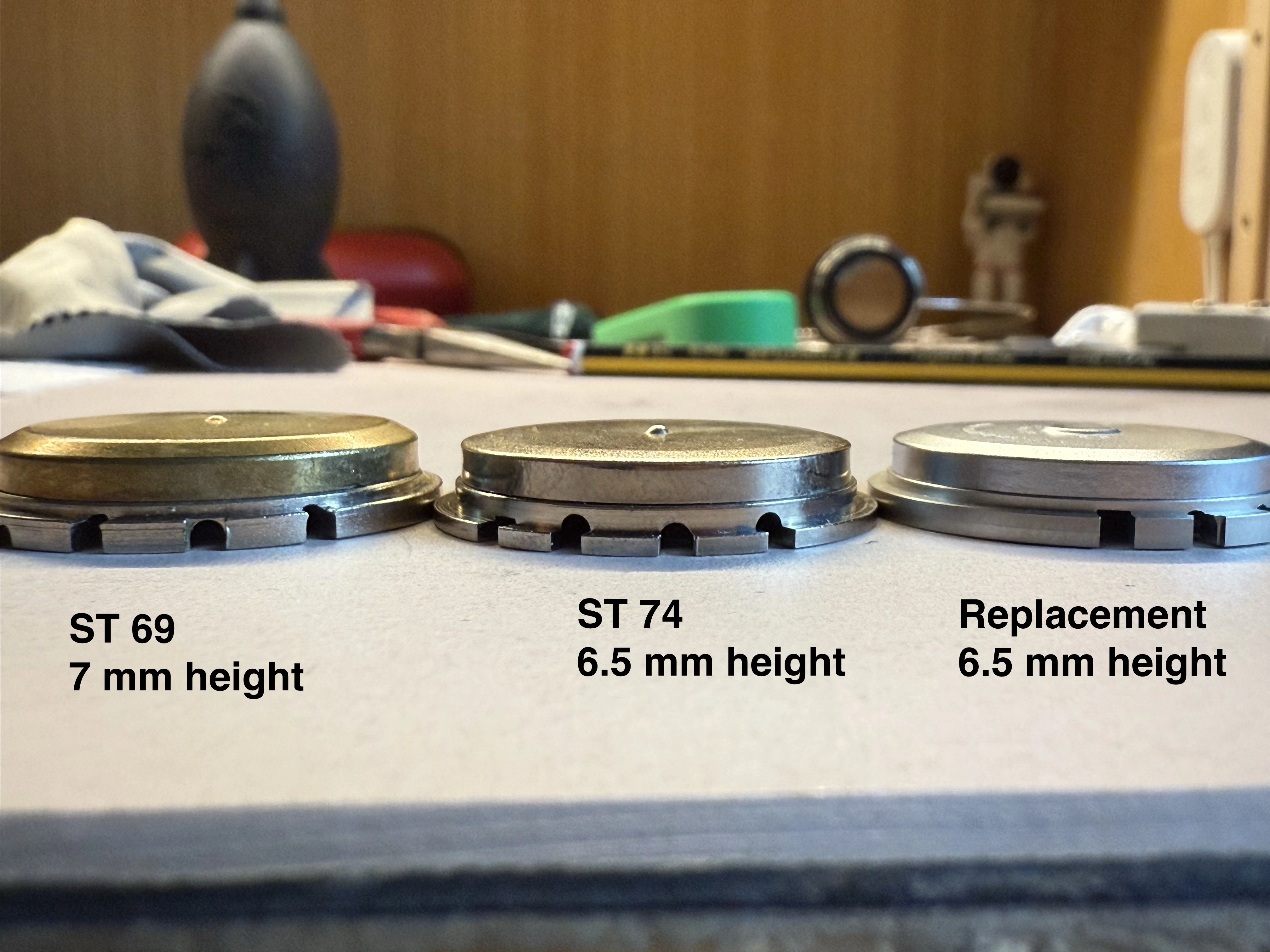 i've got a 145.022-74 ST back from Service at Omega and they changed the movement holder ring and the dust cap to a complete new set. But i can't figure out why. So i compared the set with the old one (it came together with all the other changed parts in a bag) AND with a movement holder ring and dust cap, from my 145.022-69 ST. The holder ring from the '74 Speedy ist different to the '69 and to the replacement ring in height, but the '69 ring got different slots compared to the others. The ring/dust cap from the replacement and the '74 got the same height. Approx. 6.5mm. The set from the '69 is approx 7mm. Here are some Pictures. Sorry, a little bit confusing, but maybe someone can tell me, why they replaced the ring and cap in my '74 and why the old ring form the '74 got a different milled step, compared to the older and newer ring. 😀