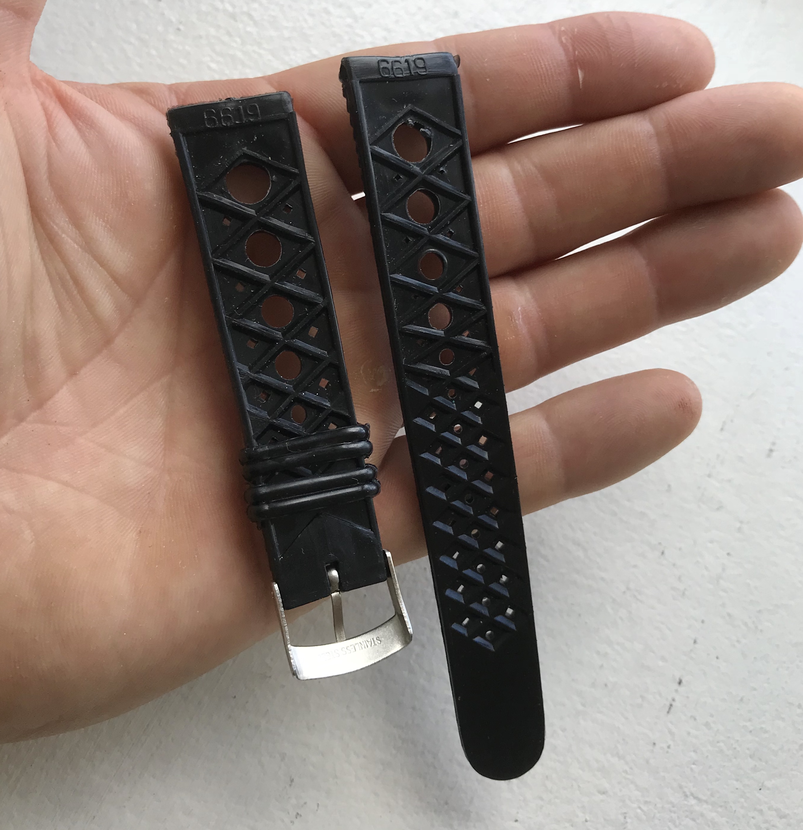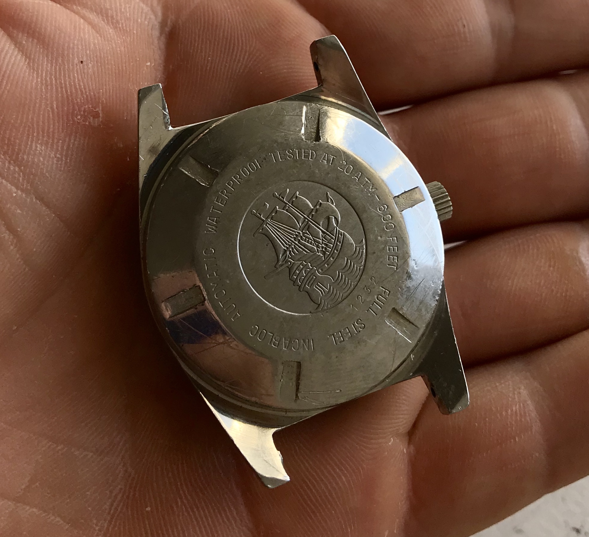 36mm full steel case with screwed caseback, 19mm lugs. Case has wear but nothing deeper, only hairlines and a few scratches.