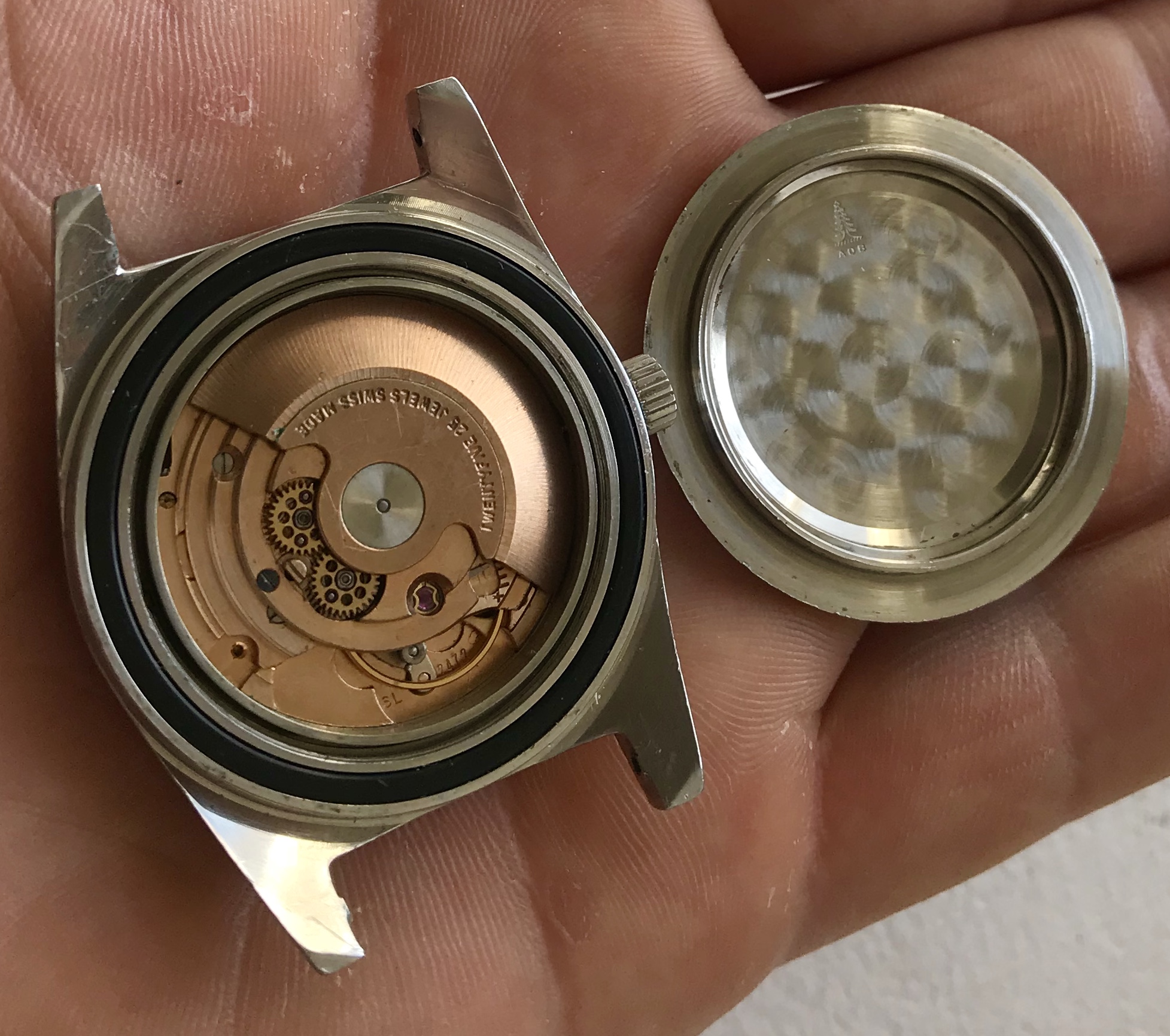 ETA 2472 movement which is running strong and keeping time, changing date as it should.