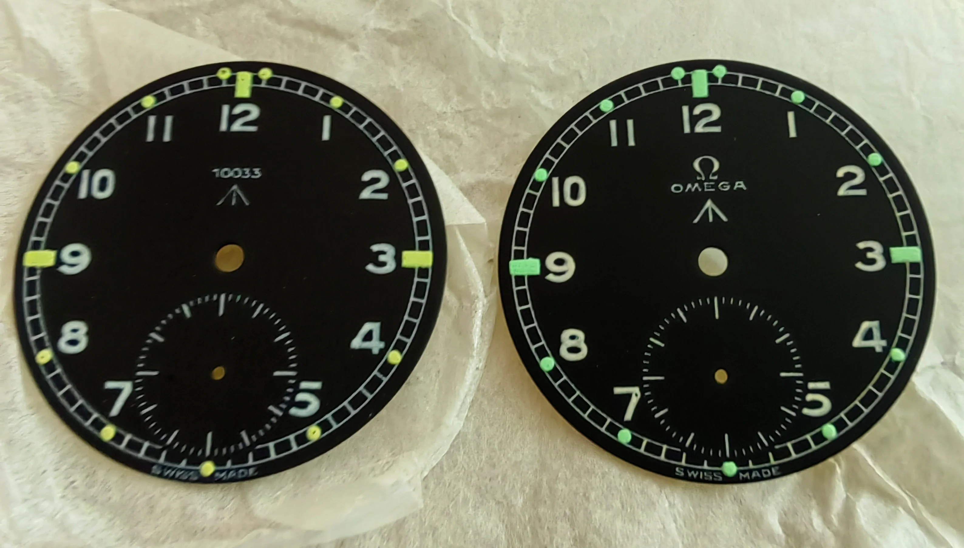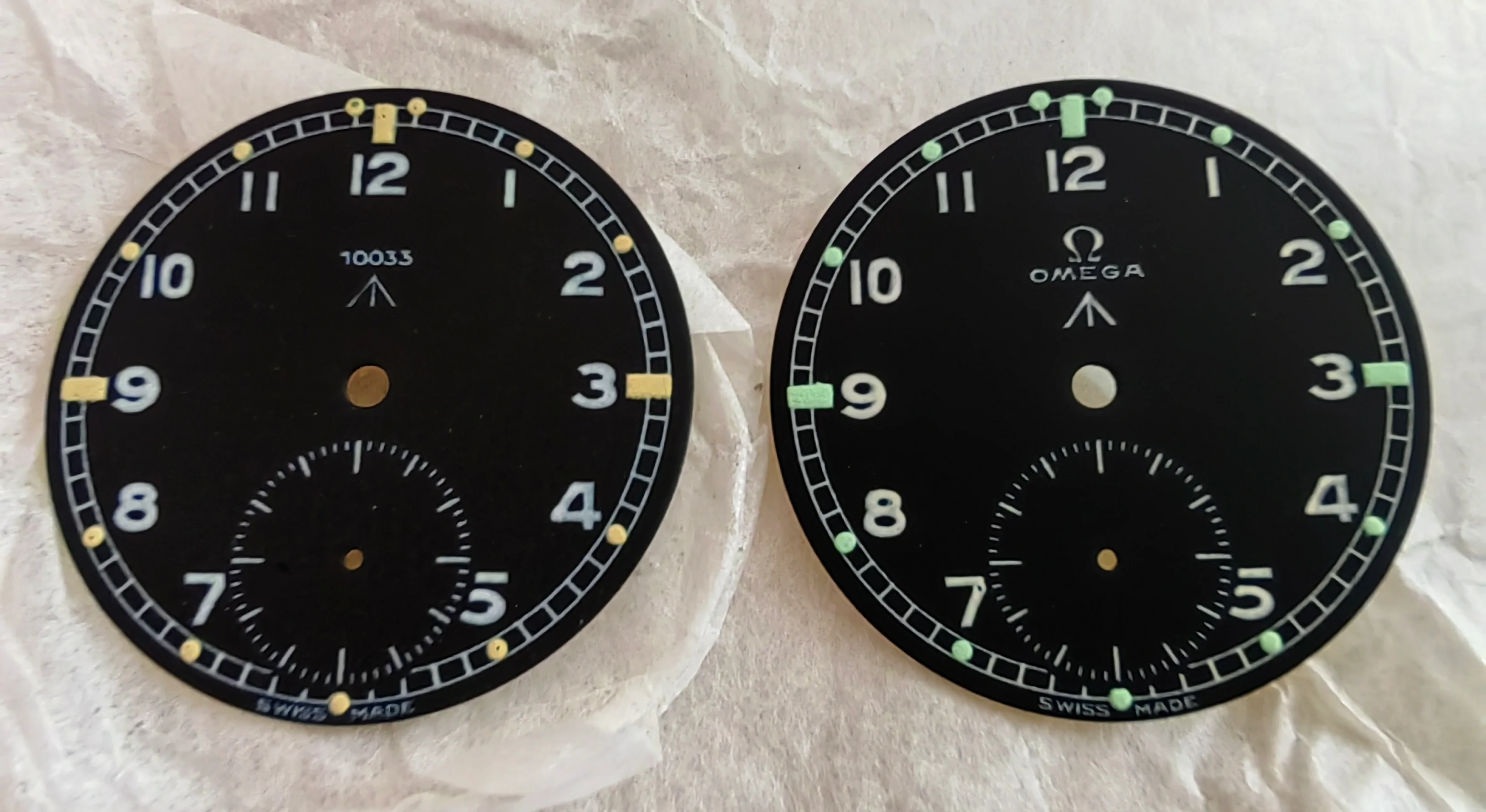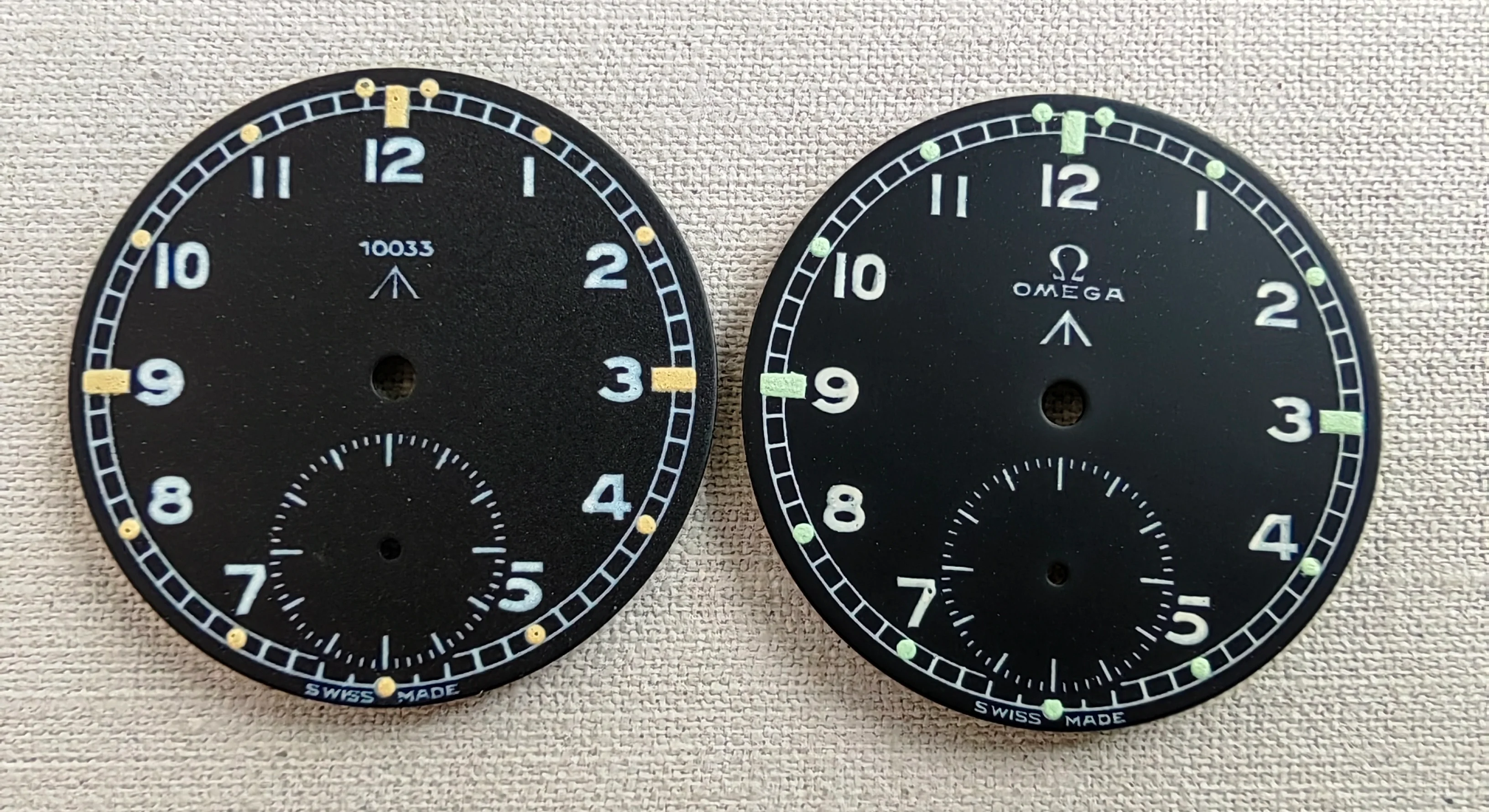 ·My Omega MoD print on the right, original Omega print on the left. It is the same print as your 2nd dial, the only difference being mine has a sunken sub second as it is (fairly unusually) re-printed on the original dial, yours doesn't appear to have a sunken sub dial, which is the norm for those dials.