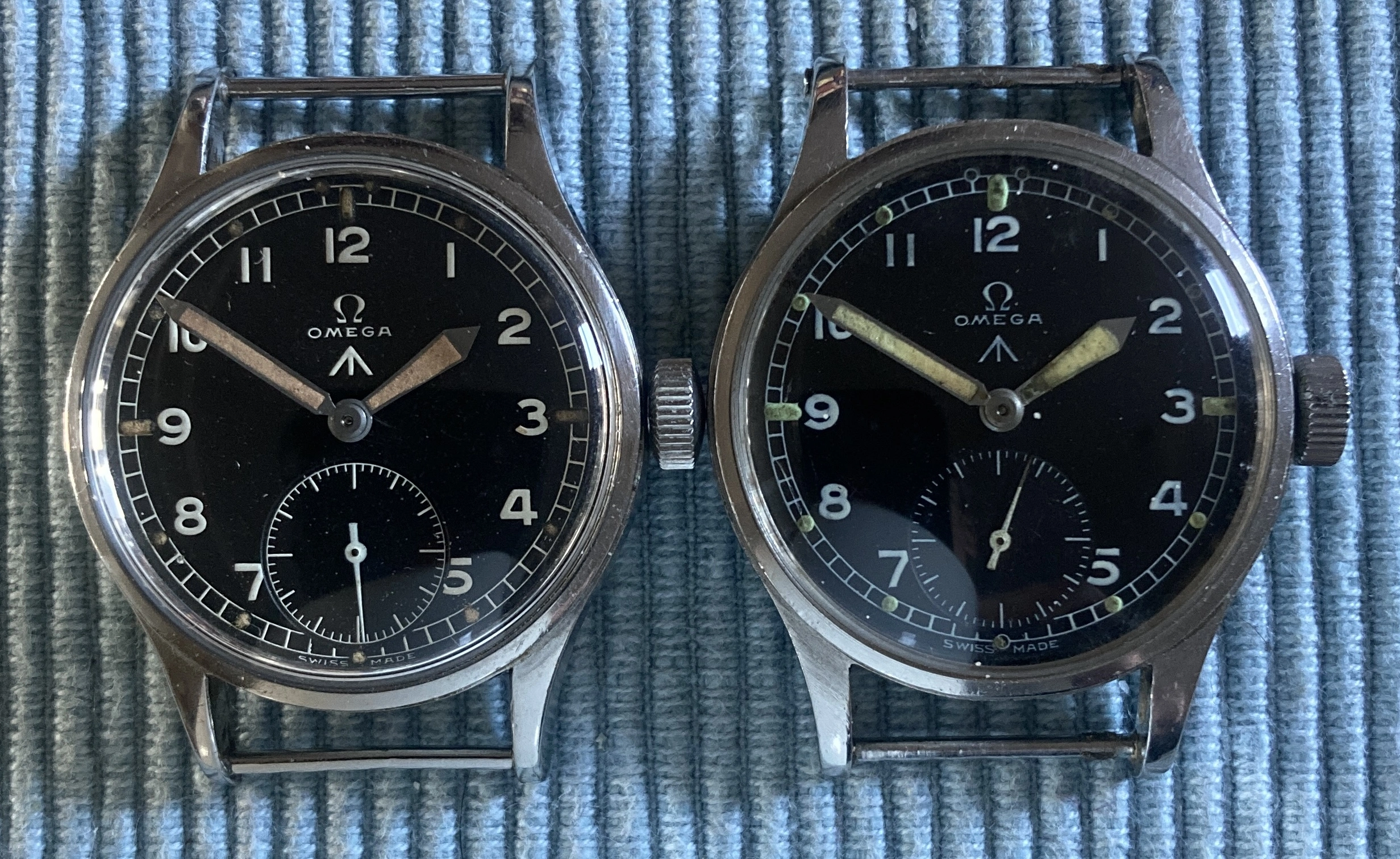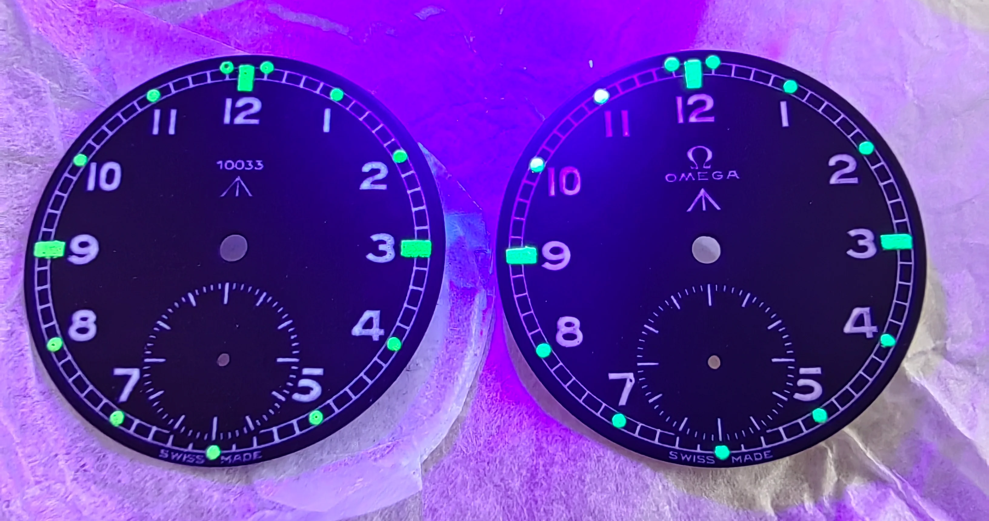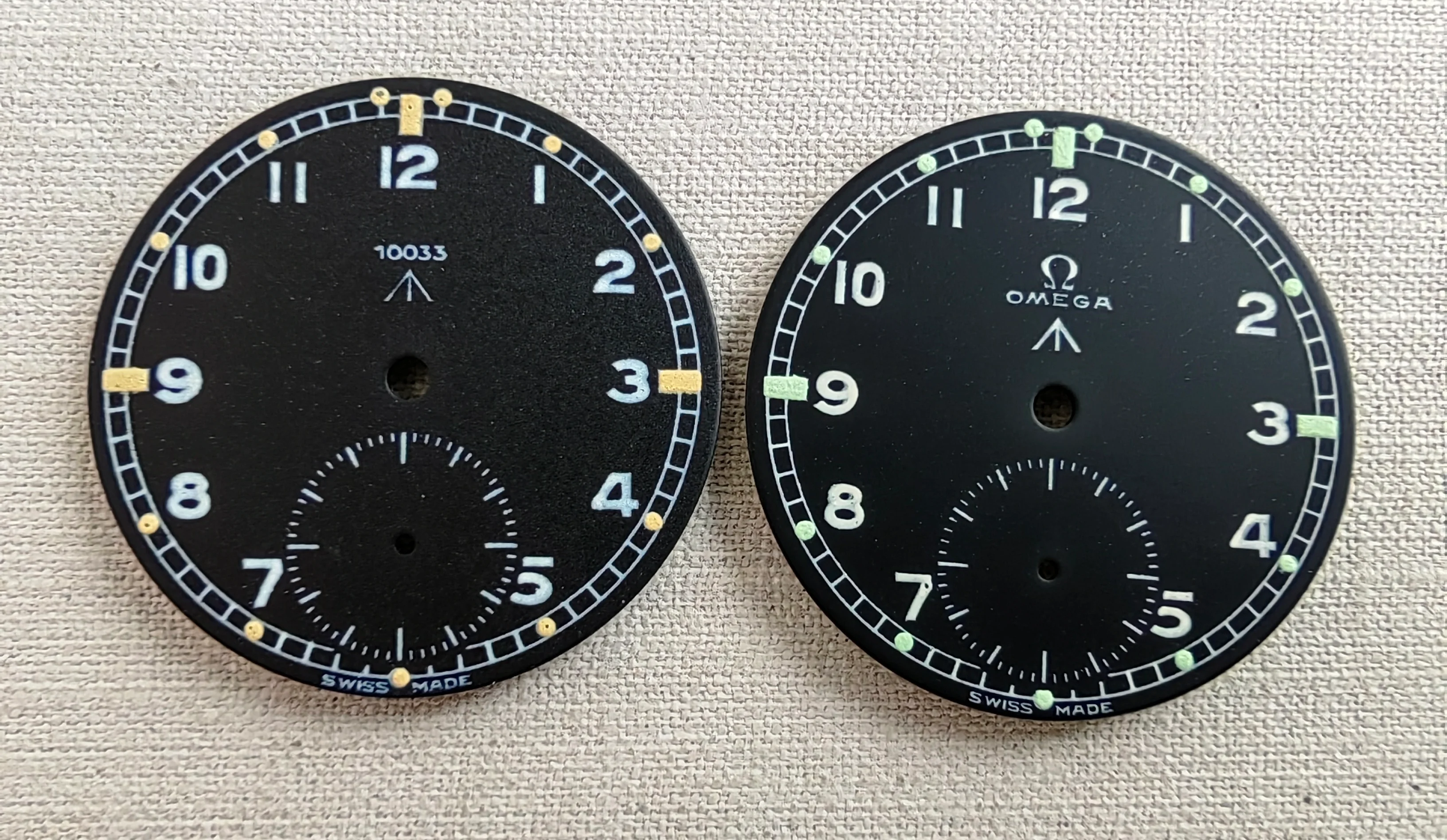 ·My Omega MoD print on the right, original Omega print on the left. It is the same print as your 2nd dial, the only difference being mine has a sunken sub second as it is (fairly unusually) re-printed on the original dial, yours doesn't appear to have a sunken sub dial, which is the norm for those dials.