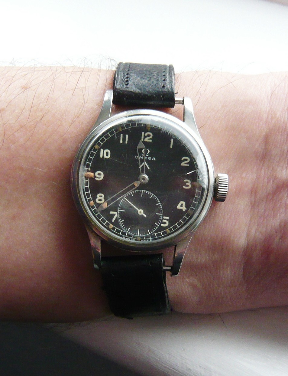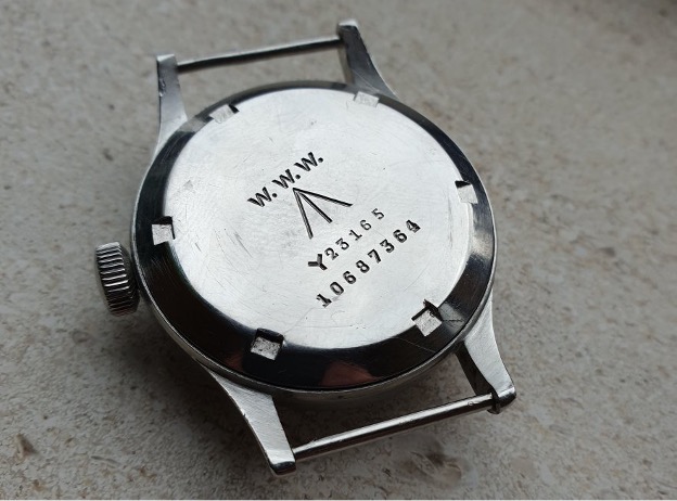 "The stainless steel case and case back are clean with very little in the way of marks/damage and have not been refinished/polished. The crystal is in excellent condition. The dial is a 'VB' dial, so called as instead of an Omega signature it bears the Ministry of Defence stores code (or 'VB' code) for Omega - 10033. These were fitted to Omega WWW watches when they were refurbished post war and use tritium luminous compound instead of the highly radioactive radium used when the watches were originally issued."